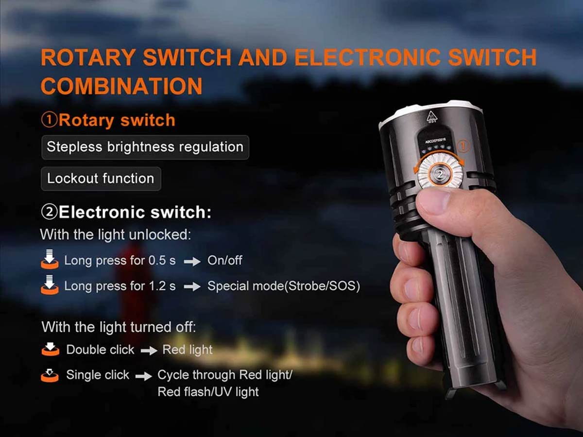 Did we mention this has stepless dimming thanks to the convenient rotary switch? Just spin the dial to find the exact brightness level required anywhere, from a trail hike to an emergency rescue operation. Red flashing, SOS, and strobe modes are at your disposal, providing an array of options for emergency signaling and self-defense outdoors.