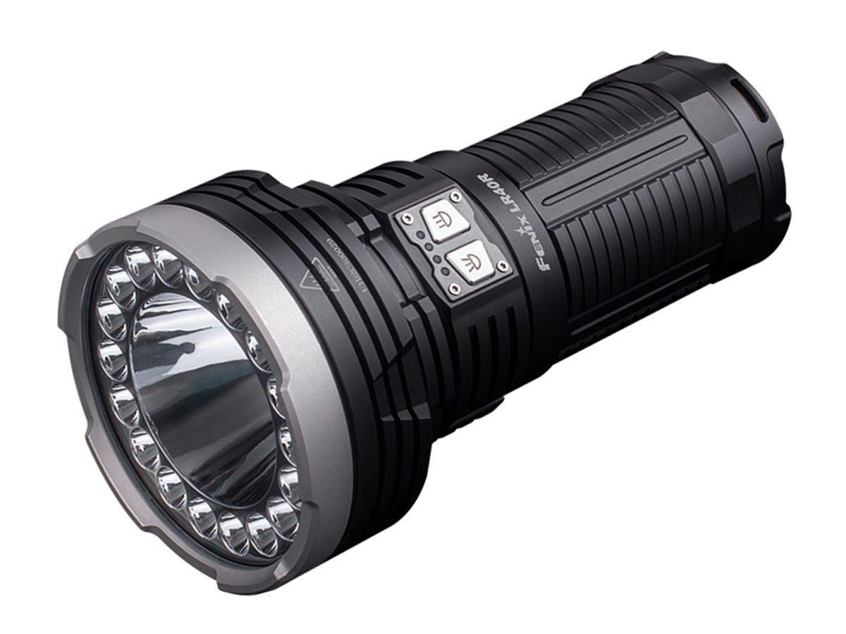 The Fenix LR40R Searchlight is a compact, high-performance search and floodlight combined into one. This palm-sized torch can put out an astonishing 12,000 lumen beam that can shine up to 773 meters away! With such tremendous outputs and combined functions, it can be used for search and rescue, long distance spotting, cave exploring, or even as emergency lighting for drivers. The floodlight outputs provide a broad and even beam for close to mid range lighting needs, while the spotlight has a beam that can reach far into the night at long distances, independently toggled by the simple two button interface. The spot and floodlight can also be used simultaneously should you need a combination beam. The LR40R is powered by a rechargeable, 12000mAh capacity Li-ion battery pack that can last up to 92 hours. That is four days of use without a recharge! Should your battery pack use the last of its power, you can also use any number of one to four 18650 batteries in case of emergency. See the downloadable user manual for specific battery recommendations.
