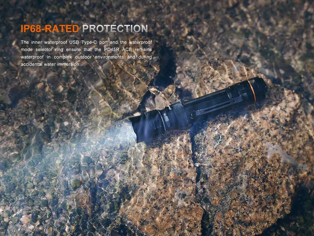 The PD45R ACE has an ace up its sleeve with its best-in-class included 21700 battery that boasts an ultra-high capacity of 6,000mAh. As a result, this flashlight offers ranging from 2.3 hours on Turbo to 57 hours on the Eco brightness level. When you need to power up, the PD45R ACE can be recharged in just 3 hours via the in-body USB-C port. The paired battery indicator will keep you apprised of your battery status at a glance. Because the charge port and indicator are secured beneath the light head, the light earns an IP68 rating that will weather any storm and can be used in every kind of environment. This makes it a great handheld light for all outdoor or tactical applications.