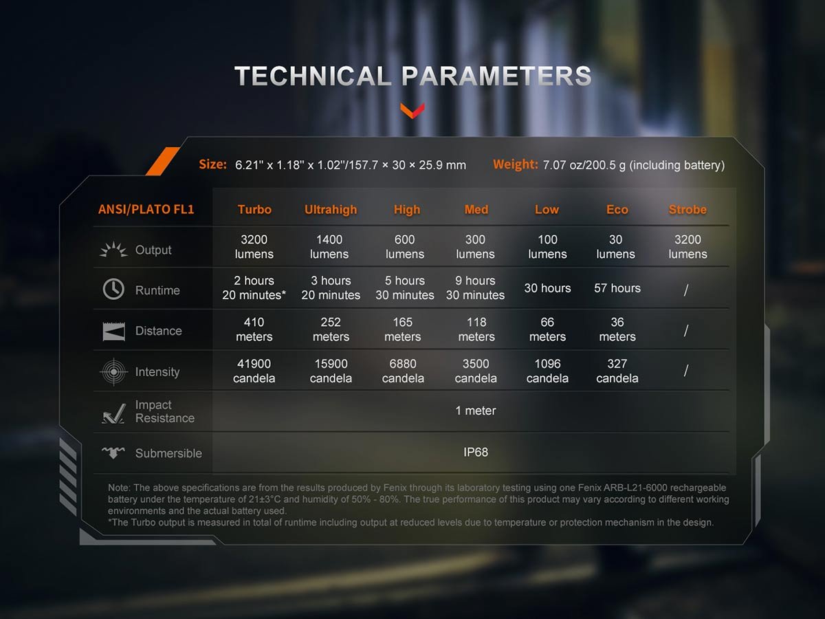 All data was generated in a Fenix lab. Differences may happen based on usage and conditions.*The Turbo output is measured in total runtime including output at reduced levels due to temperature or protection mechanism in the design.