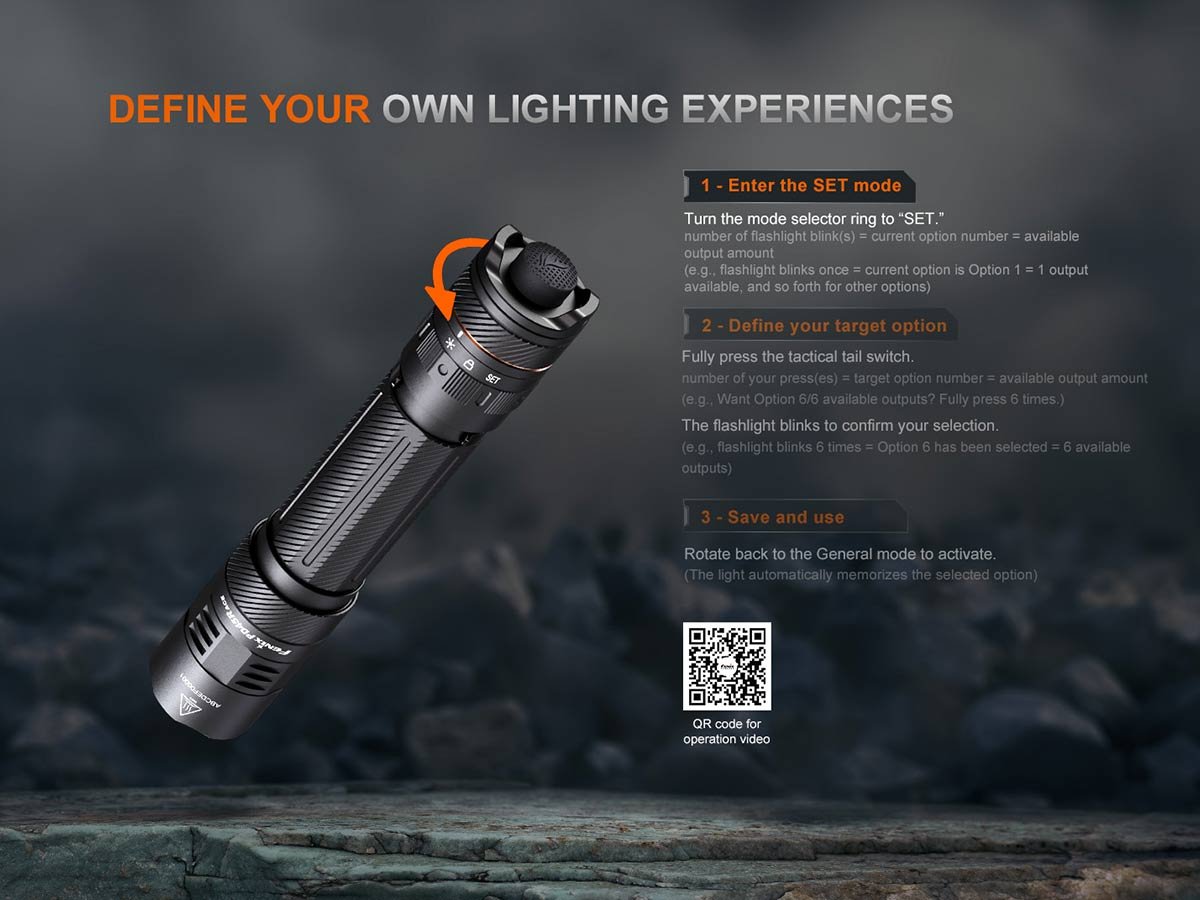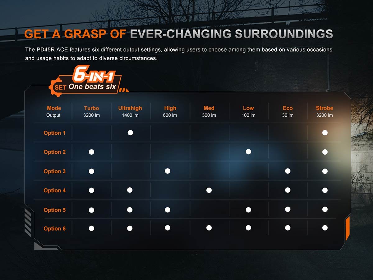 For a flashlight with refined, fast-access controls and ultra-high performance, look no further than the Fenix PD45R ACE! Equipped with a next-level Luminus SFT70-Gen2 LED package, the PD45R ACE boasts a max output of 3,200 lumens reaching over 1,300 feet, with peripheral spill to grant you total situational awareness. This model is also upgraded to a one-stop tactical illumination command center with the addition of the ACE (Advanced Command Edition) control system. Comprised of an intuitive multi-stage tail switch and mode selector ring, this setup lets you access any output in moments to adjust to the full range of scenarios encountered on patrol or during outdoor adventures. The feature that really sets the PD45R ACE apart from the rest, however, is its customizable outputs. Simply by activating the SET mode with the selector ring, you will be able to choose your favorite output programming from 6 preset patterns to give you the fastest possible access to the settings you need most!