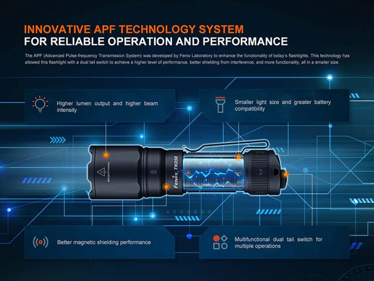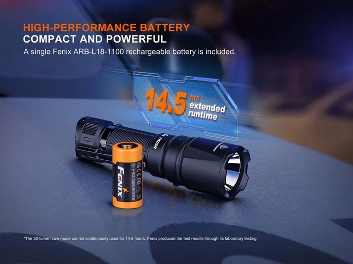 The TK05R is powered by an 18350 battery so it can run for up to 14.5 hours to last the whole mission. This light also includes a USB-C port so you can recharge from outlets, power banks, and more, whether you're home or out in the field. To maintain stable performance during long periods of use, the intelligent overheat protection manages the internal temperature to protect the light and its battery. This light is also compatible with the Fenix ARB-L18-1100, ARB-L18-1100P, ARB-L16-800UP, or ARB-L16-700UP so you can immediately power it with spares.