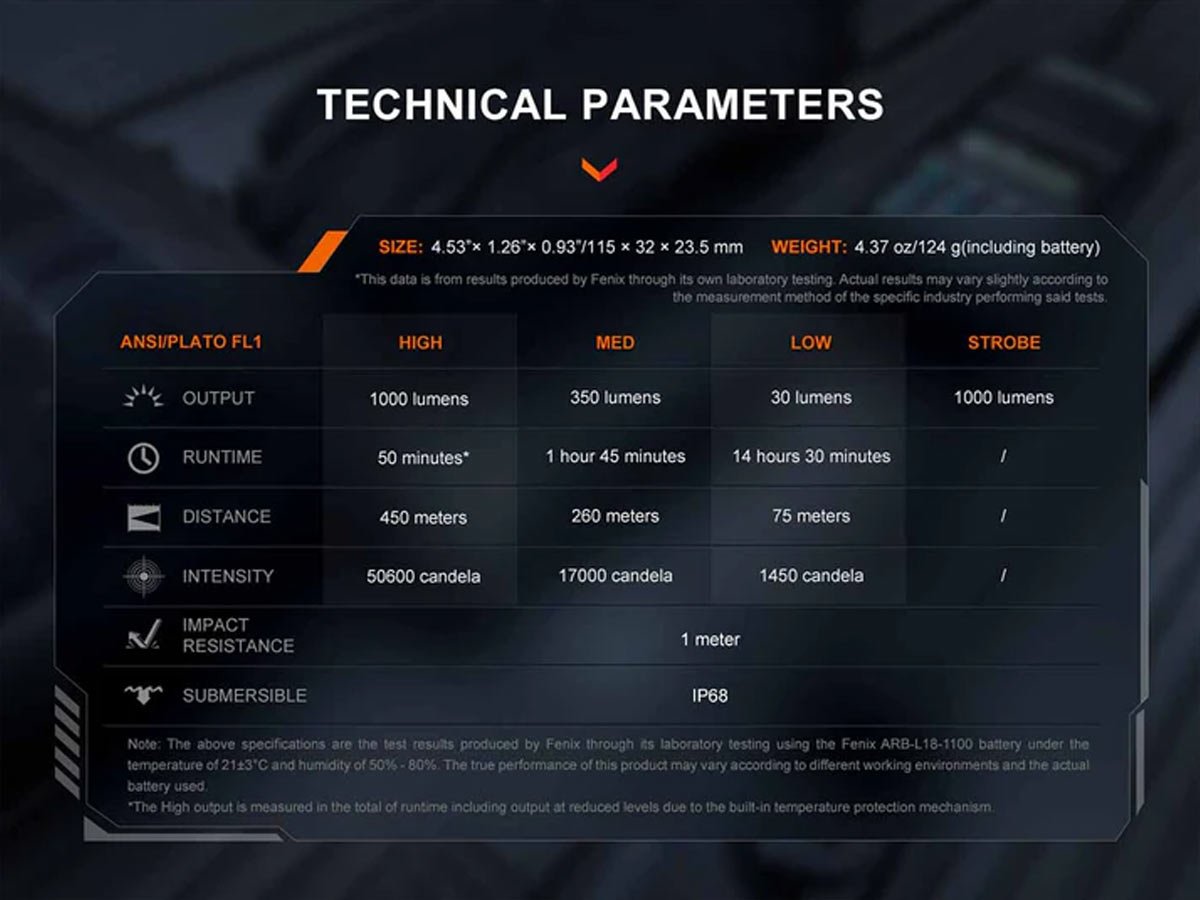 - Max output of 1000 lumens in a 450m beam - visual control of the whole tactical field!
