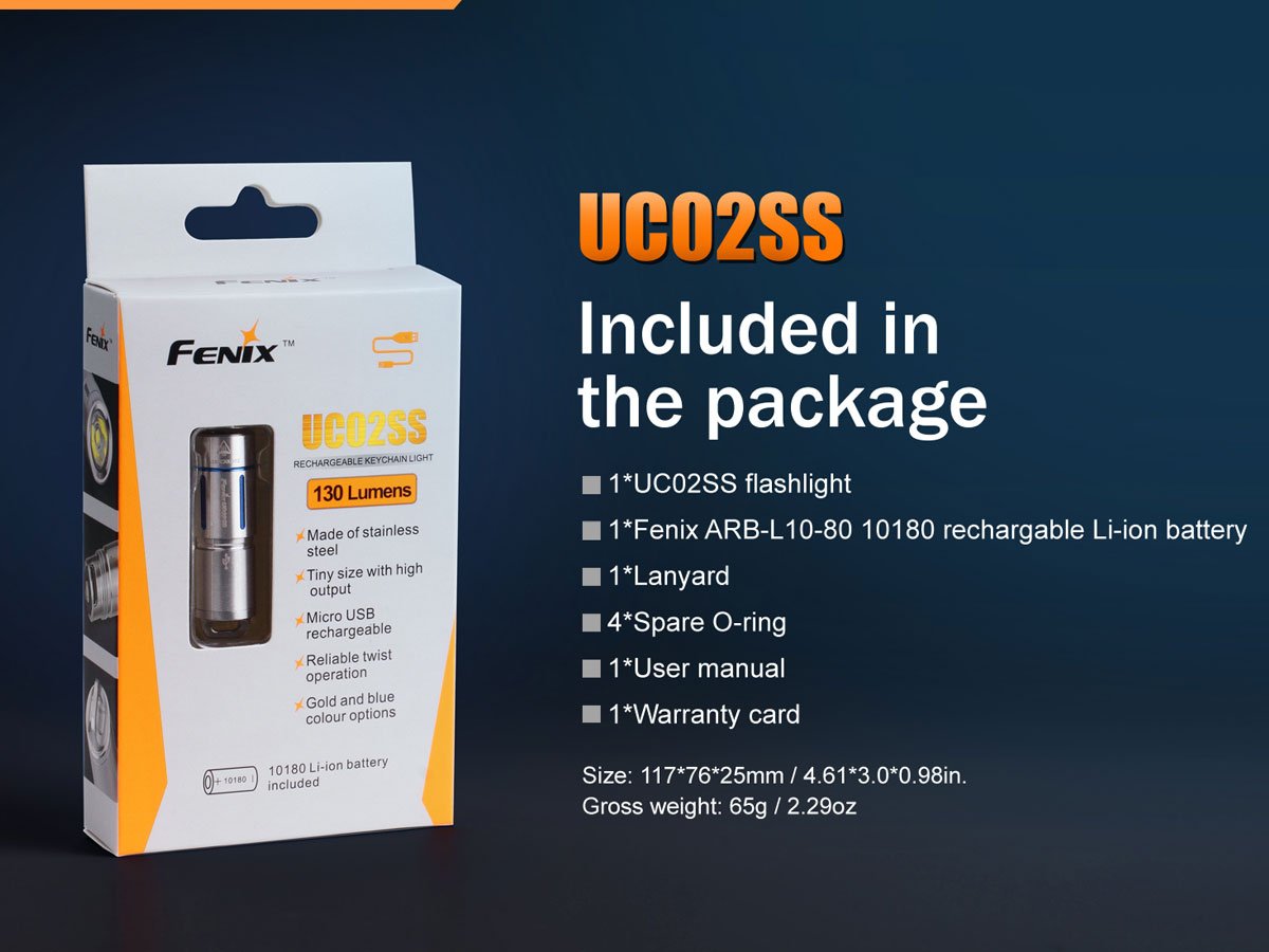 Pint-sized but powerful, the Fenix UC02SS Rechargeable LED Keylight is one of the handiest, most effective keylights on the market today! Barely bigger than a tube of lip balm and complete with a convenient ring-shaped tailcap, this tiny torch is easy to carry and is the perfect addition to your key ring. Despite its size, this keylight is capable of producing an impressive 130 Lumens of brightness that can shine further than 150 feet, perfect for lighting your path to and from your car! The UC02SS also features a dimmer 10 Lumen output for reading at night or for other instances where full power isn't necessary.