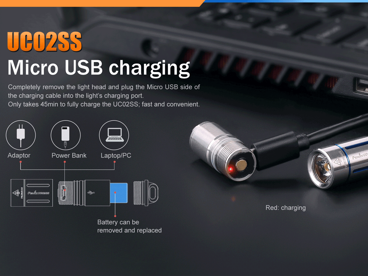 The UC02SS employs an easy-to-use twist ON/OFF interface, tightening the light's head to access its two outputs and loosening it to turn it light off. The light can be easily operated with just one hand, leaving a hand free to open the door or to carry groceries. The UC02SS is powered by a potent 10180 Lithium Ion battery (included) which can be recharged while still inside the light thanks to its convenient micro-USB charging port (charging cable sold separately). Thanks to its powerful battery, the keylight is able to operate on its max output for nearly 30 minutes and can last on its lower output for just short of 4 hours, providing long-lasting light for when you need it most.