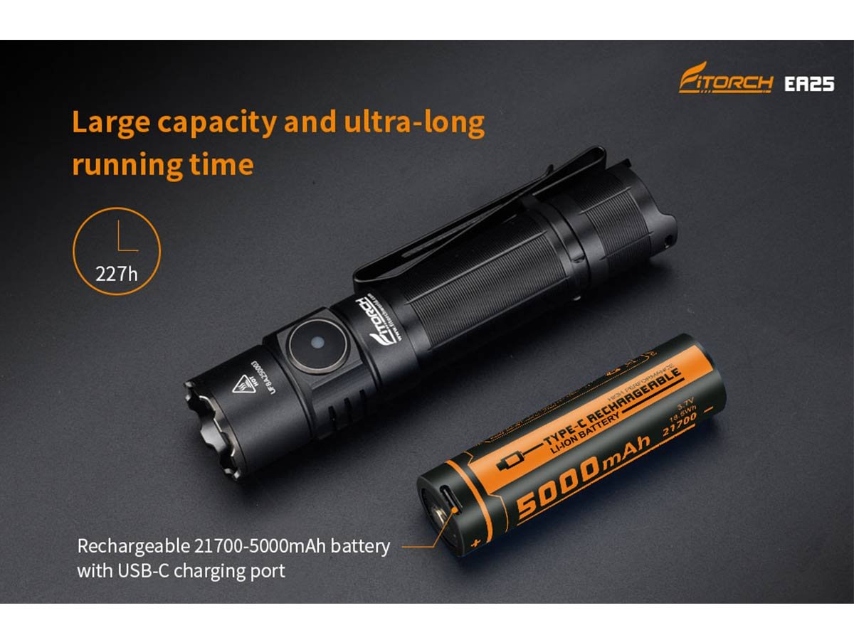 The EA25 runs on a 5,000mAh 21700 battery, which has the capacity to support high runtimes best. As a result, eco mode runs for a total of 227 hours, and other brightness level runtimes are adequately supported. This light is fully rechargeable via USB-C, offering a rapid, reliable charge that gets you right back outdoors.