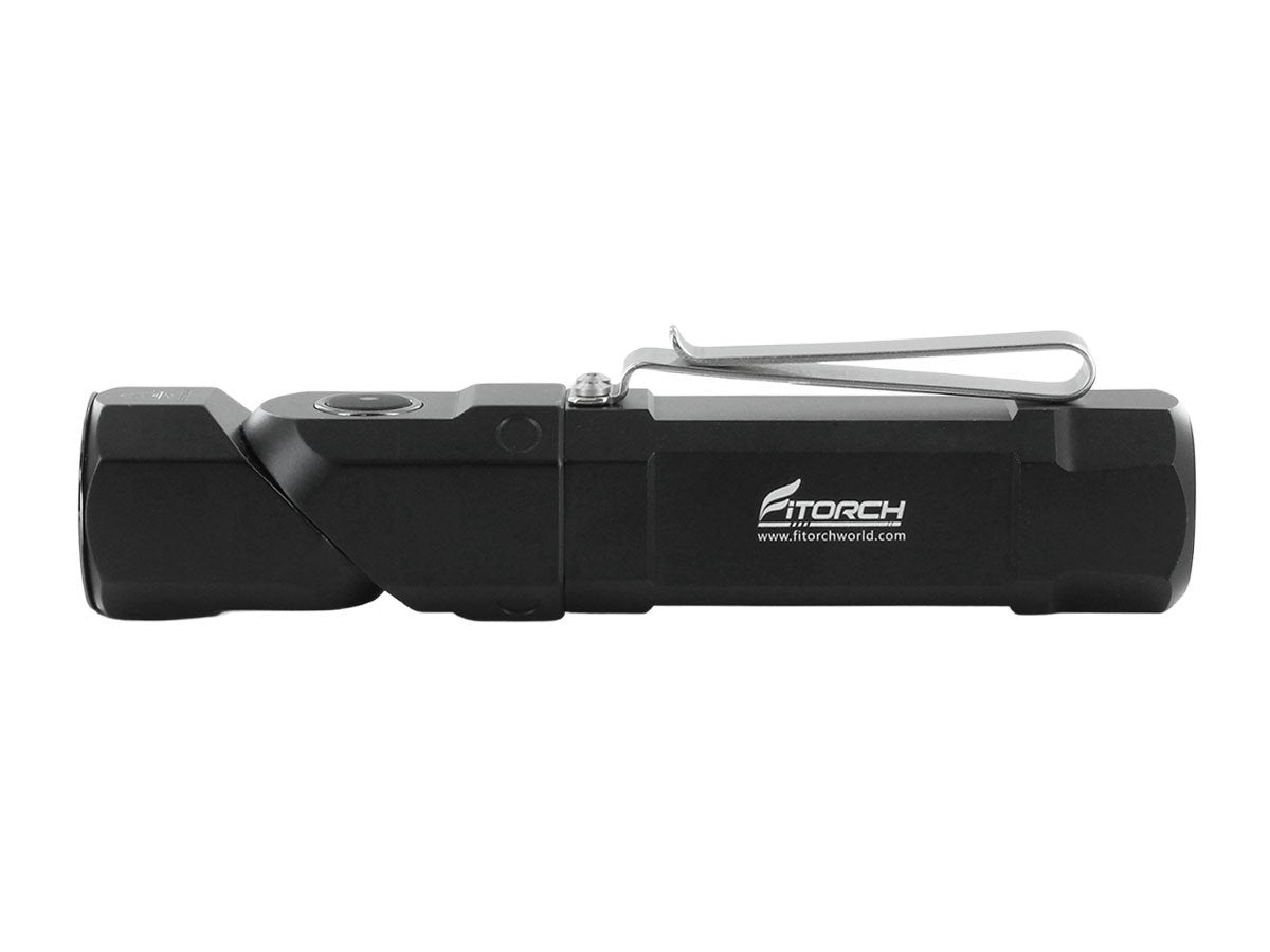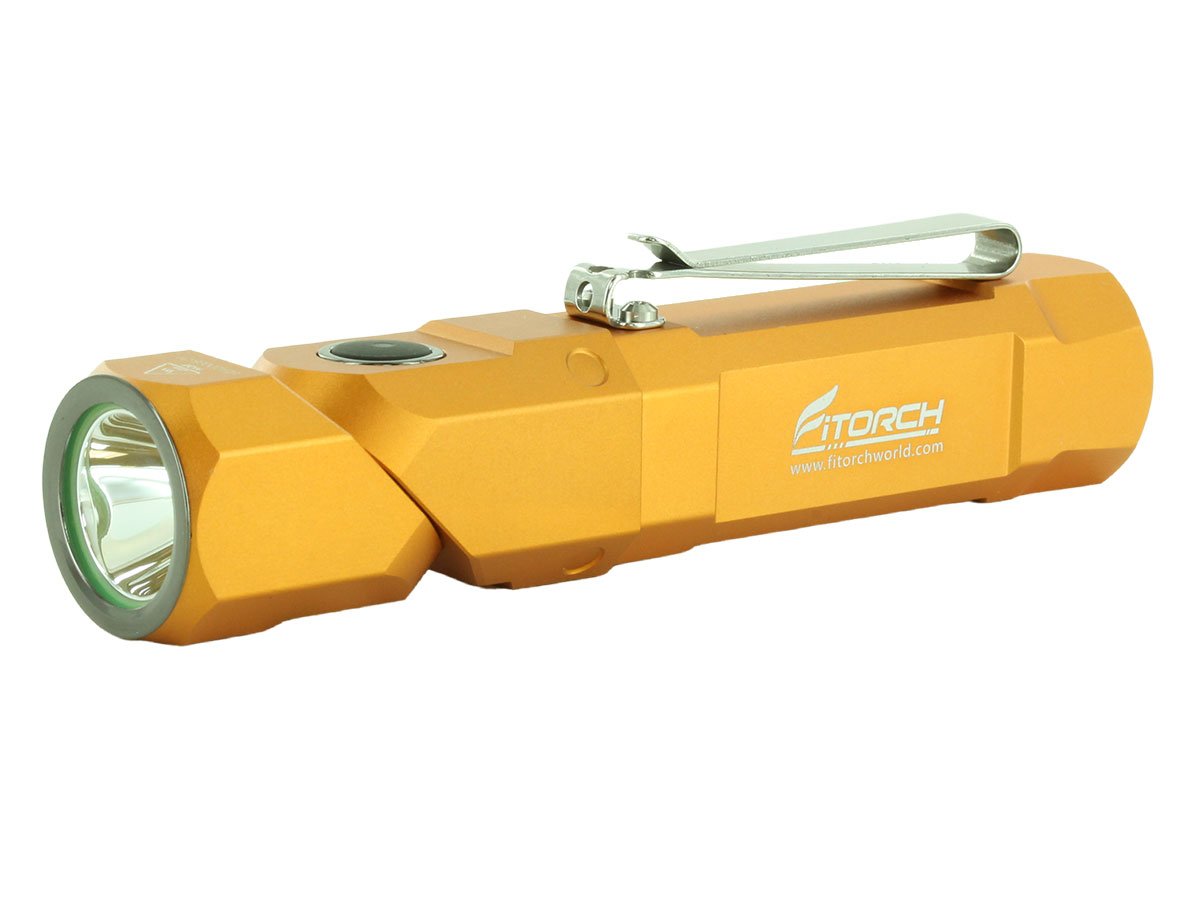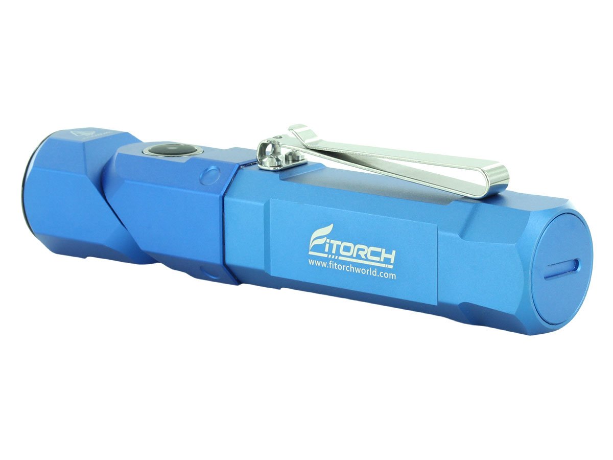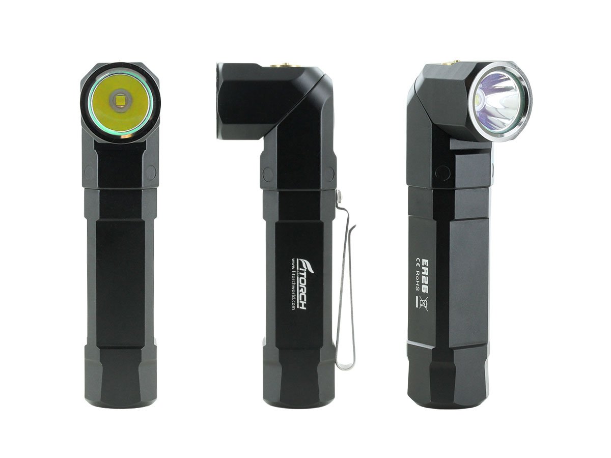 The Fitorch ER26 is a powerful LED light that features bright output as well as an adjustable angle head. Capable of light levels up to 1380 lumens, this light is perfect for indoor or outdoor use and makes an excellent everyday carry light. The adjustable head of the ER26 bends to a 90 degree angle creating a forward facing angle light that can be clipped to clothing for hands free illumination. Combined with multiple light levels and a simple single button interface, the ER26 is an excellent light for all purposes.