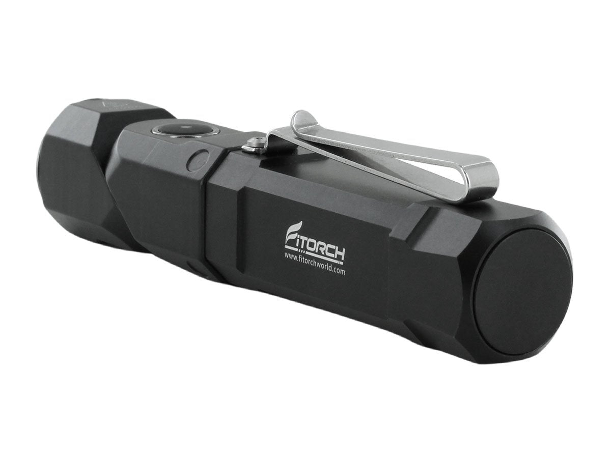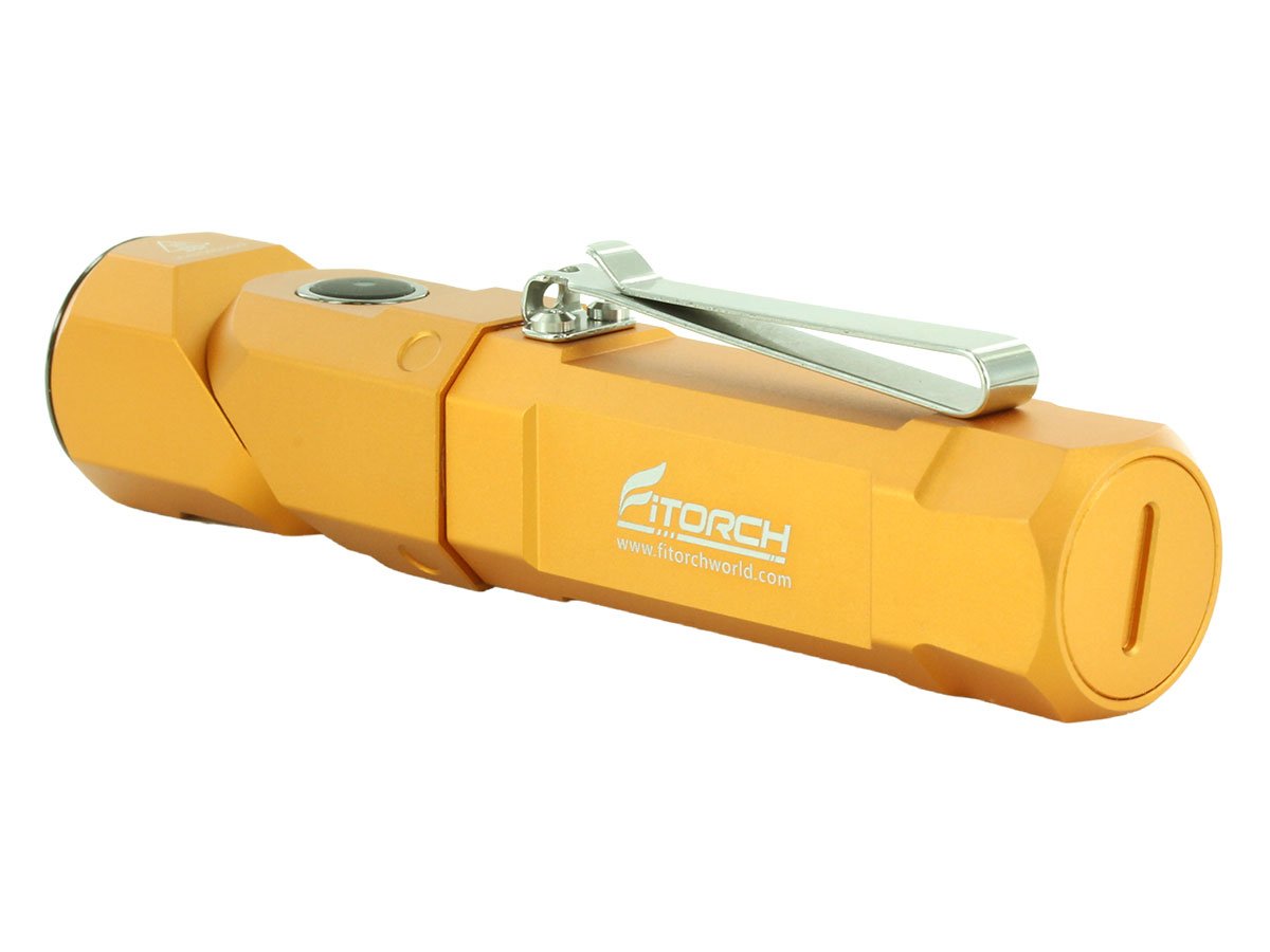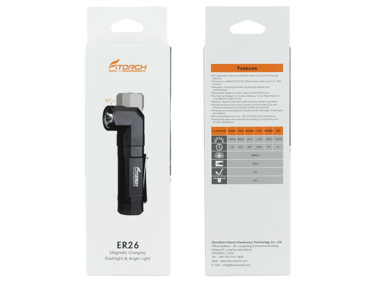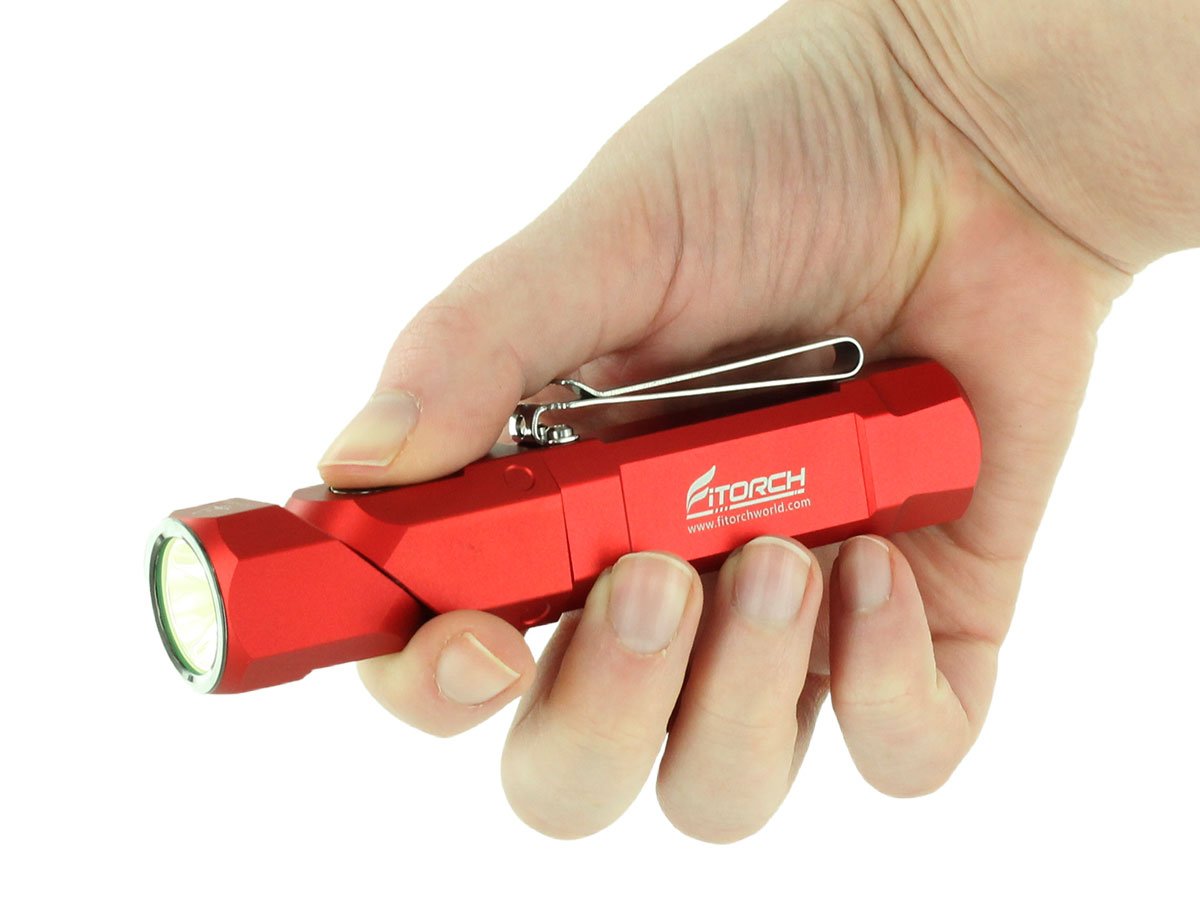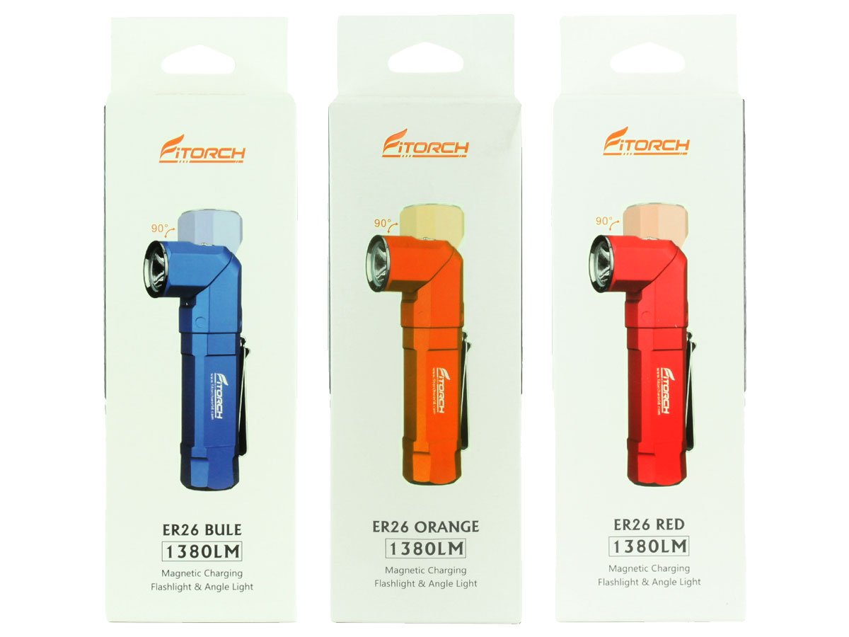 The Fitorch ER26 is a powerful LED light that features bright output as well as an adjustable angle head. Capable of light levels up to 1380 lumens, this light is perfect for indoor or outdoor use and makes an excellent everyday carry light. The adjustable head of the ER26 bends to a 90 degree angle creating a forward facing angle light that can be clipped to clothing for hands free illumination. Combined with multiple light levels and a simple single button interface, the ER26 is an excellent light for all purposes.