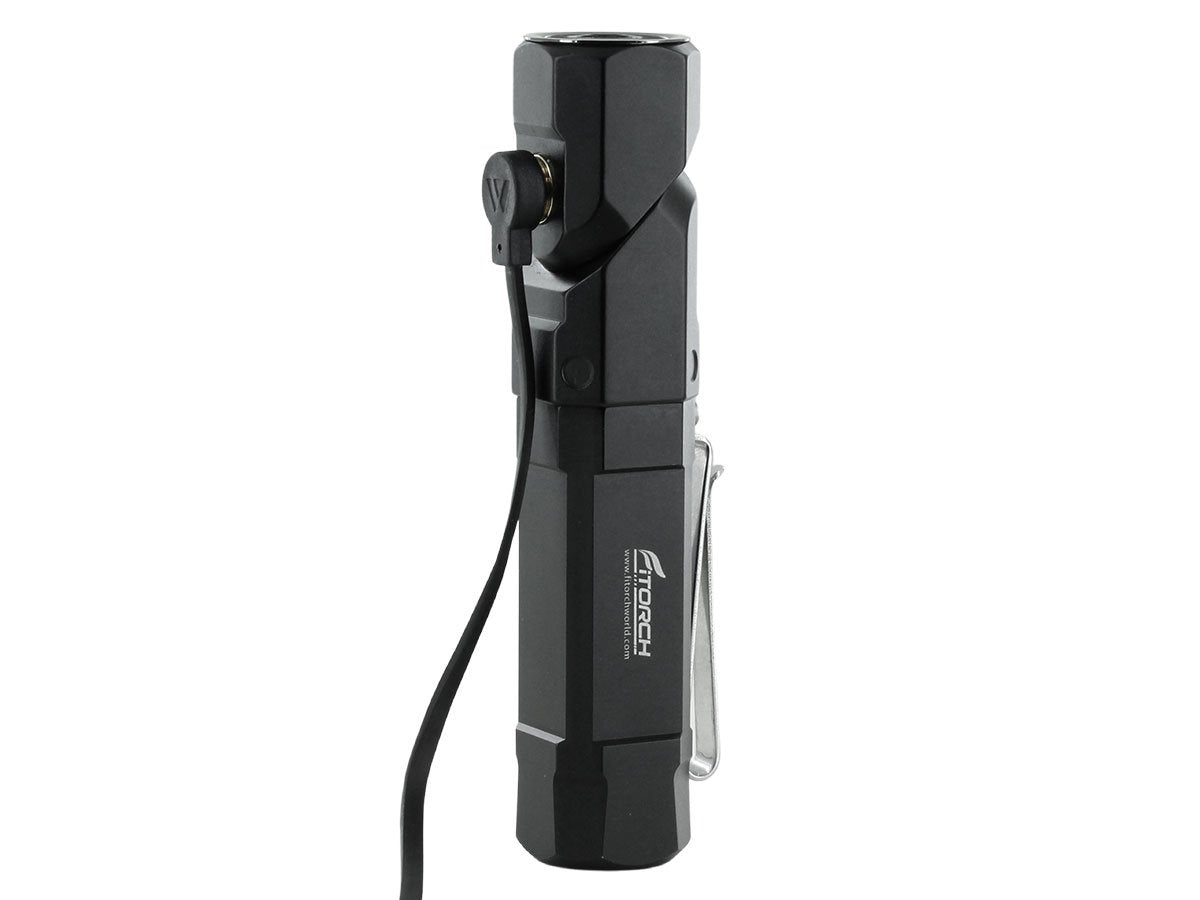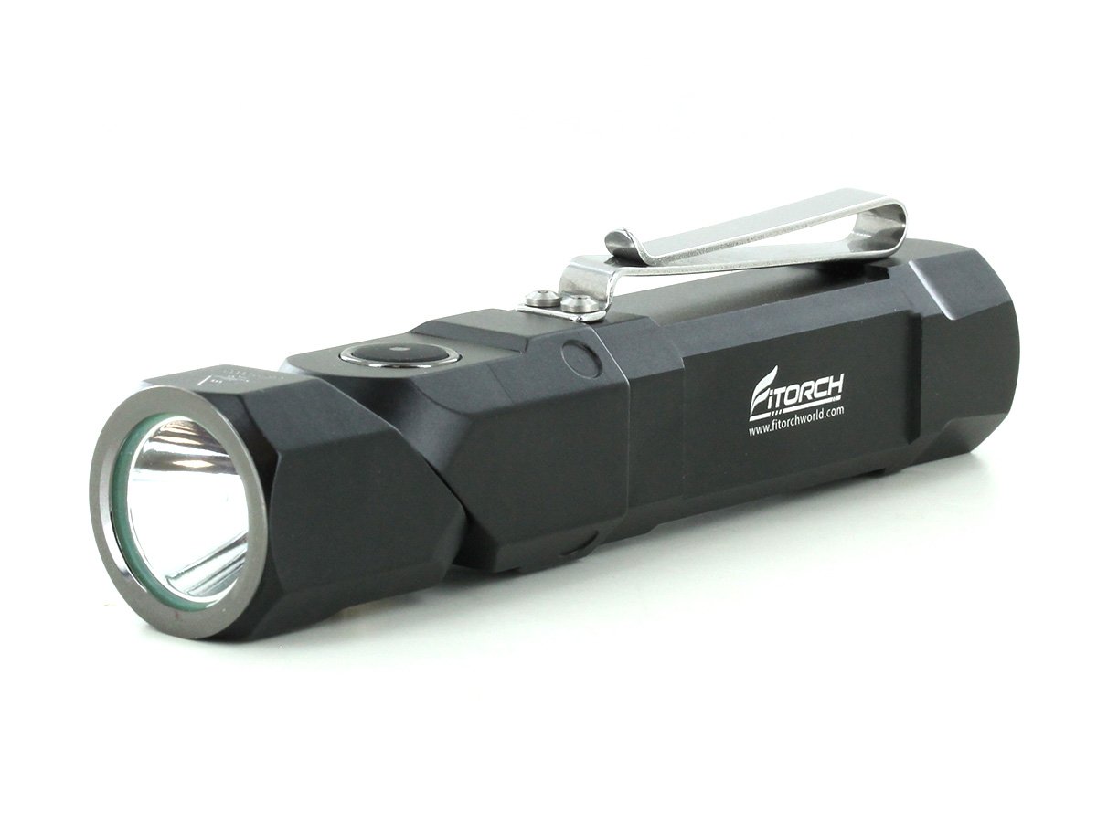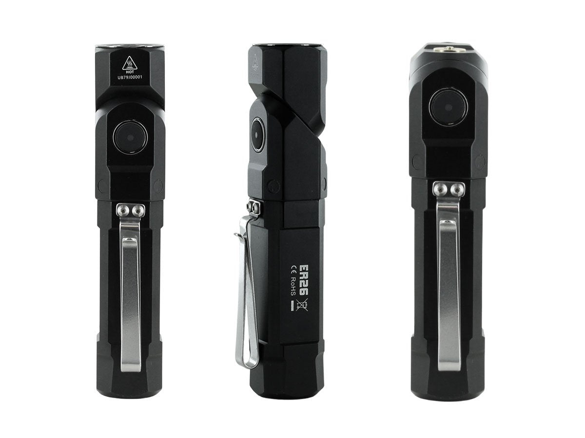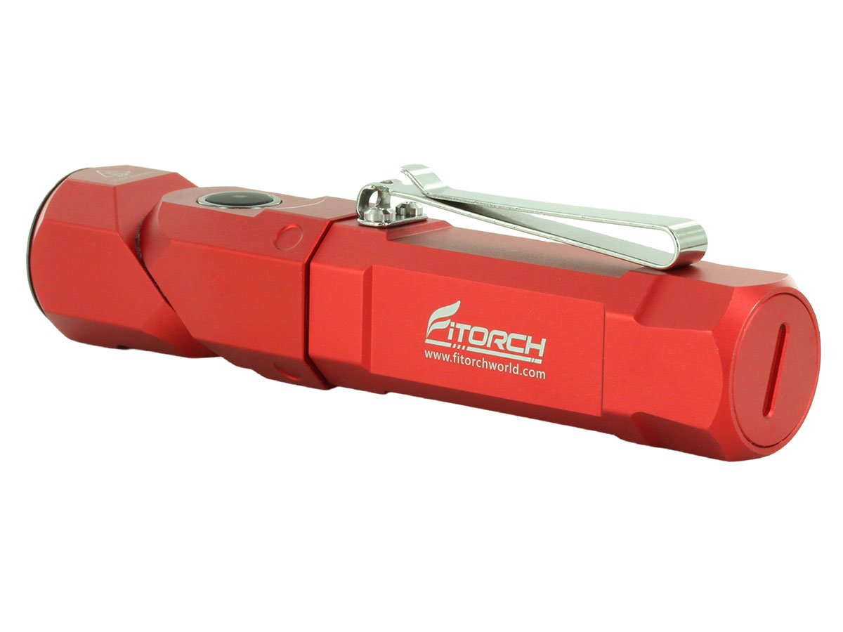 The Fitorch ER26 is a powerful LED light that features bright output as well as an adjustable angle head. Capable of light levels up to 1380 lumens, this light is perfect for indoor or outdoor use and makes an excellent everyday carry light. The adjustable head of the ER26 bends to a 90 degree angle creating a forward facing angle light that can be clipped to clothing for hands free illumination. Combined with multiple light levels and a simple single button interface, the ER26 is an excellent light for all purposes.