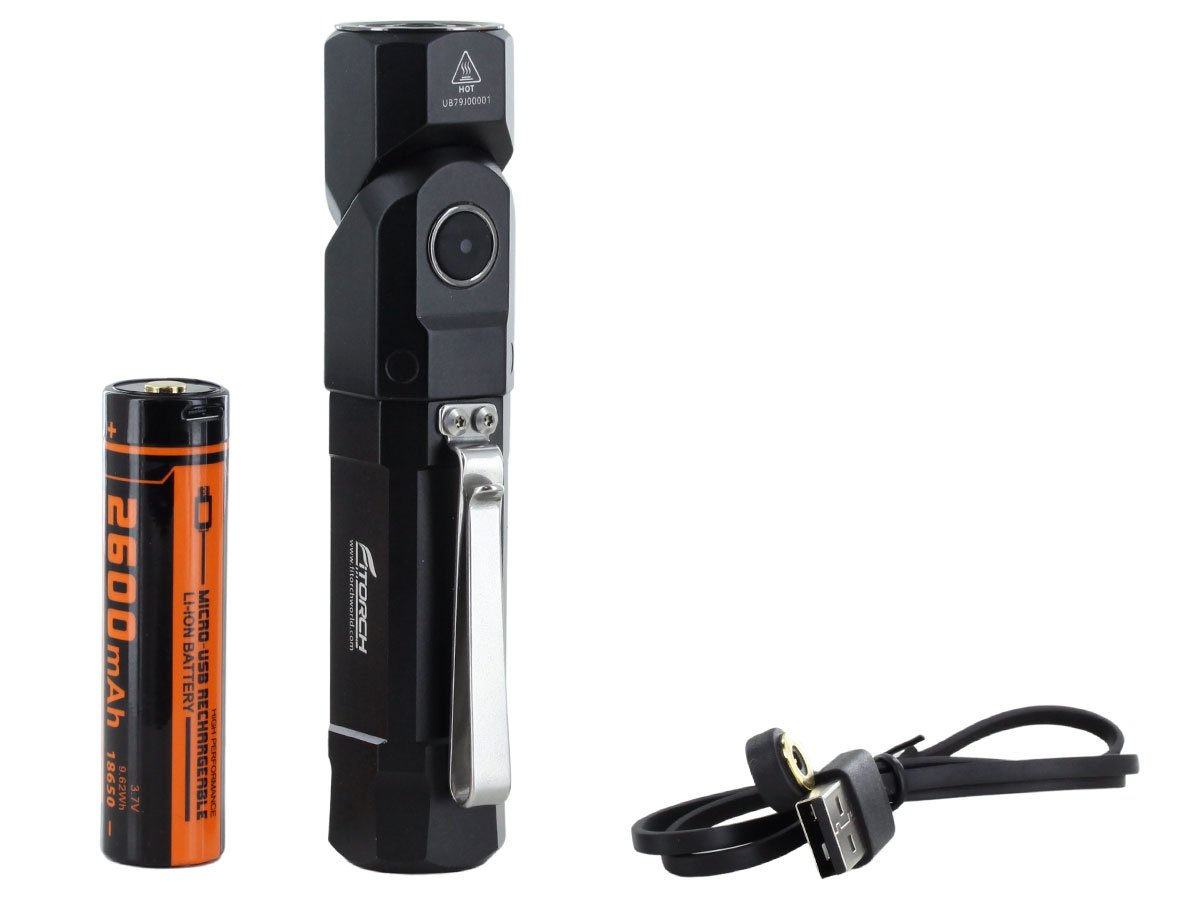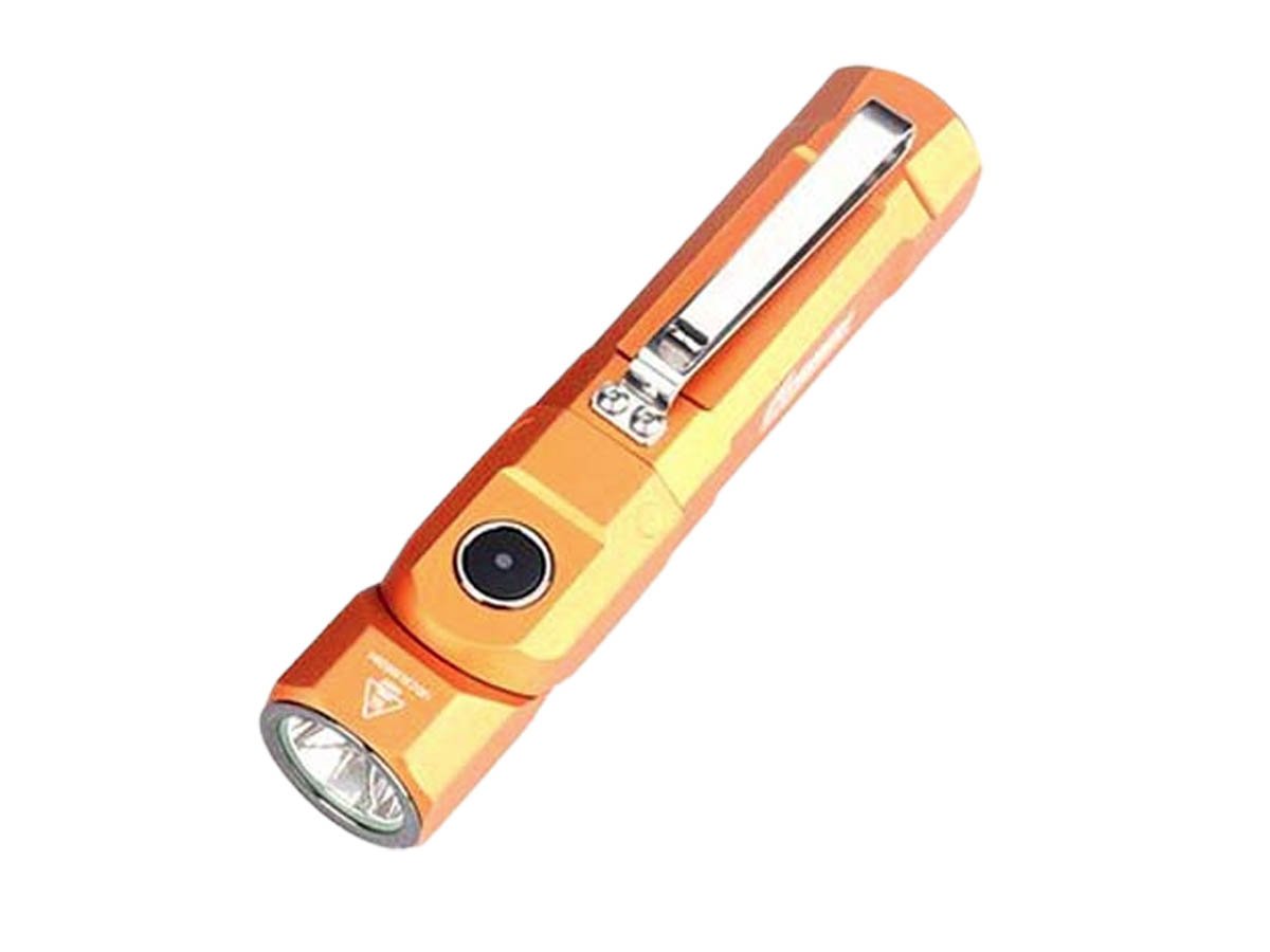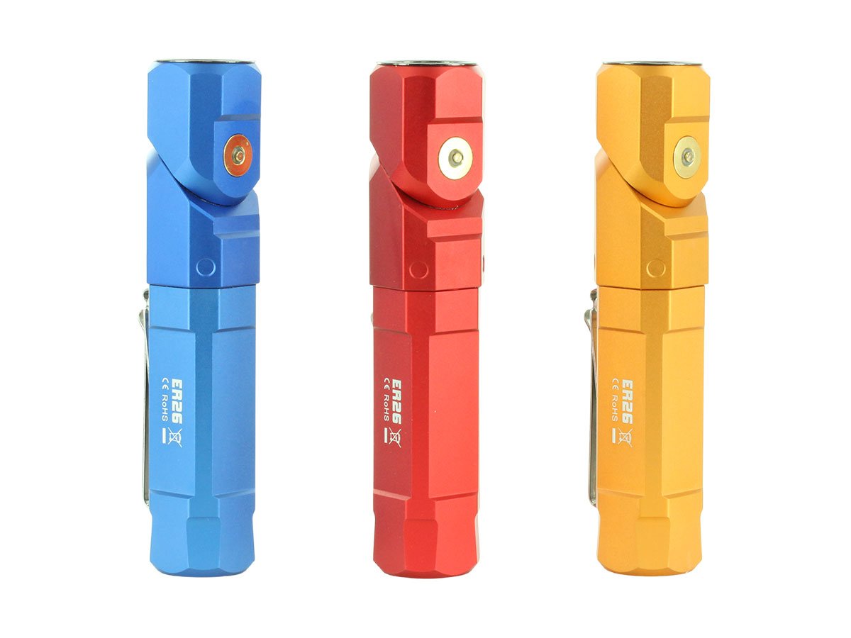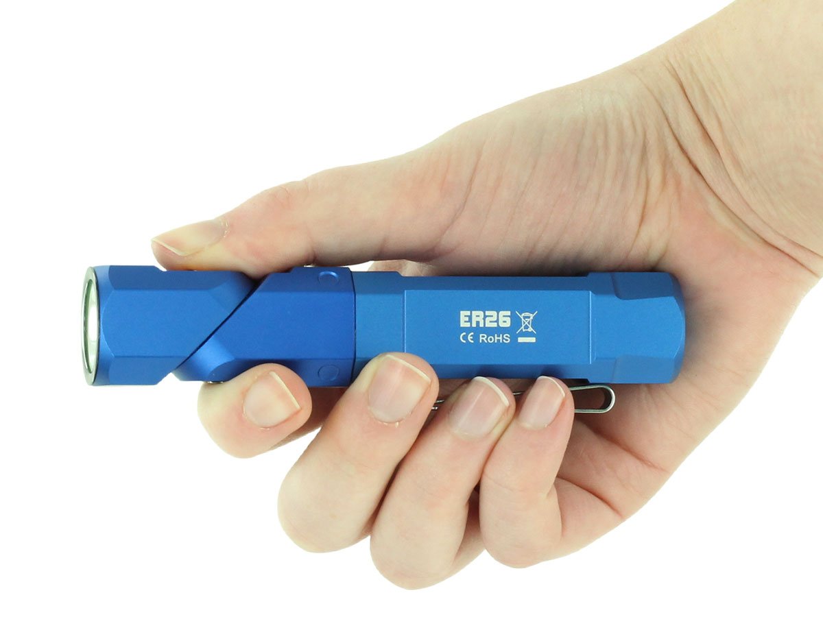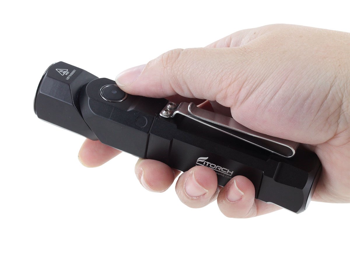 The Fitorch ER26 is a powerful LED light that features bright output as well as an adjustable angle head. Capable of light levels up to 1380 lumens, this light is perfect for indoor or outdoor use and makes an excellent everyday carry light. The adjustable head of the ER26 bends to a 90 degree angle creating a forward facing angle light that can be clipped to clothing for hands free illumination. Combined with multiple light levels and a simple single button interface, the ER26 is an excellent light for all purposes.
