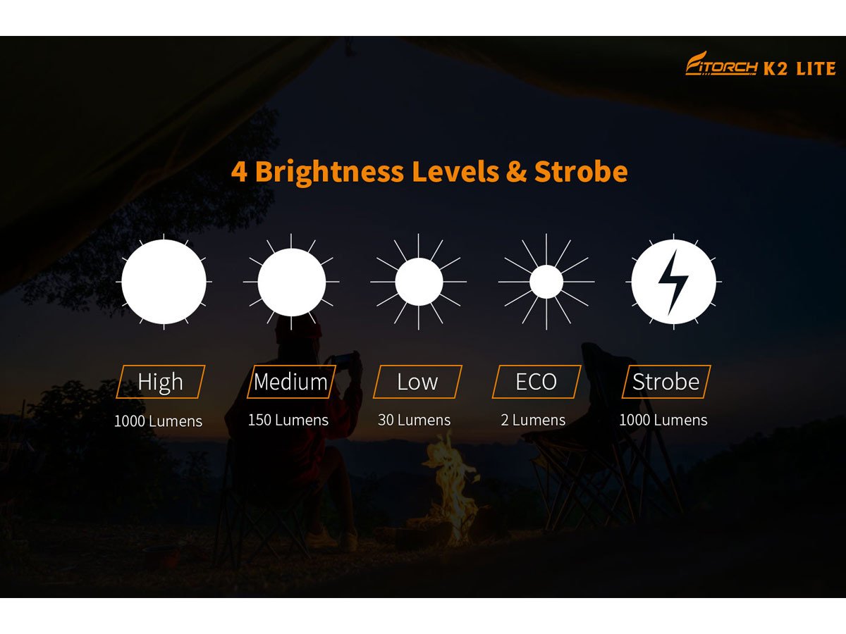 | Brightness | 1000lumens | 150lumens | 30lumens | 2lumens | 1000lumens |