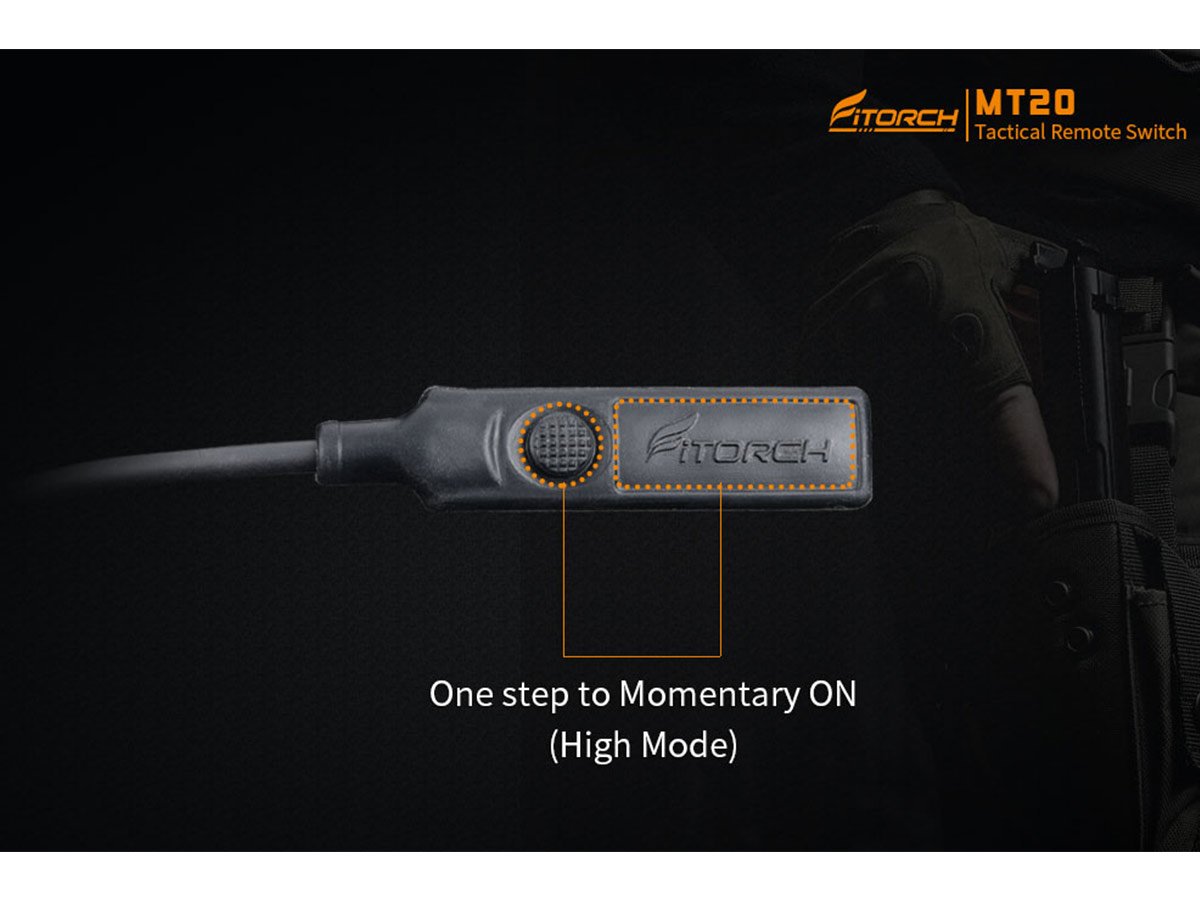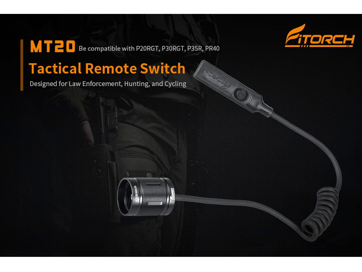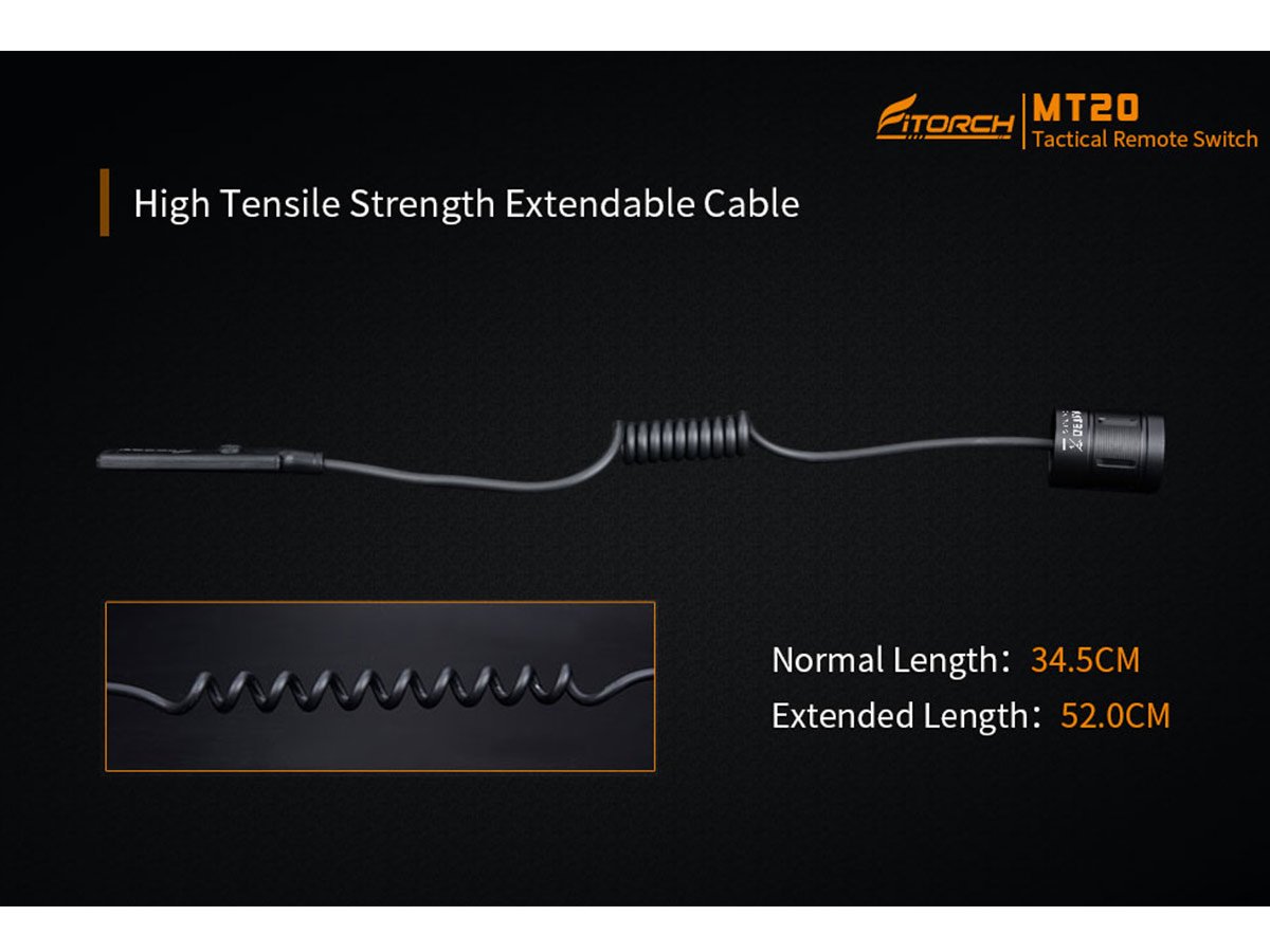 Equip your flashlight with the Fitorch MT20 Remote Pressure Switch! This pressure switch is compatible with a slew of lights, including the P20C, P20RGT, P30C, P30RGT, P35R, and the PR40. Give yourself the power to activate your light at the touch of a button, so you can have one-handed access to Turbo mode no matter what the circumstances. The strong, high tensile strength extendable cable is 34.5cm normally, and can reach up to 52cm when extended. The tightly coiled cord helps remove the hazard of tangling wires while using. This switch is great for law enforcement and military personnel who might couple their light with various equipment and need one-handed activation power.