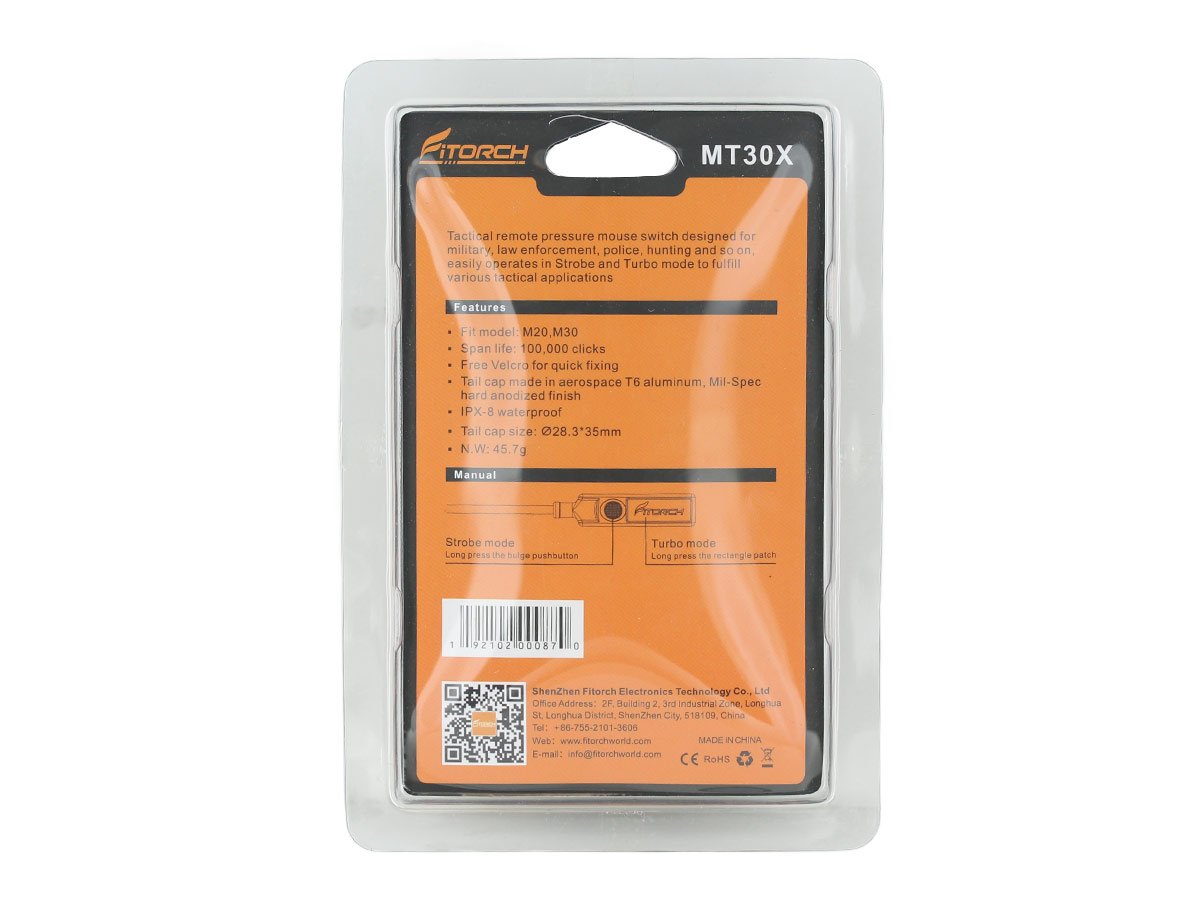 If you're looking to up the ante in tactical operation with your Fitorch flashlight, look no further than the Fitorch MT30X! This tactical remote switch allows rapid, momentary-on control of turbo and strobe modes from two simple buttons. This way, you have quick light operation at a moment's notice, crucial in tactical fields. It has a coiled design, to extend out on longer weapons and fit larger gear. The MT30X is compatible with the Fitorch M20 and M30 tactical flashlights, to boost tactical capability for law enforcement and military users.