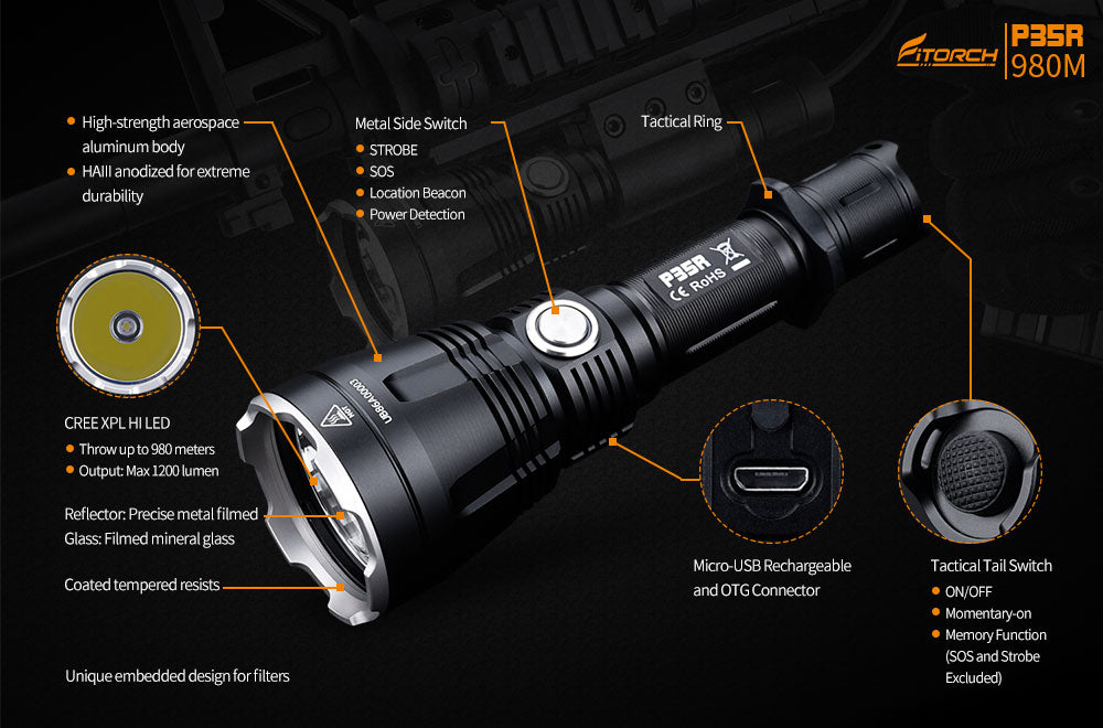 The newest addition to their long-range lights, the Fitorch P35R is a powerful flashlight designed for hunting, tactical, or outdoor illumination. Made from high-quality aerospace aluminum alloy, this light is incredibly durable and lightweight. Comfortably fitting in the palm, it only measures a little over 6 inches long and weighs a little over 7 oz (without battery). Its advanced lighting system is a combination of one Cree XPL HI LED and an optical system specifically designed for long-range spotlighting. This light is powered by one 18650 (included) or two CR123A Li-ion batteries and can produce up to 1200 lumens to punch a hole through darkness over 3,200 feet long! It also comes with a variety of accessories that can be used to aid in hunting, spotting, or tactical situations. The holster and lanyard give you carrying options while the removable and easy-to-install colored filters can assist you with night vision and tracking.