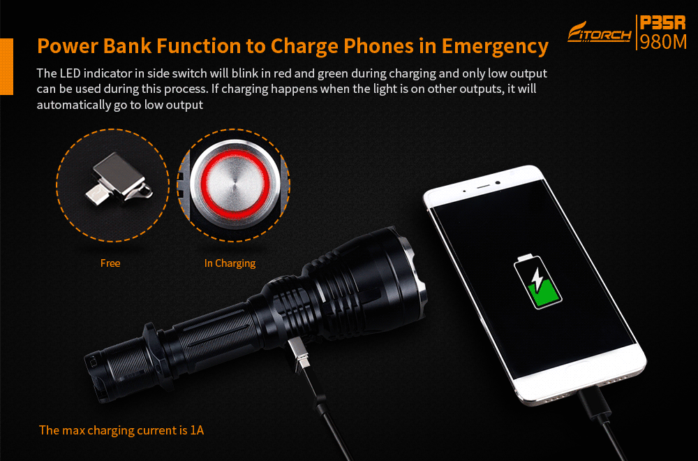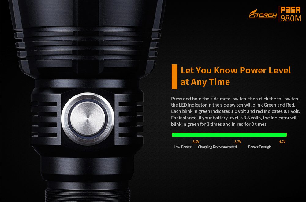 The P35R is not only dual-fuel capable, but it can also be charged through its Micro-USB port and has a power bank function - if your mobile device or phone is dead, Fitorch has you covered! This light has a valuable portable power bank feature in case of emergencies! Simply use the USB connector kit and plug in your mobile device for a safe and quick (5V/1A) charge. You can even continue to use your flashlight in low modes while charging! The metal side switch allows access to the brightness levels and special modes. The side switch is also combined with the integrated battery level indicator so you can be aware of the remaining power in real-time.