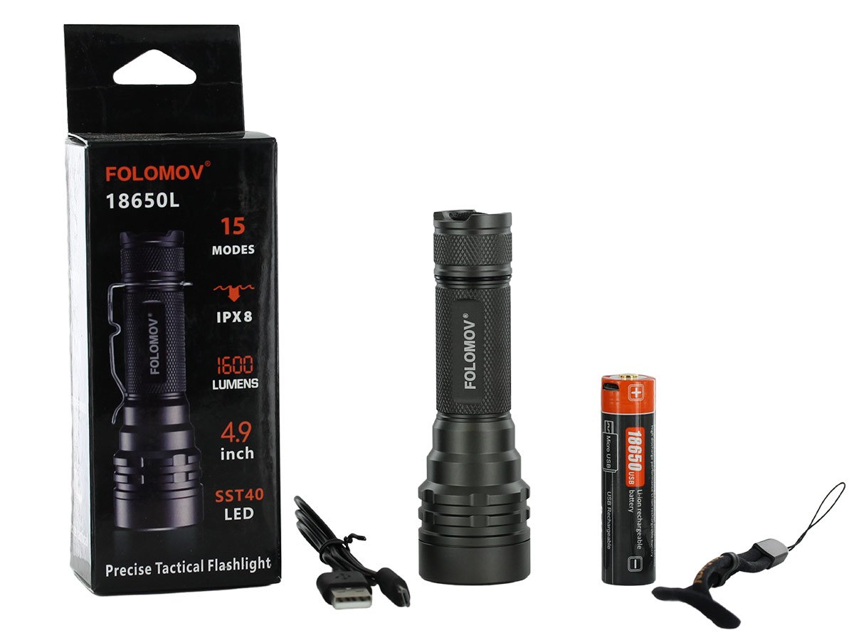 Folomov 18650L LED Flashlight - LUMINUS SST-40 - 1600 Lumens - Includes 1 x 18650 with Built-in Micro USB Charge Port