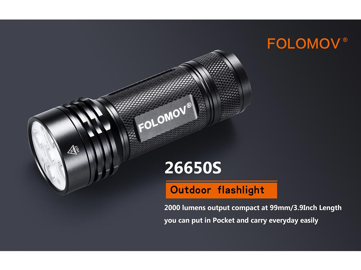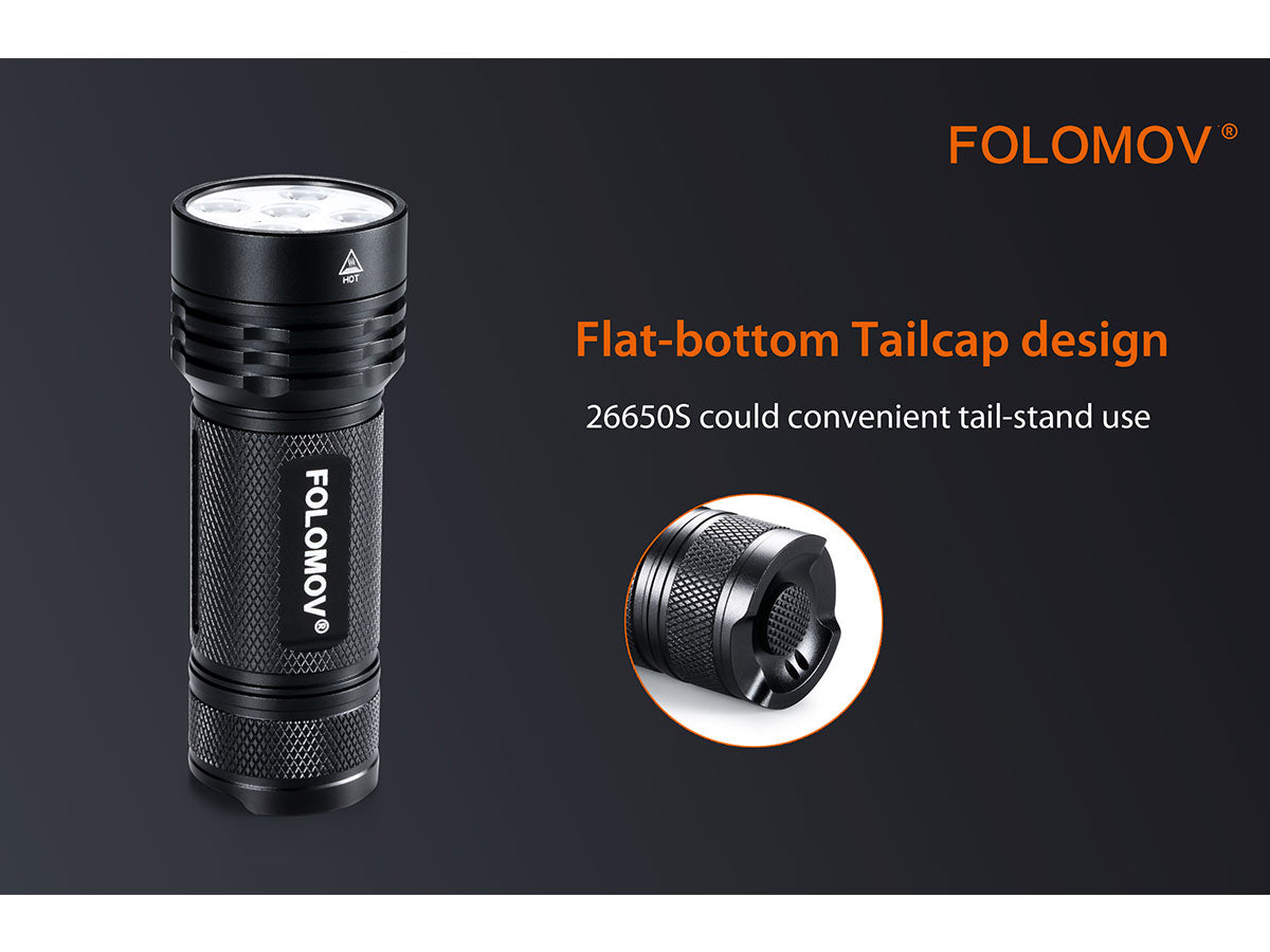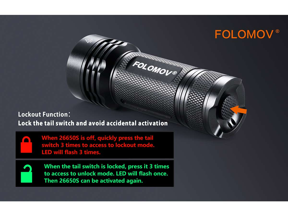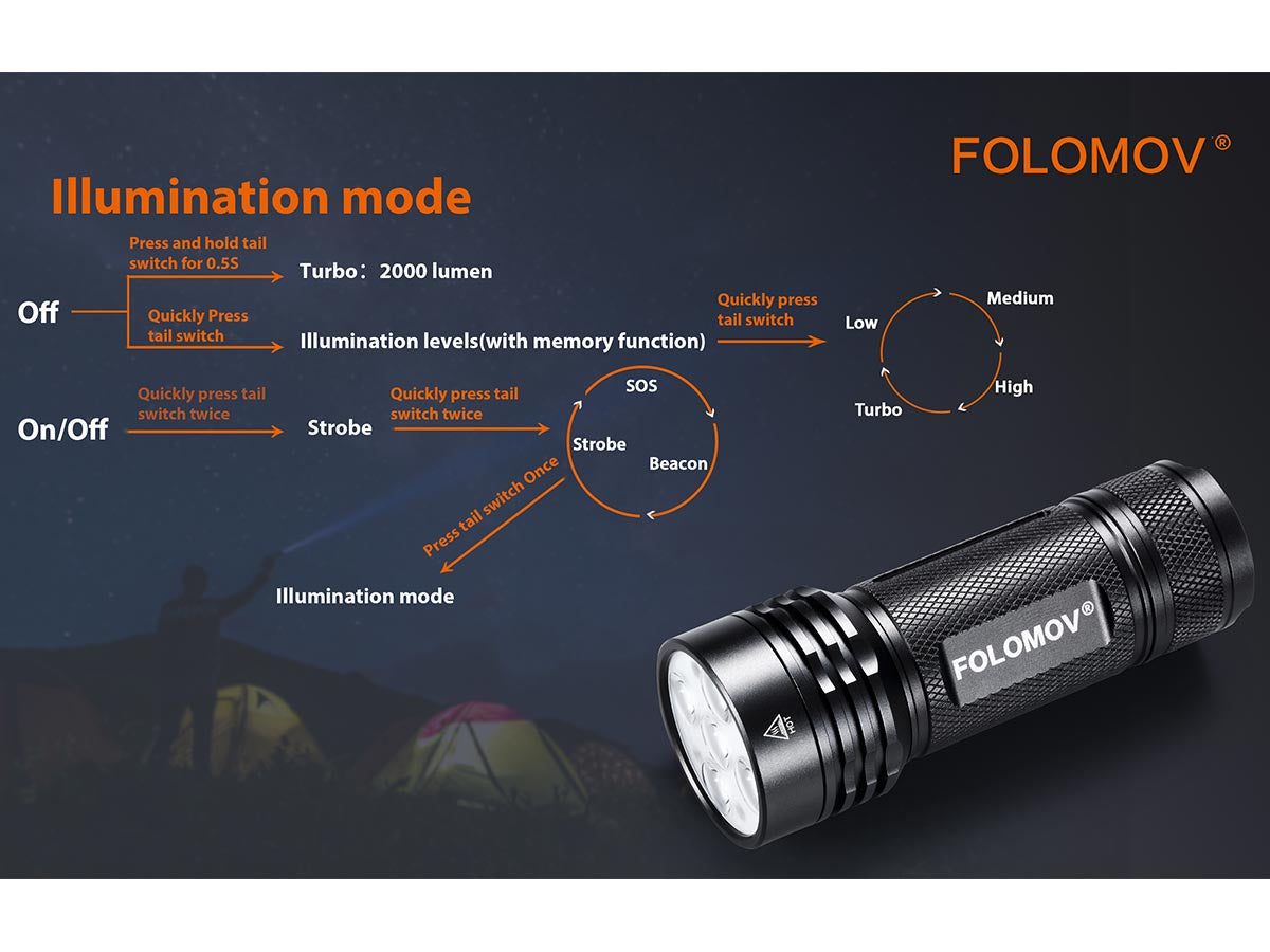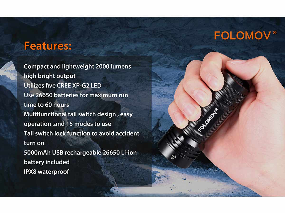 The Folomov 26650S is an innovative and compact flashlight that can be used for a wide range of tasks and lighting needs - indoors and out. Powered by just one 26650 li-ion battery (included), its 5 CREE LEDs can produce 2000 lumens for up to 3 hours and as little as 80 lumens for 2 and a half days! The singular multi-functional tail switch provides you complete access to the dual setting modes and their sub-modes without having to move your hand. With a series of presses or press and holds, (as specified below) you can stay in illumination mode with standard brightness settings, or choose the tactical mode to give you quick access to the turbo and special signaling modes. These modes and additional sub-modes ensure that you have the lighting and preferred settings best suited for the task or situation at hand. The optional modes of lockout and countdown timer provide extra protection from accidental activation and over-use.