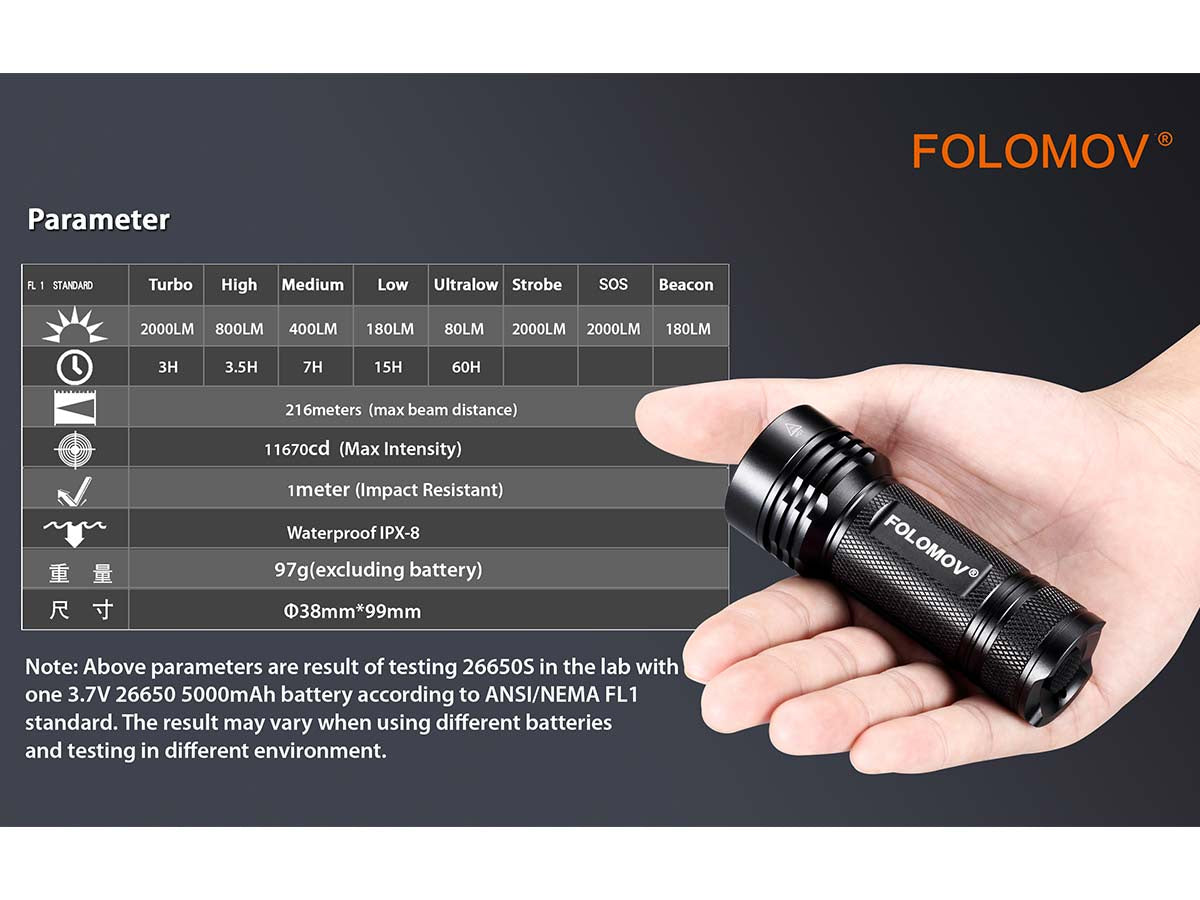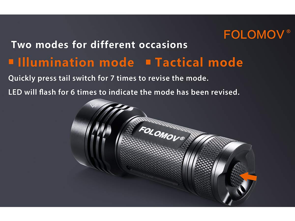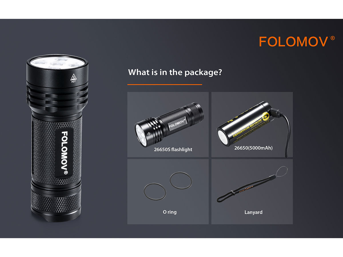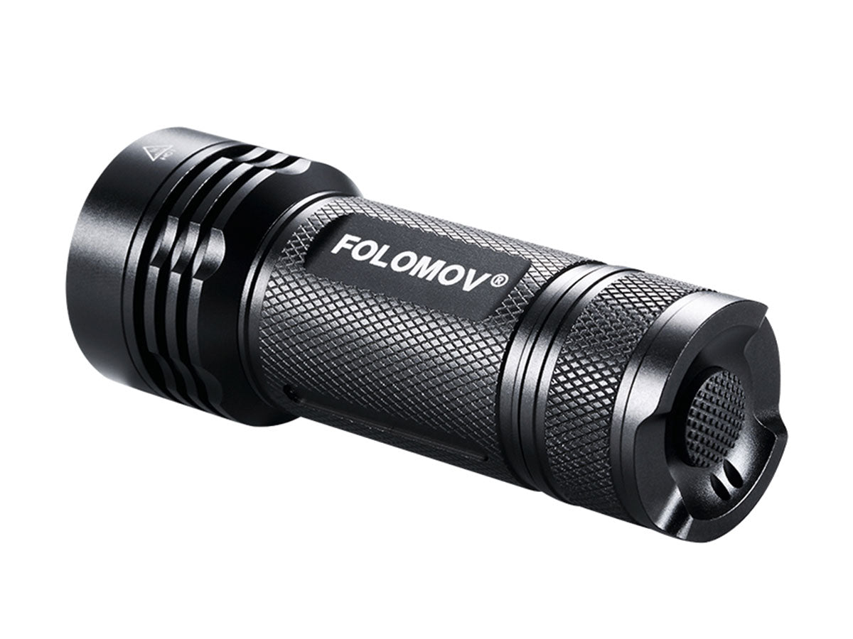 The Folomov 26650S is an innovative and compact flashlight that can be used for a wide range of tasks and lighting needs - indoors and out. Powered by just one 26650 li-ion battery (included), its 5 CREE LEDs can produce 2000 lumens for up to 3 hours and as little as 80 lumens for 2 and a half days! The singular multi-functional tail switch provides you complete access to the dual setting modes and their sub-modes without having to move your hand. With a series of presses or press and holds, (as specified below) you can stay in illumination mode with standard brightness settings, or choose the tactical mode to give you quick access to the turbo and special signaling modes. These modes and additional sub-modes ensure that you have the lighting and preferred settings best suited for the task or situation at hand. The optional modes of lockout and countdown timer provide extra protection from accidental activation and over-use.