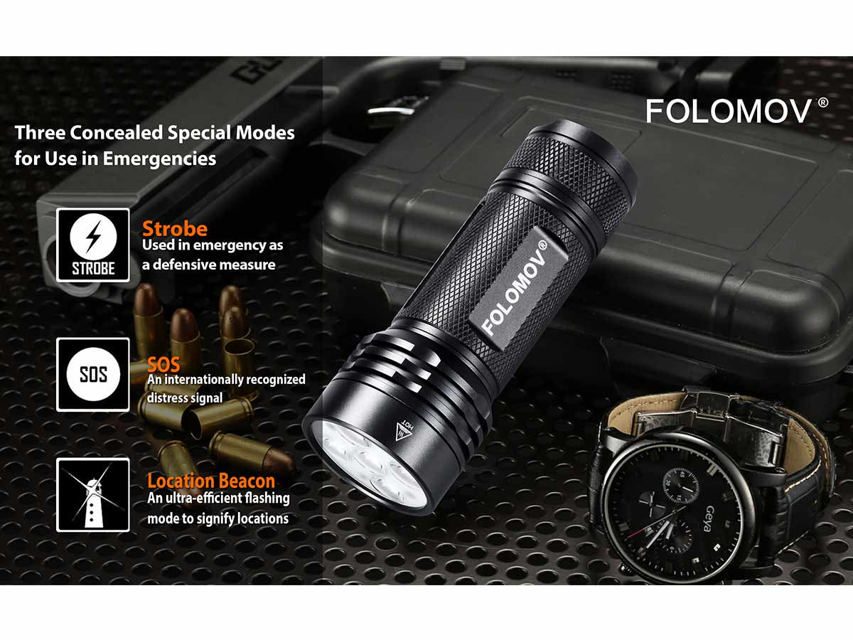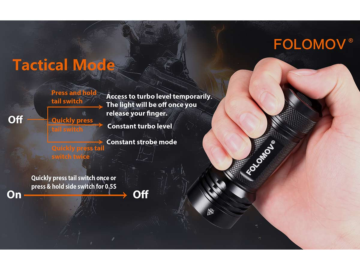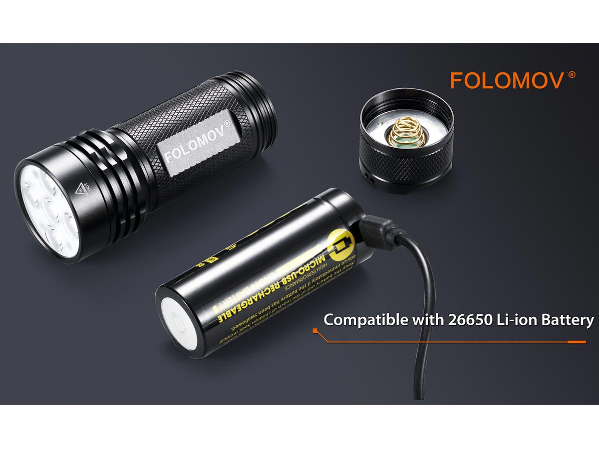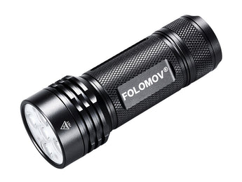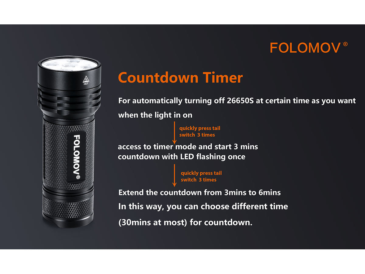 The Folomov 26650S is an innovative and compact flashlight that can be used for a wide range of tasks and lighting needs - indoors and out. Powered by just one 26650 li-ion battery (included), its 5 CREE LEDs can produce 2000 lumens for up to 3 hours and as little as 80 lumens for 2 and a half days! The singular multi-functional tail switch provides you complete access to the dual setting modes and their sub-modes without having to move your hand. With a series of presses or press and holds, (as specified below) you can stay in illumination mode with standard brightness settings, or choose the tactical mode to give you quick access to the turbo and special signaling modes. These modes and additional sub-modes ensure that you have the lighting and preferred settings best suited for the task or situation at hand. The optional modes of lockout and countdown timer provide extra protection from accidental activation and over-use.