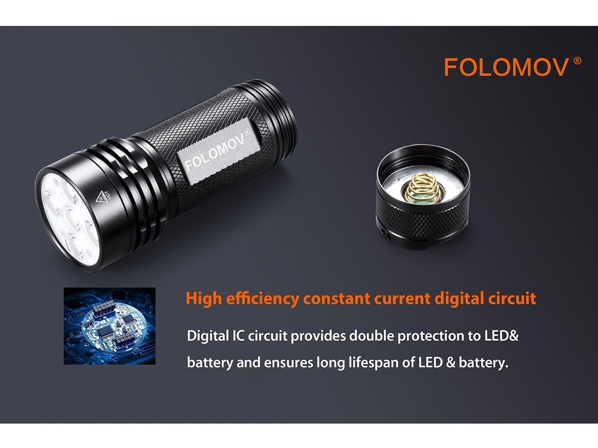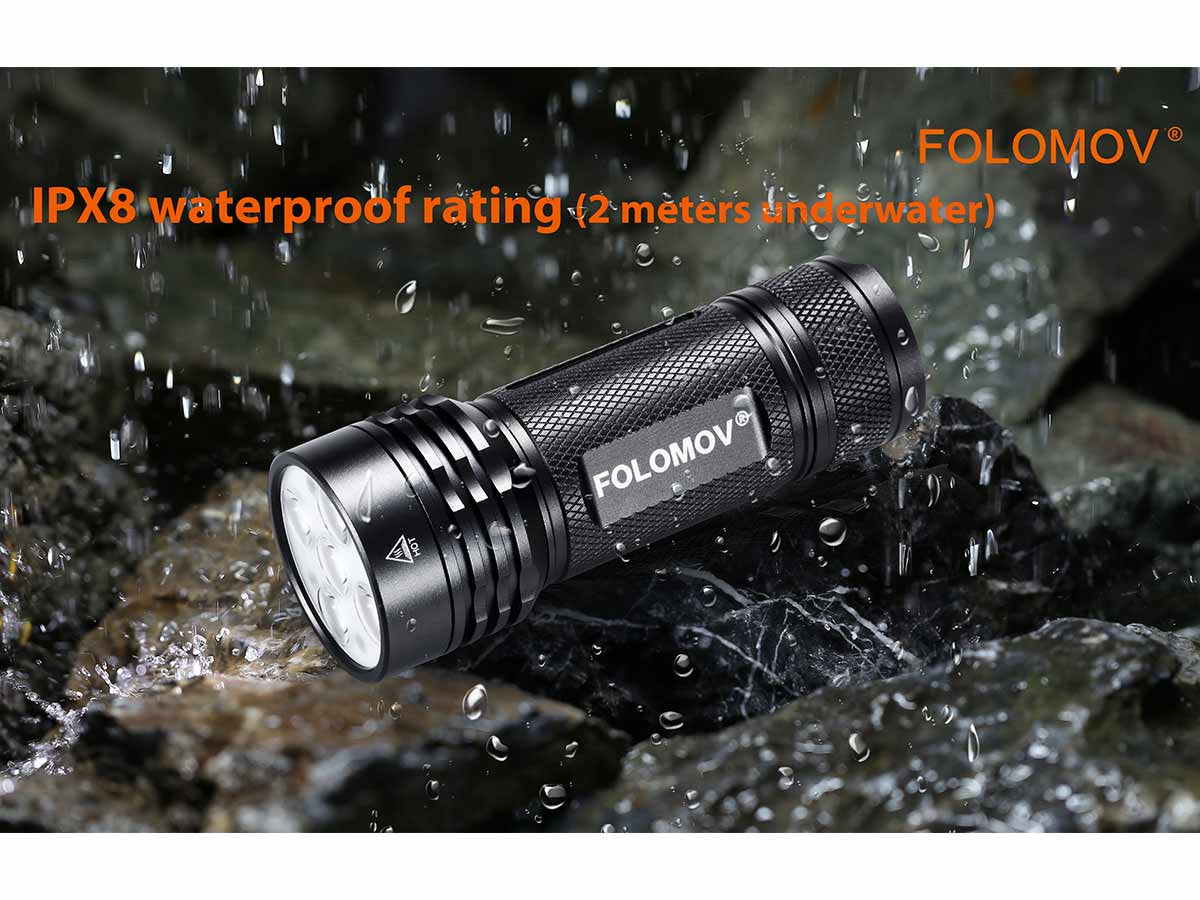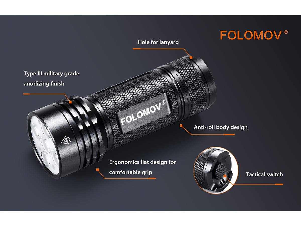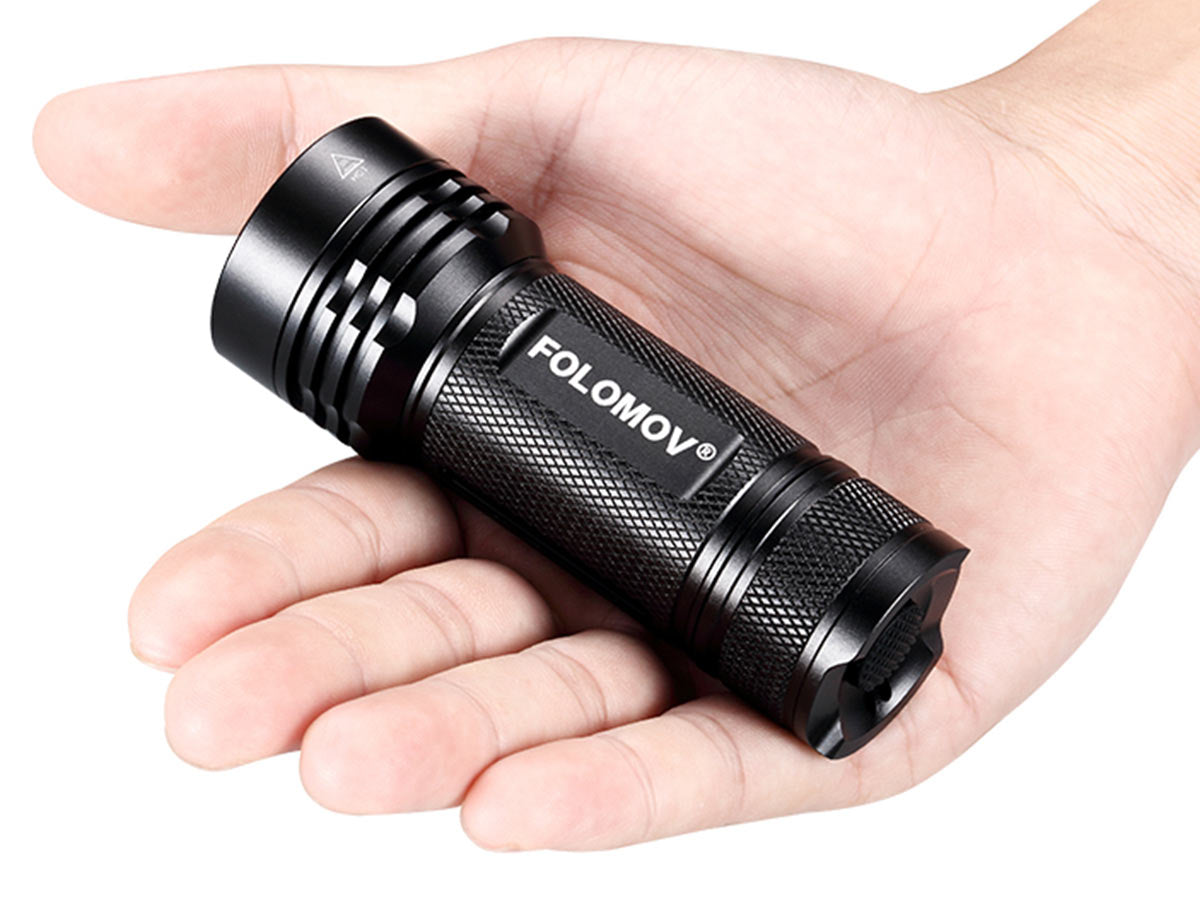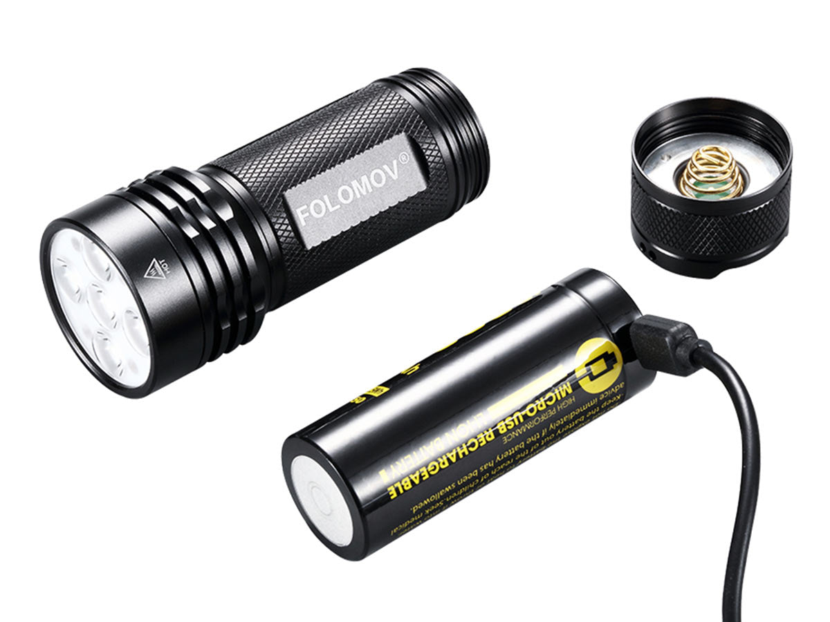The Folomov 26650S is an innovative and compact flashlight that can be used for a wide range of tasks and lighting needs - indoors and out. Powered by just one 26650 li-ion battery (included), its 5 CREE LEDs can produce 2000 lumens for up to 3 hours and as little as 80 lumens for 2 and a half days! The singular multi-functional tail switch provides you complete access to the dual setting modes and their sub-modes without having to move your hand. With a series of presses or press and holds, (as specified below) you can stay in illumination mode with standard brightness settings, or choose the tactical mode to give you quick access to the turbo and special signaling modes. These modes and additional sub-modes ensure that you have the lighting and preferred settings best suited for the task or situation at hand. The optional modes of lockout and countdown timer provide extra protection from accidental activation and over-use.