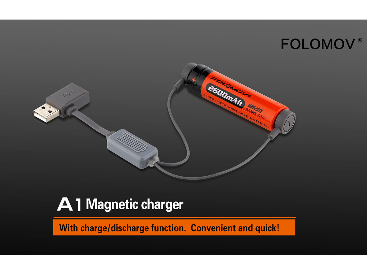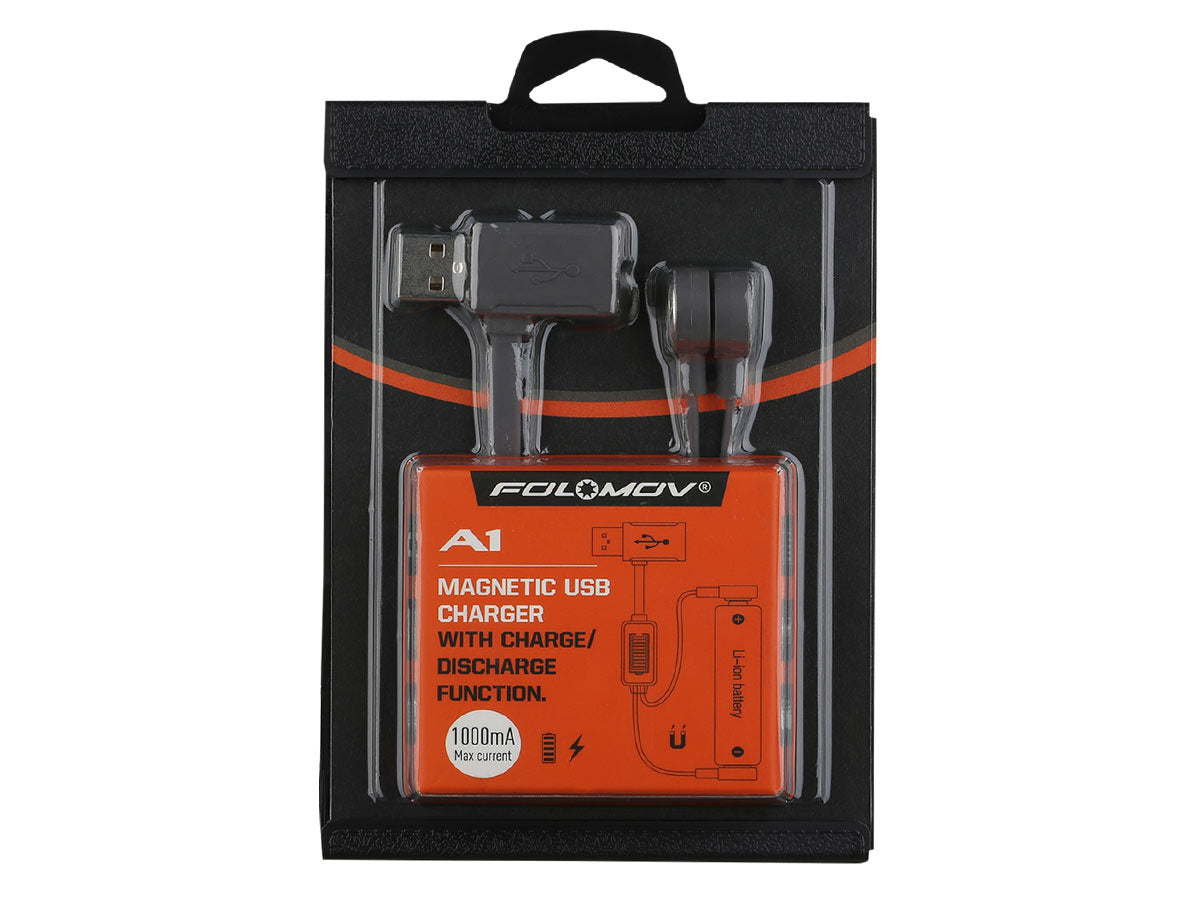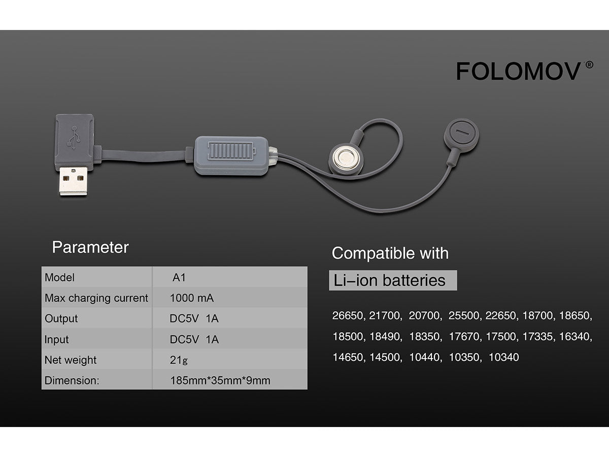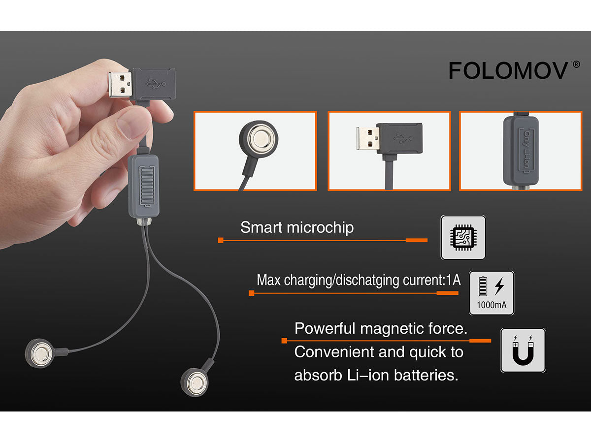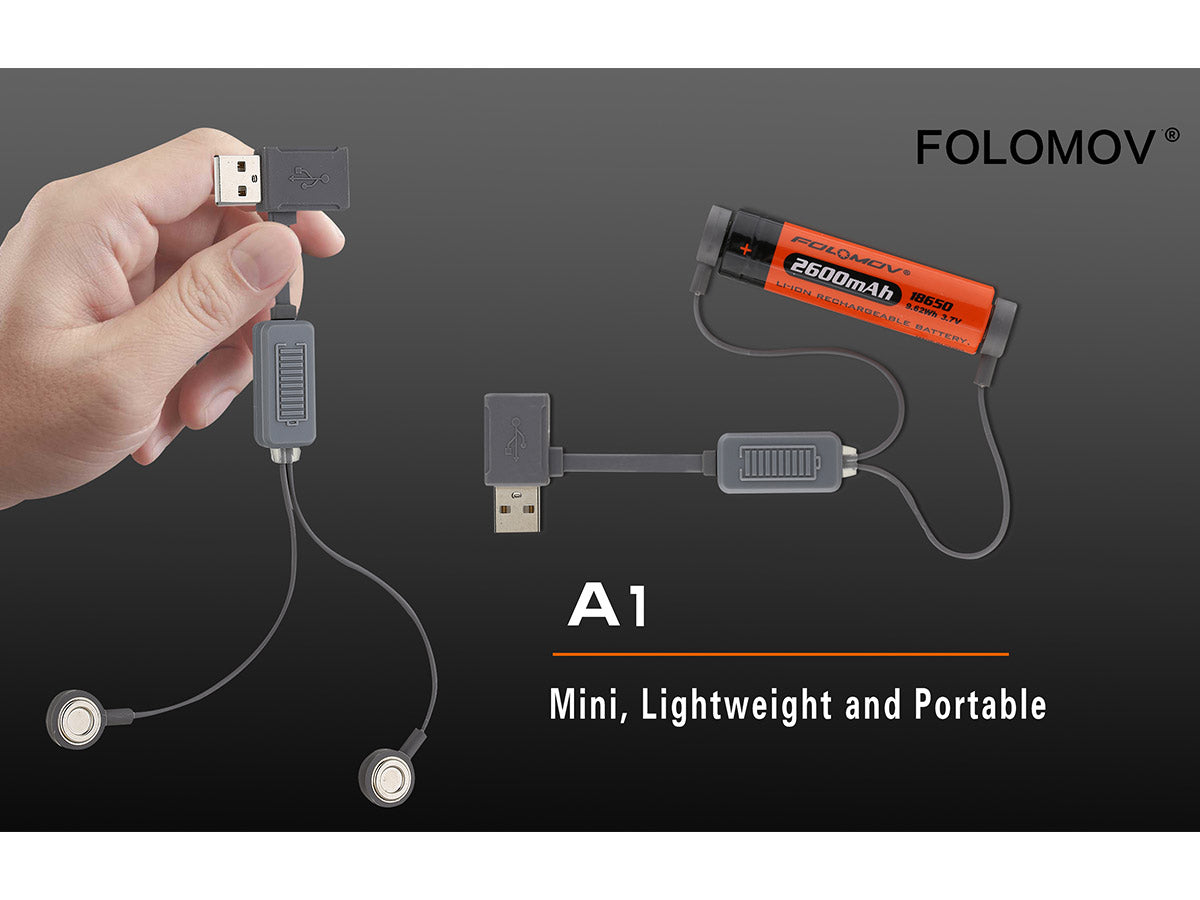 The Folomov A1 USB Charging Cable is a unique li-ion battery charger that can easily be taken with you for a simple charging solution on the go. This innovative and patented magnetic charger is designed to recharge a variety of li-ion batteries in a more convenient and portable fashion. Never have to carry around a bulky battery charger the size of your cell phone again. This charger can easily fit in any bag, pack, suitcase, and even some pockets! Simply attach the powerful magnetic charging ends to the corresponding terminals of your battery and plug into a standard USB port. The 1A charging current through standard USB connection provides you with a quick charging time, every time. If needed, you can discharge your battery to provide power to your other essential USB devices! The battery charging indicator LED lets you monitor the charging process in real-time so you never have to guess if the cell is done charging. If you use li-ion batteries regularly, this new A1 Charger will revolutionize how and when you charge them!