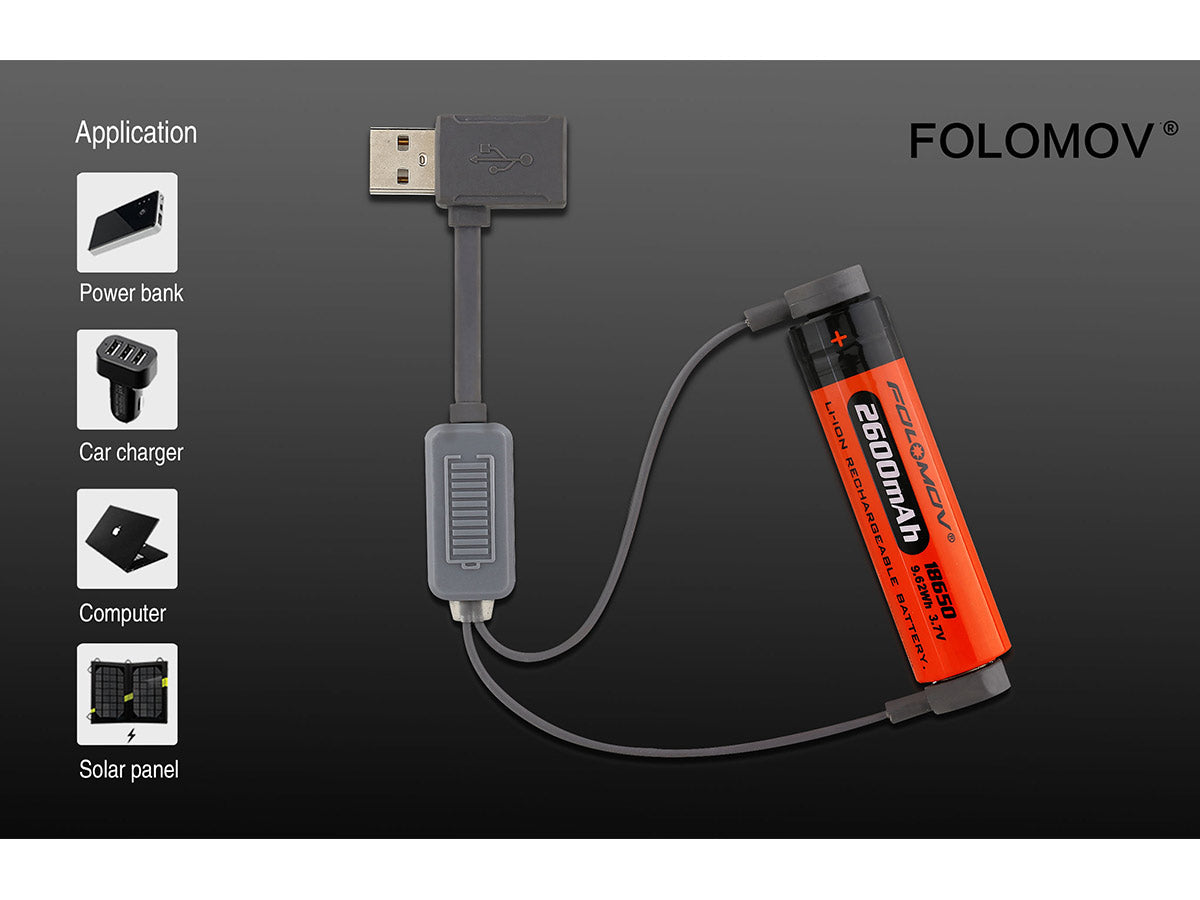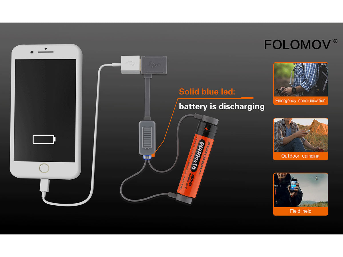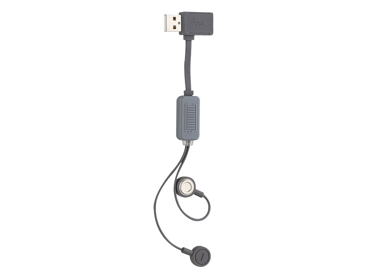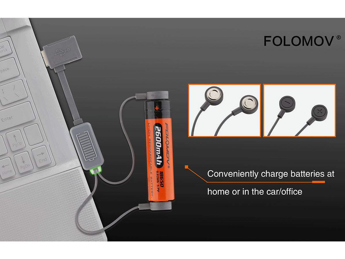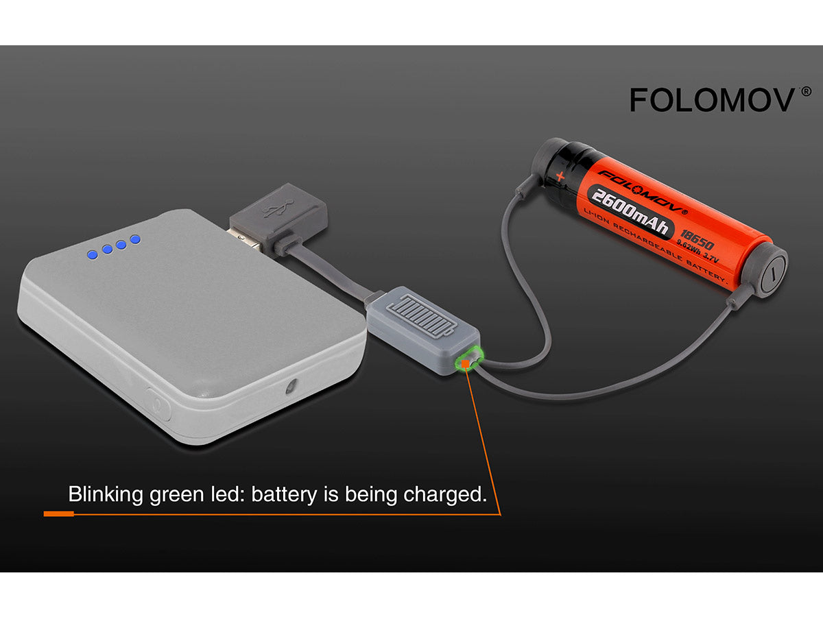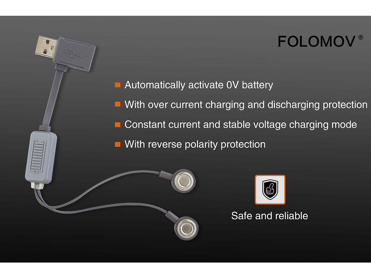 The Folomov A1 USB Charging Cable is a unique li-ion battery charger that can easily be taken with you for a simple charging solution on the go. This innovative and patented magnetic charger is designed to recharge a variety of li-ion batteries in a more convenient and portable fashion. Never have to carry around a bulky battery charger the size of your cell phone again. This charger can easily fit in any bag, pack, suitcase, and even some pockets! Simply attach the powerful magnetic charging ends to the corresponding terminals of your battery and plug into a standard USB port. The 1A charging current through standard USB connection provides you with a quick charging time, every time. If needed, you can discharge your battery to provide power to your other essential USB devices! The battery charging indicator LED lets you monitor the charging process in real-time so you never have to guess if the cell is done charging. If you use li-ion batteries regularly, this new A1 Charger will revolutionize how and when you charge them!