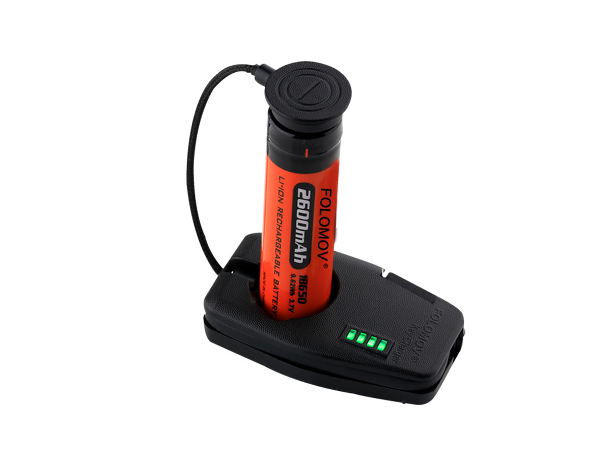 The Folomov Key Charger is one of the most convenient ways to charge your most utilized Li-ion batteries on the go! This portable smart charger is small enough to fit on your key chain and holds all the features of bulkier charging systems. Equipped with strong magnetic charging terminals and a standard USB charging port, you can charge your batteries where ever you need to! In case you need emergency back up power, you can install a Li-ion battery on the Key Charger and use the discharge current as a power bank! The green LED display shows you real-time charging status in 25% increments for your convenience. If you are using Li-ion batteries on a daily basis, this new charger is for you!