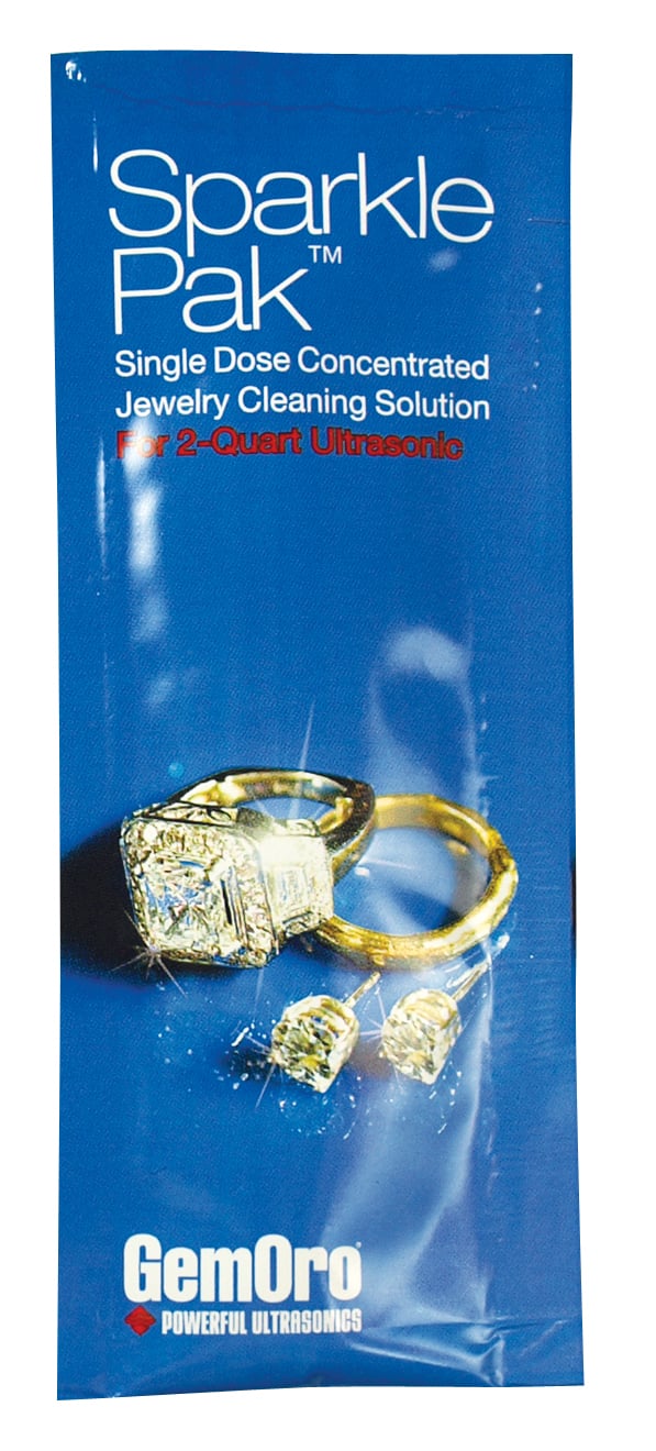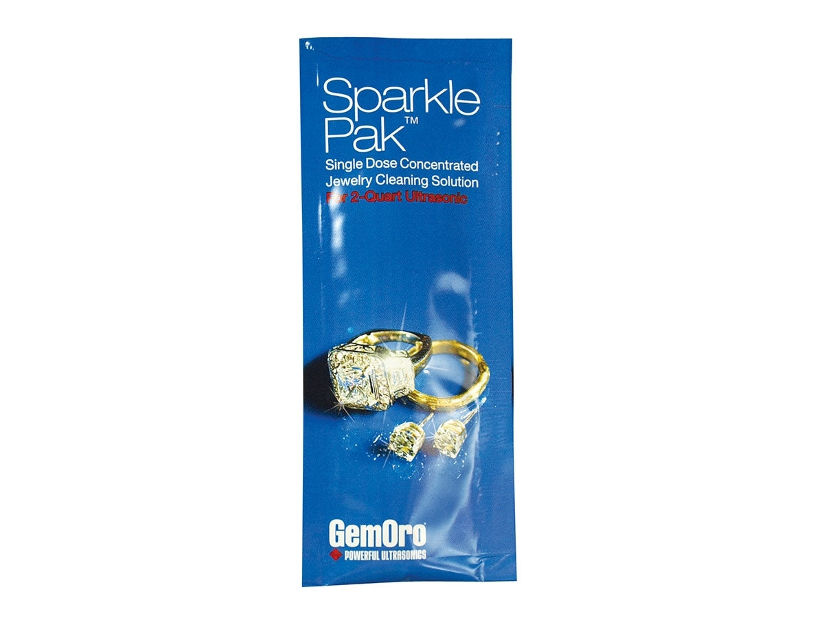 Increase the raw cleaning power of your GemOro ultrasonic cleaners with the GemOro Sparkle Pak. This specially formulated cleaning solution was designed to amplify the cleaning power of GemOro brand ultrasonics to make your jewelry shine like new. The Sparkle Paks are measured and packaged in easy one time use packaged for your favorite GemOro cleaner. There is no need to measure or mix, simply add a single packet to your ultrasonic cleaner for an industrial strength cleaning solution. The Sparkle Pak may also be used in a simple covered water container for similar cleaning power.