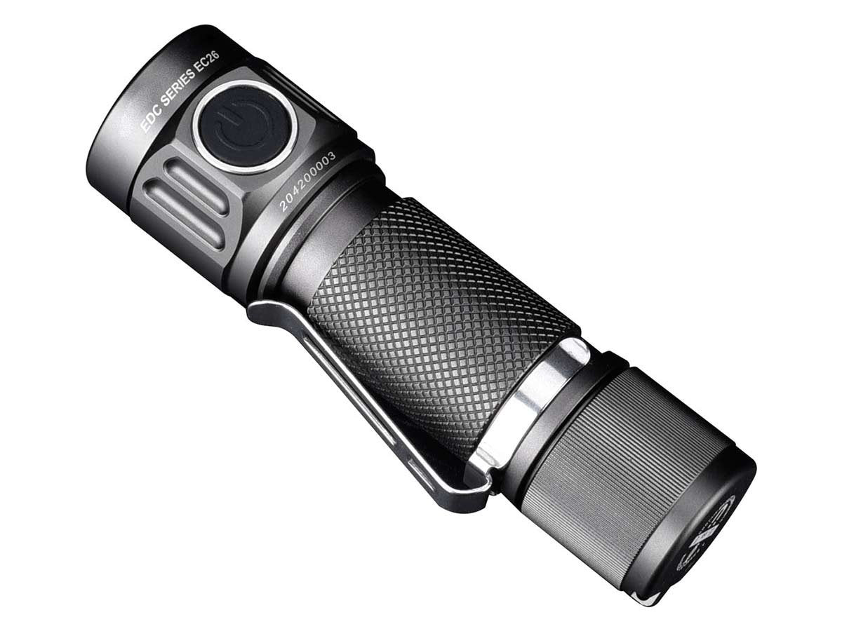 The EC26 has an Anduril UI that allows users to choose from manual (stepping) brightness settings or smooth ramping (step-less) brightness settings. Each setting has several modes within ranging from lockout mode to candle mode. This light's Auxiliary RBG LEDs light up in a range of user-configurable colors and patterns in the bezel when light is off for extra personalized flare.