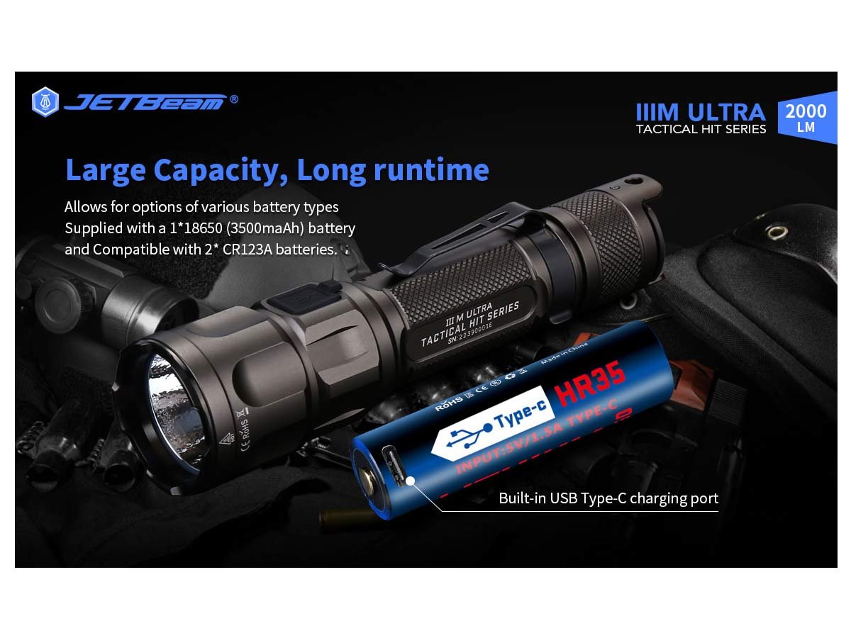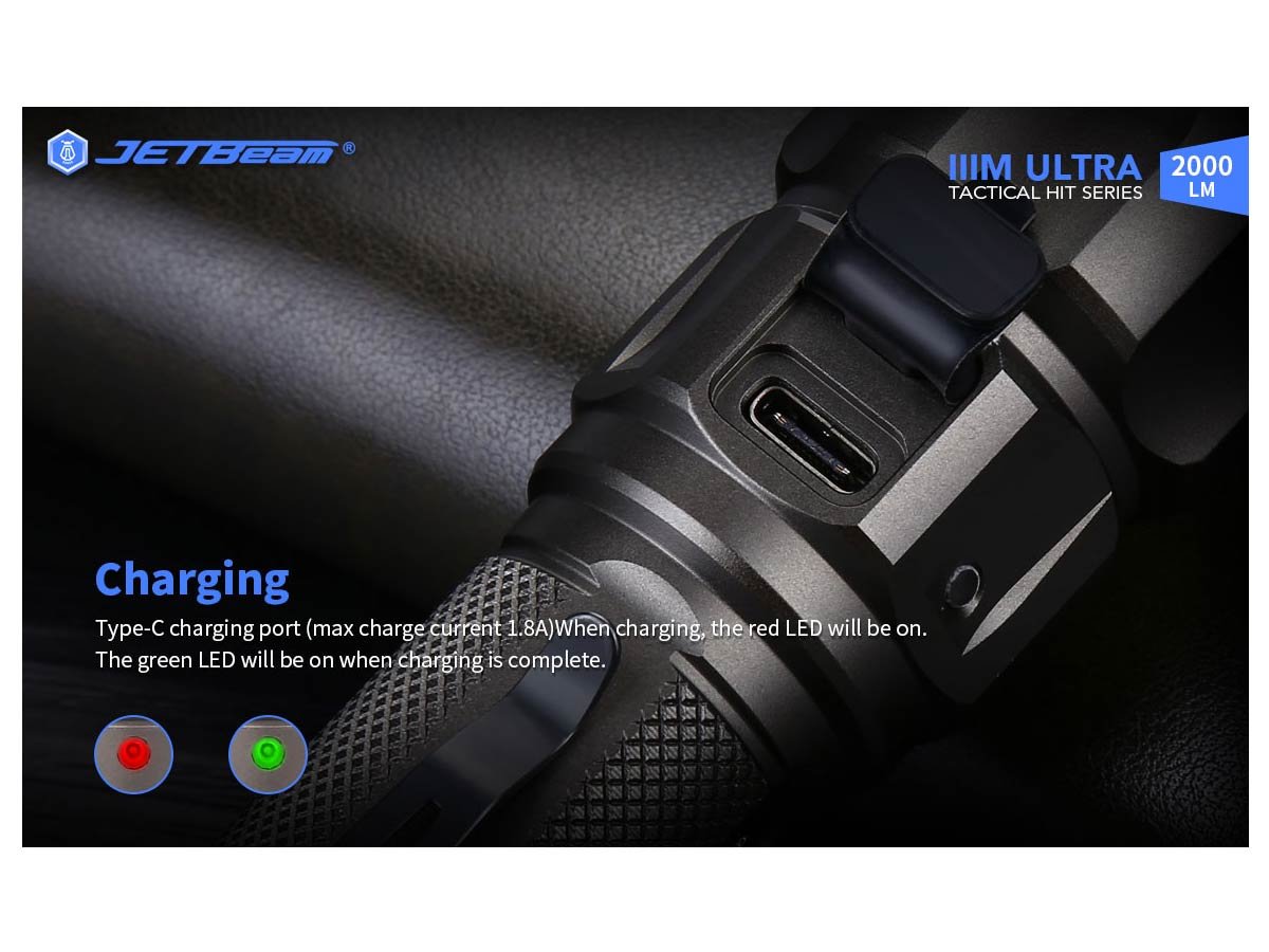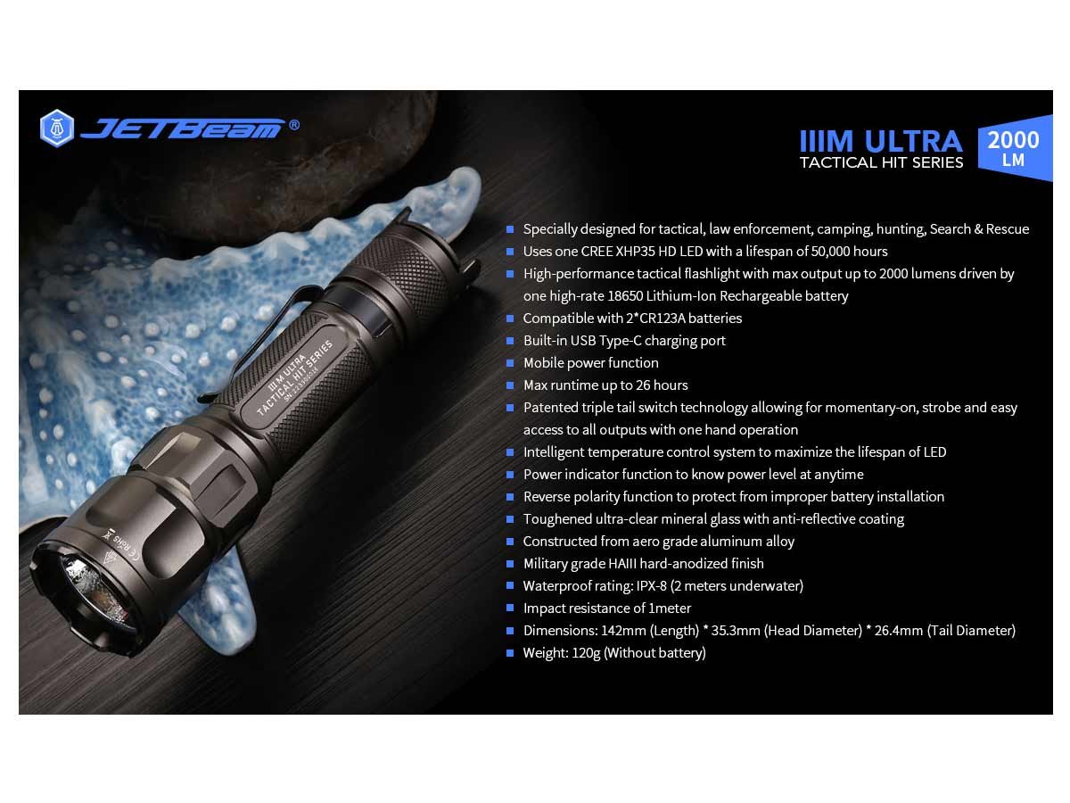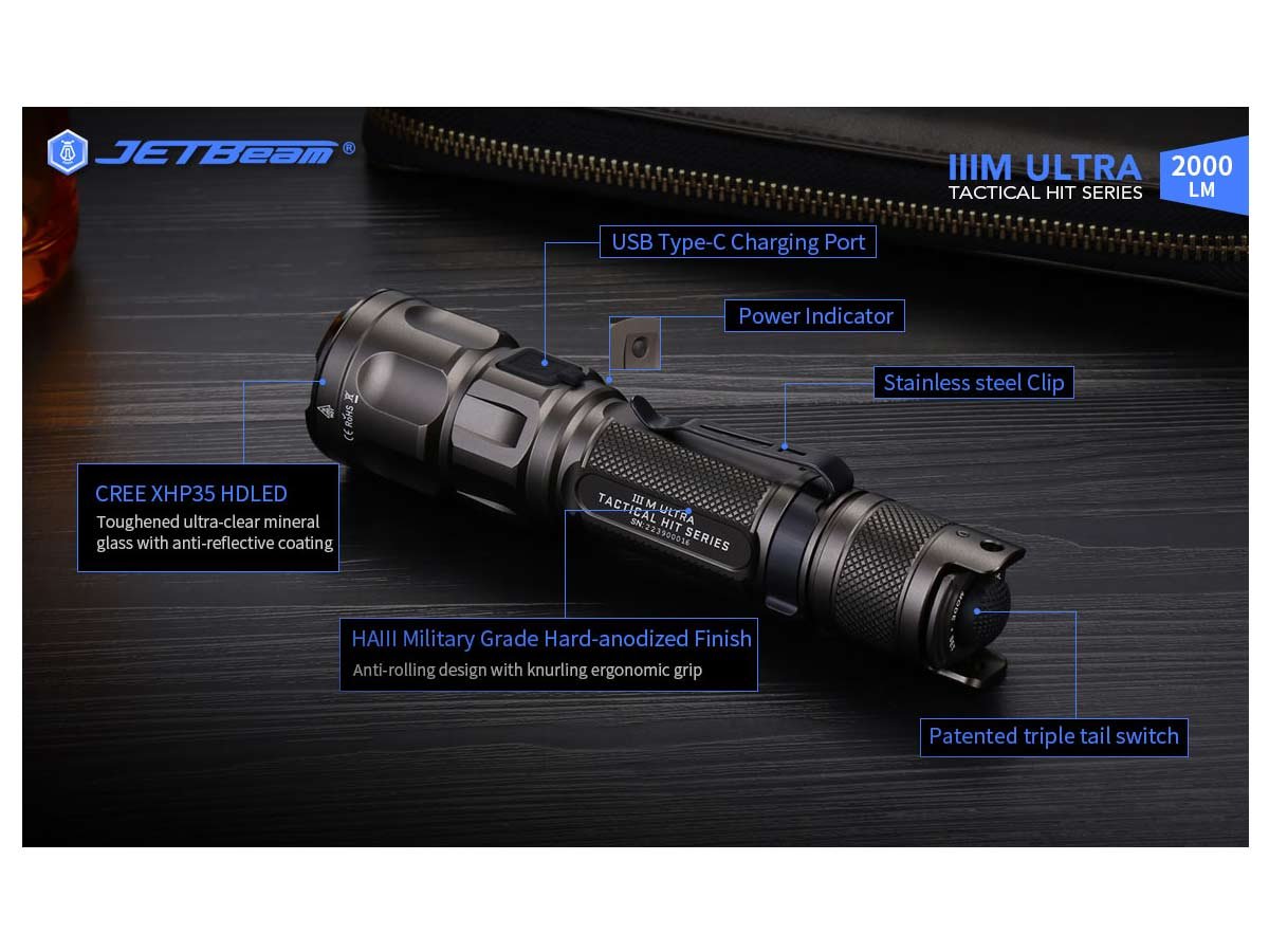 Jetbeam IIIM-ULTRA USB-C Rechargeable LED Flashlight - CREE XHP35 HD - 2000 Lumens - Includes 1 x 18650