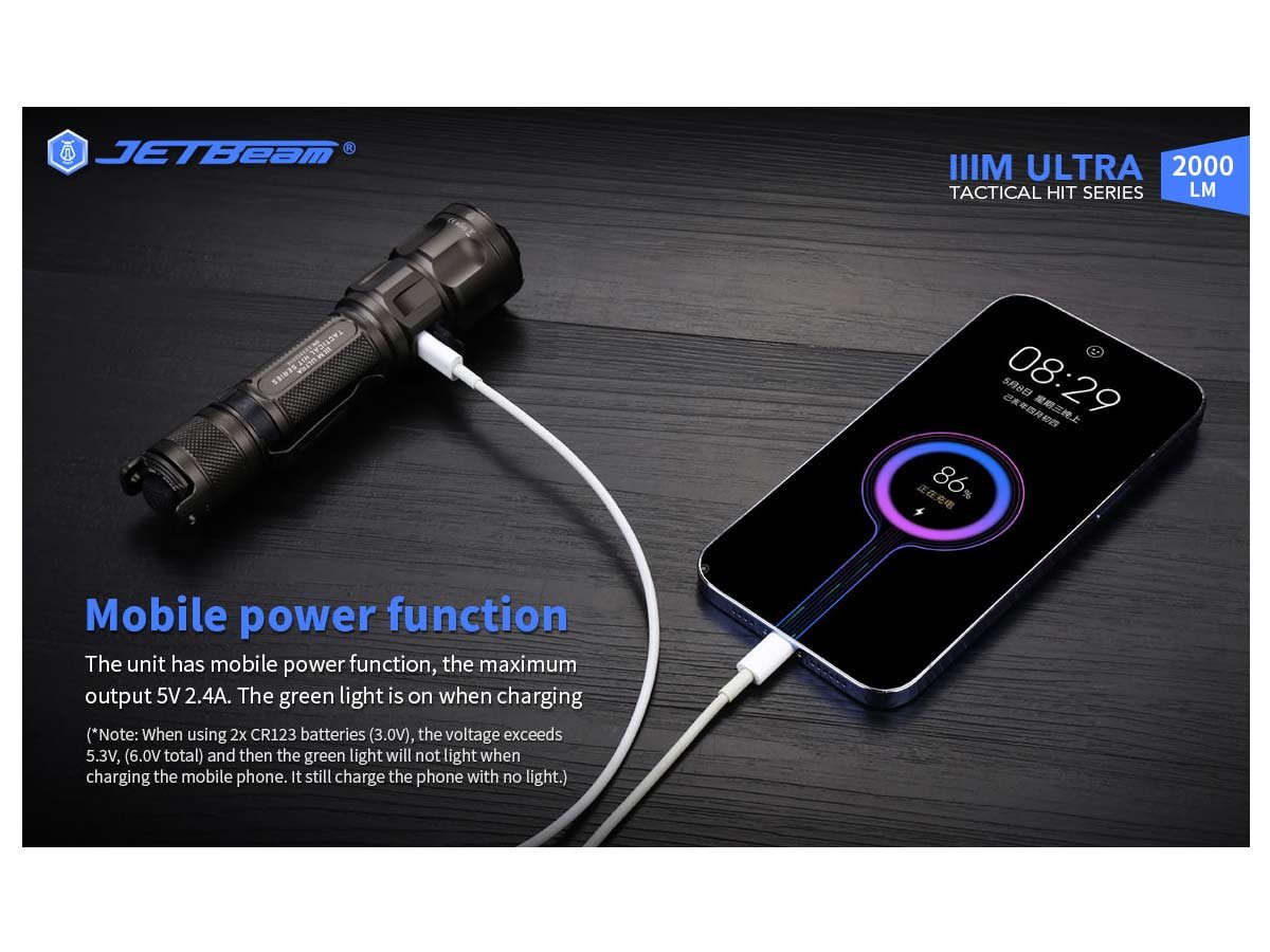 The IIIM-ULTRA is in a breed of innovative flashlights that has made the light double as a functional power bank. By simply connecting a device — for example, a smartphone — to the flashlight's USB-C port, it will output power to recharge the device. With the power bank addition, you gain a new level of preparedness in the field by having the JETBeam IIIM-ULTRA on hand.
