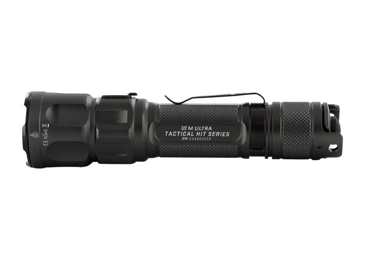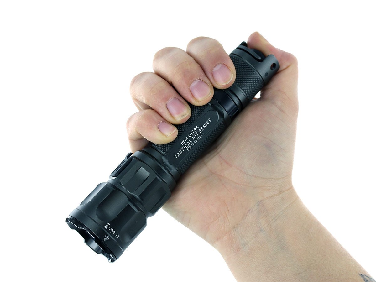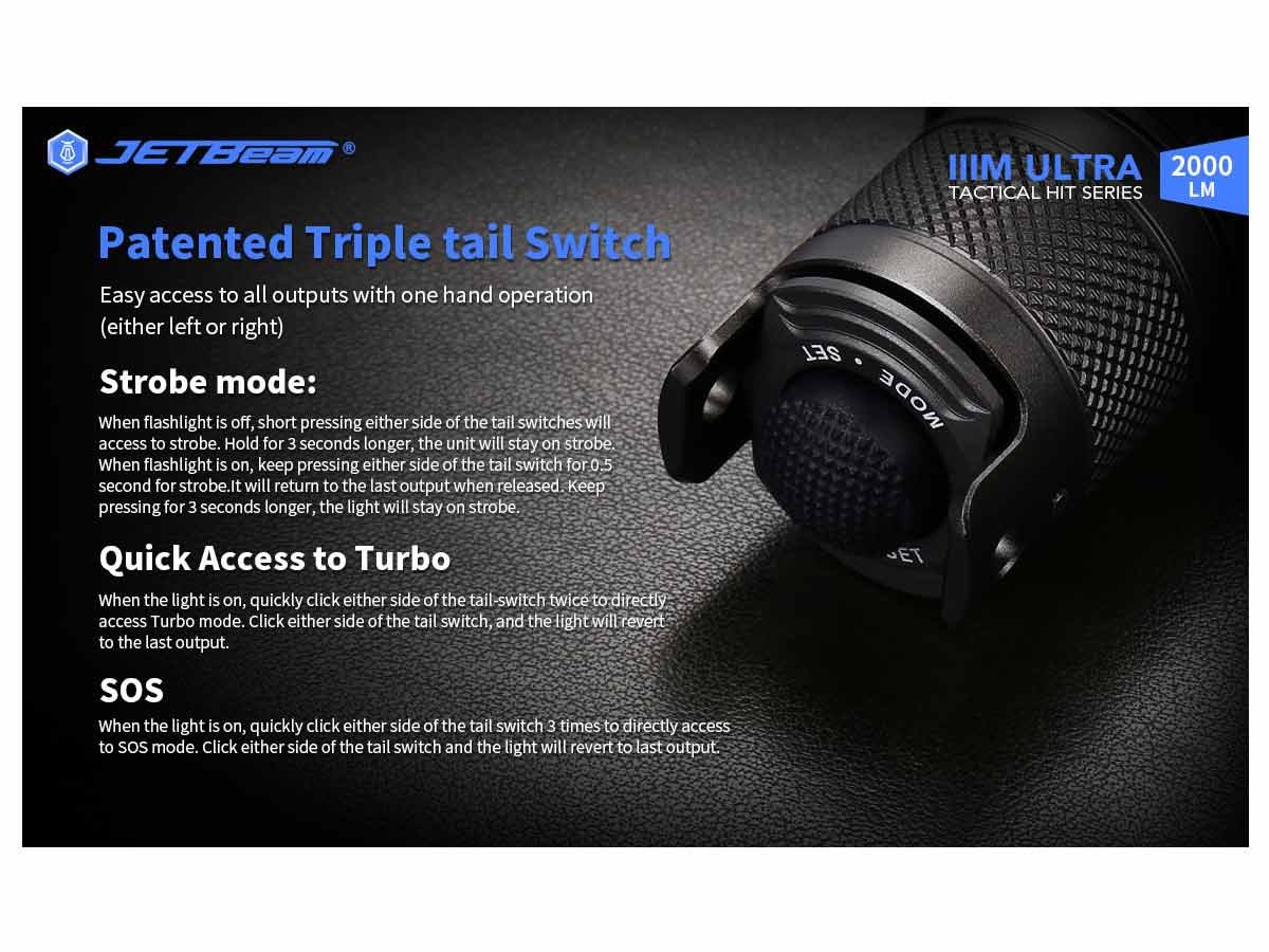 Control of the IIIM Ultra is placed in a patented triple switch system on the tailcap. This configuration enables quick mode retrieval in a heartbeat or less, also encouraging a one-handed tactical overhand grip style. Since the system has mode-setting tabs on both sides of the clickswitch, left- and right-handed users alike have the same level of command operating the IIIM-ULTRA.