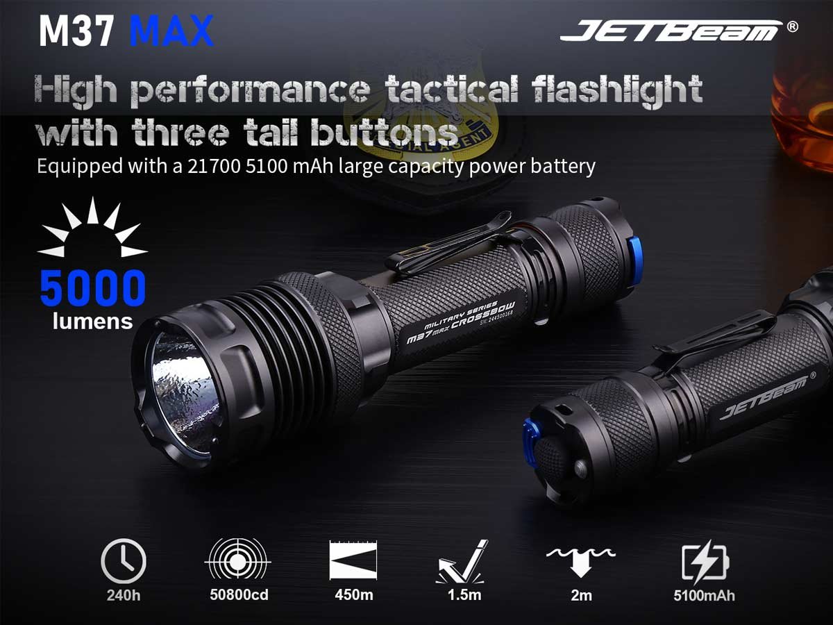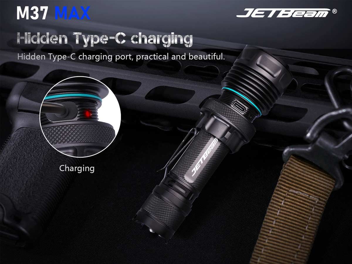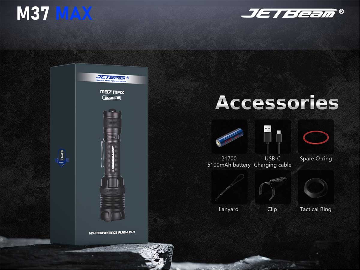 JETBeam M37 Max USB-C Rechargeable LED Flashlight - 5000 Lumens - CREE XHP70.3 HI - Includes 1 x 21700