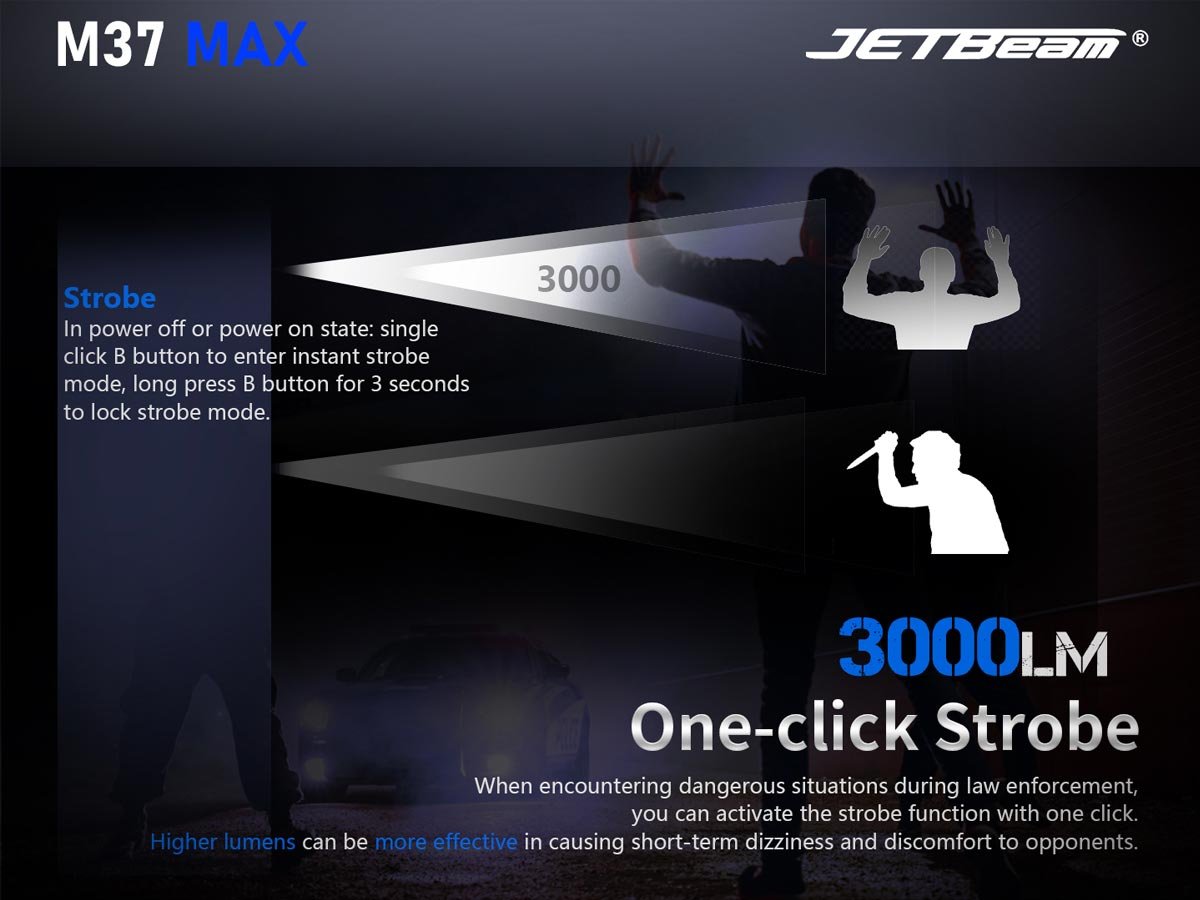 The JETBeam M37 Max is ready for action! With a refined CREE HXP70.3 HI LED, it reaches a Turbo output of 5,000 lumens and cuts through darkness up to 1,476 feet! Whether you're on a high-stakes mission, saving lives in search-and-rescue ops, or patrolling the streets, having a bright output like that takes your journey to the next level. With strobe and SOS output selection, you're covered in emergencies on patrol or elsewhere.