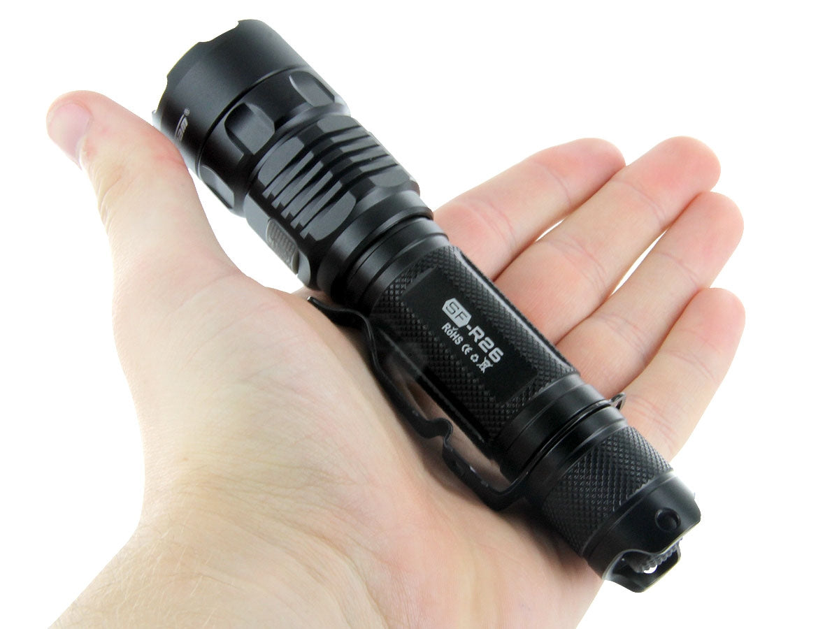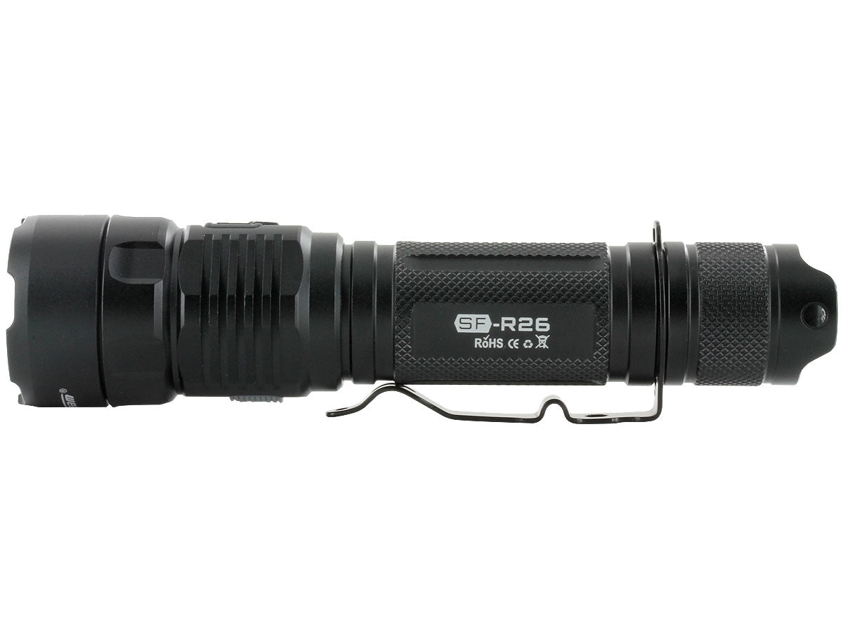 Crafted with military level quality and designed to fit a wide range of lighting needs, the JETBeam SF-R26 Rechargeable LED Flashlight is a high-performance torch perfect for just about any user. Armed with a state-of-the-art CREE XP-L HI LED, this potent illuminator is capable of generating up to 1200 lumens of stunning white light that can reach over 1200 feet away (that's over 4 football fields). In addition to its highest output, the JETBeam SF-R26 rechargeable light also features three dimmer outputs more suitable for close to mid-range lighting, ranging from 250 lumens down to 10 lumens, and even comes with a special Strobe output that can be used to disorient an attacker.