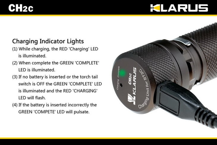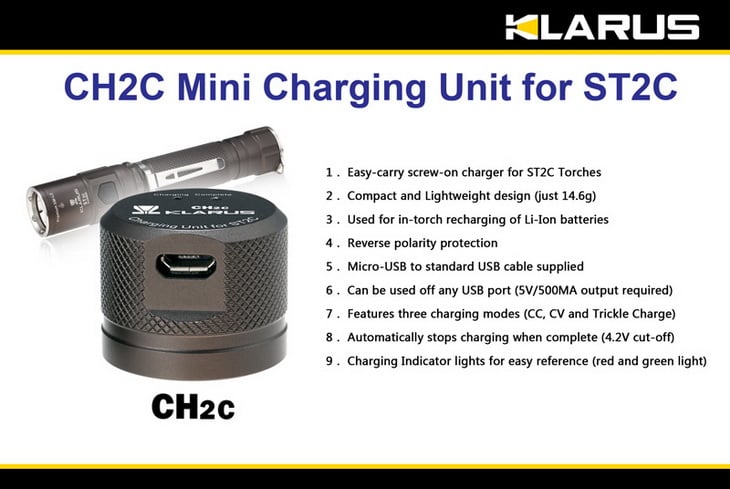 Klarus is at it again bringing you an extended USB Mini Charger for the ST2C flashlight. This compact and lightweight charger screws on easily and directly replaces the head of the ST2C. Used for in-torch recharging of the Li-Ion batteries using any USB port (5V/500MA output required). This amazing accessory features three different charging modes (CC, CV and Trickle Charge), the charger automatically stops charging when complete. Charging indicator lights are located at the top to ensure easy reference.Features:
