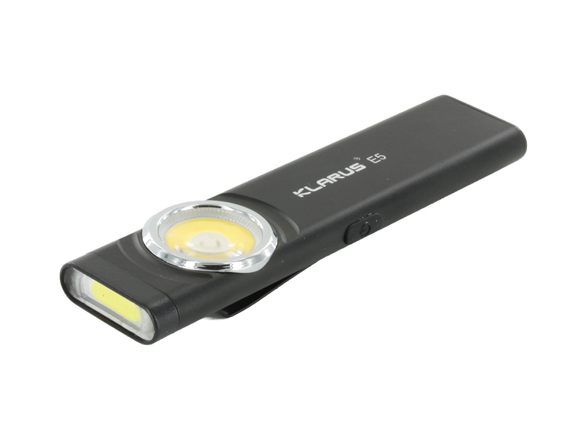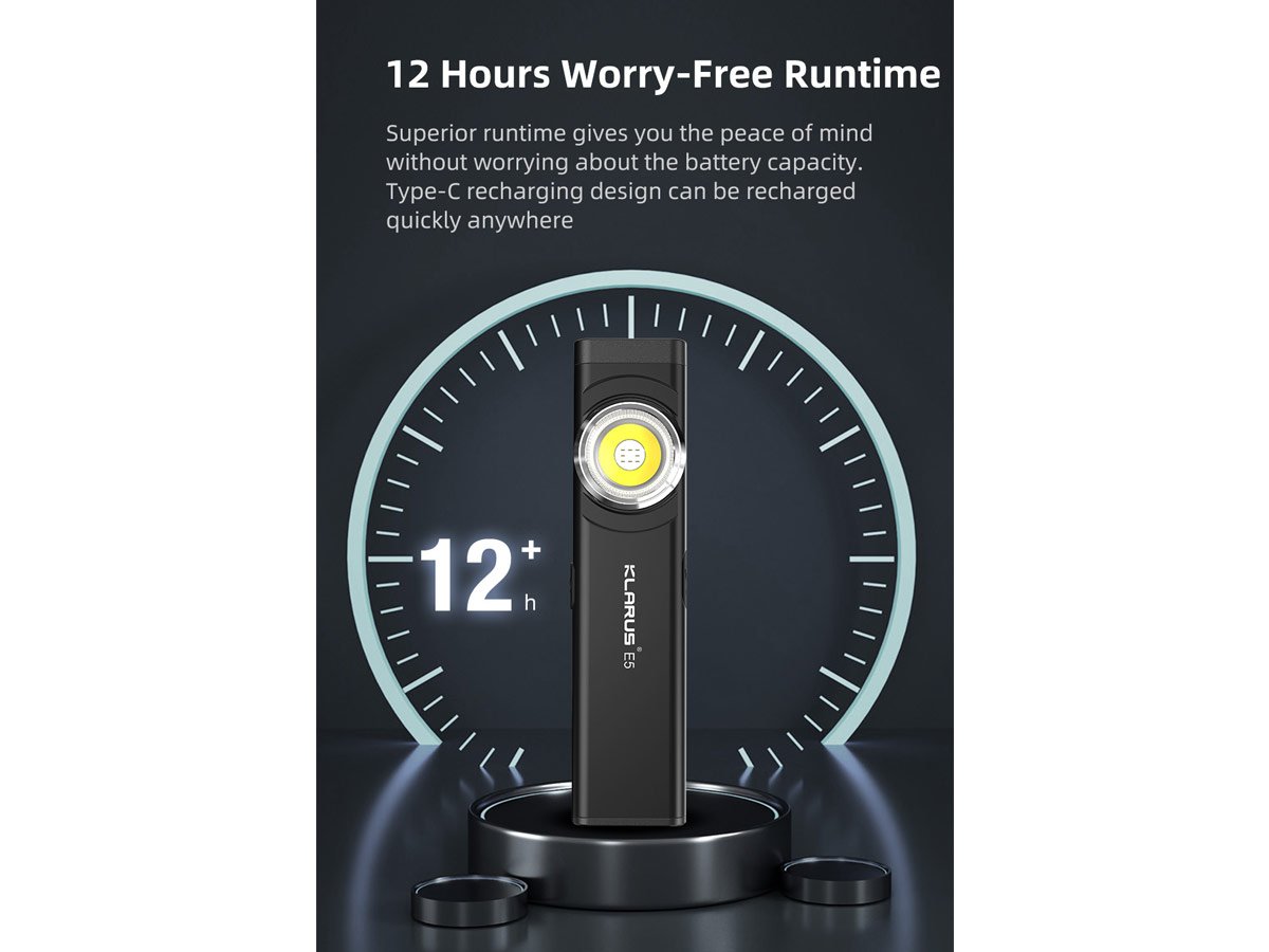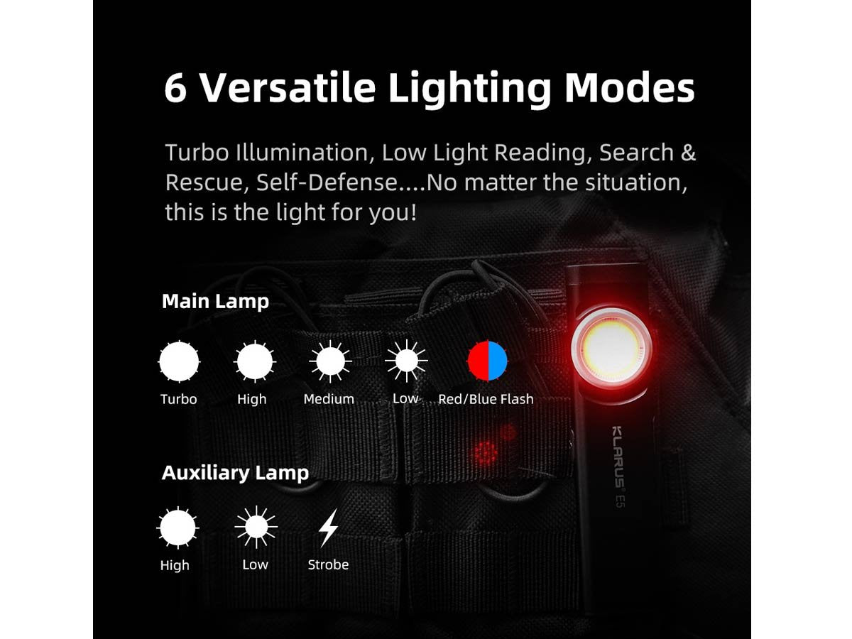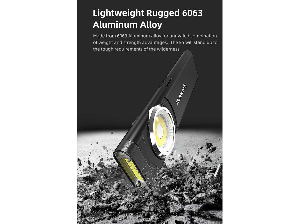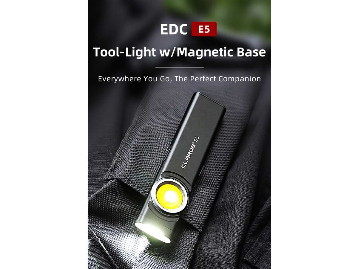If you're looking for a new light that can fulfill your EDC and work needs, then pick up the Klarus E5! Its main side COB LED is designed with a maximum output of 600 lumens in a 98ft beam, great for DIY household projects, car repairs, and more. Through the secondary LED, this light offers efficient close-range visibility that runs for up to 12 hours, perfect for late-night hikes and navigation. The E5's red and blue strobe mode generates clear, effective location signaling to fellow campers from a distance or during an emergency.