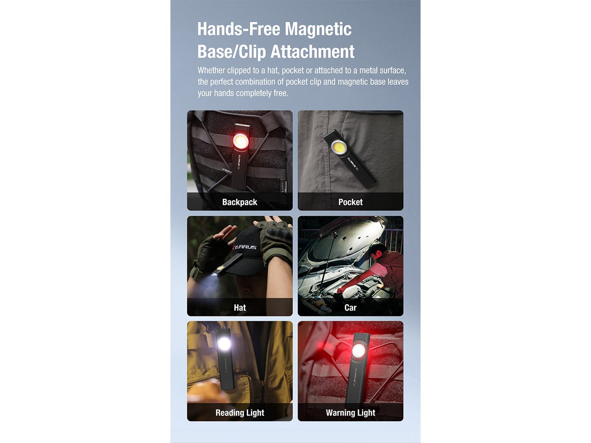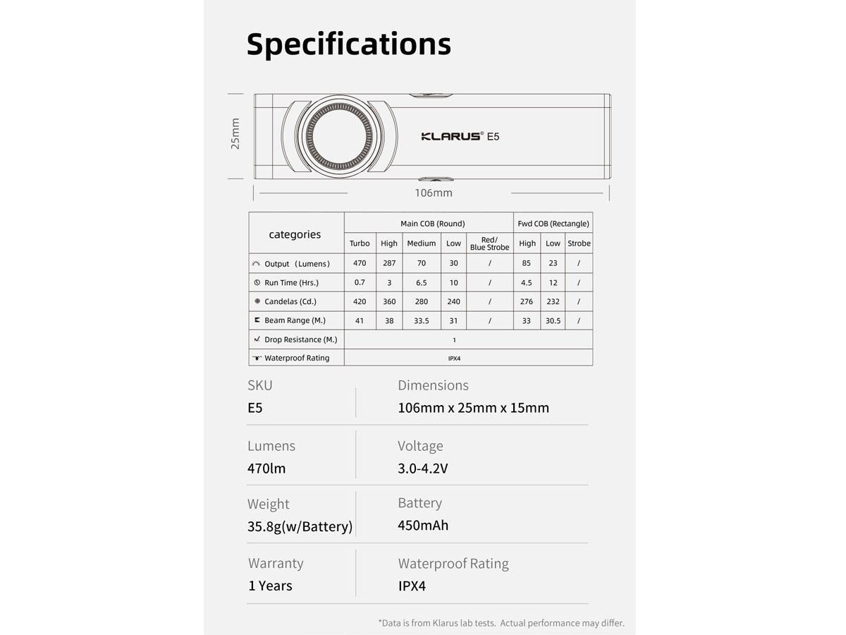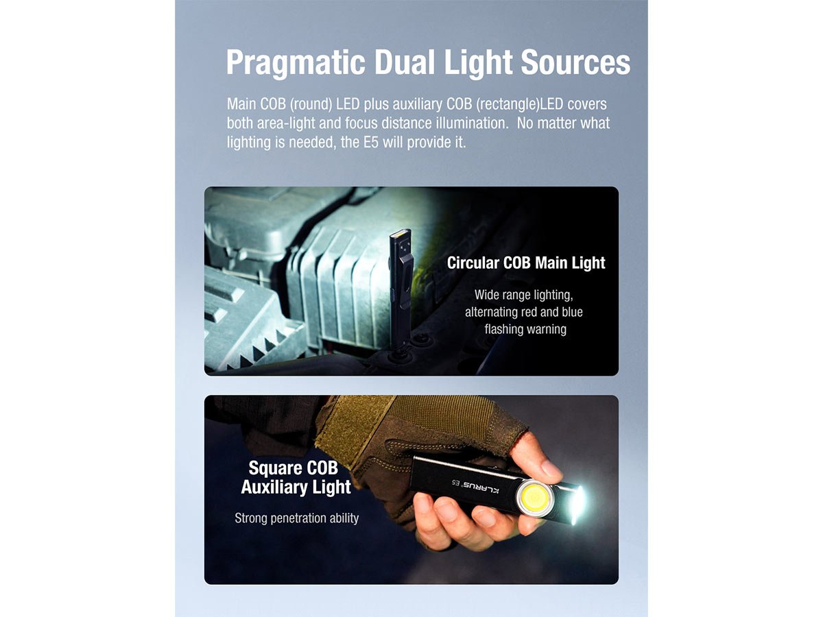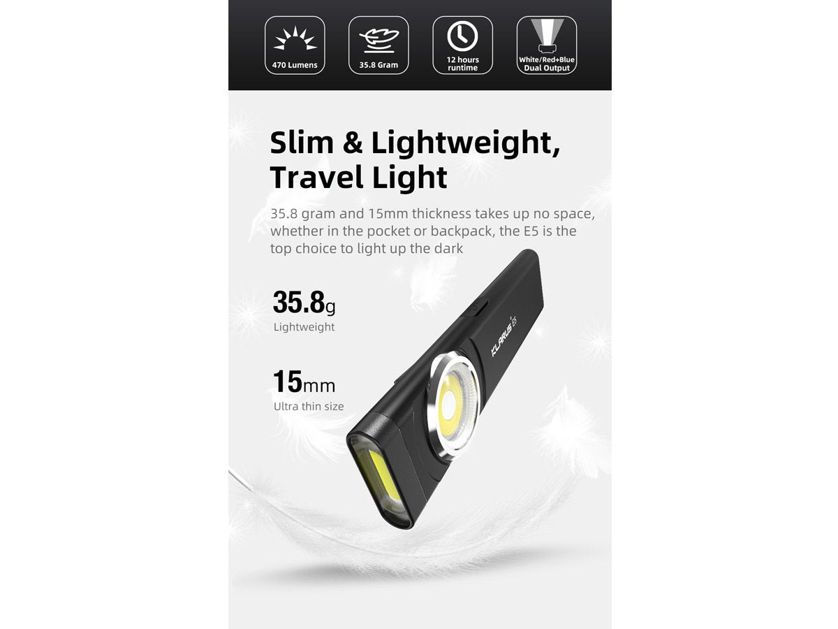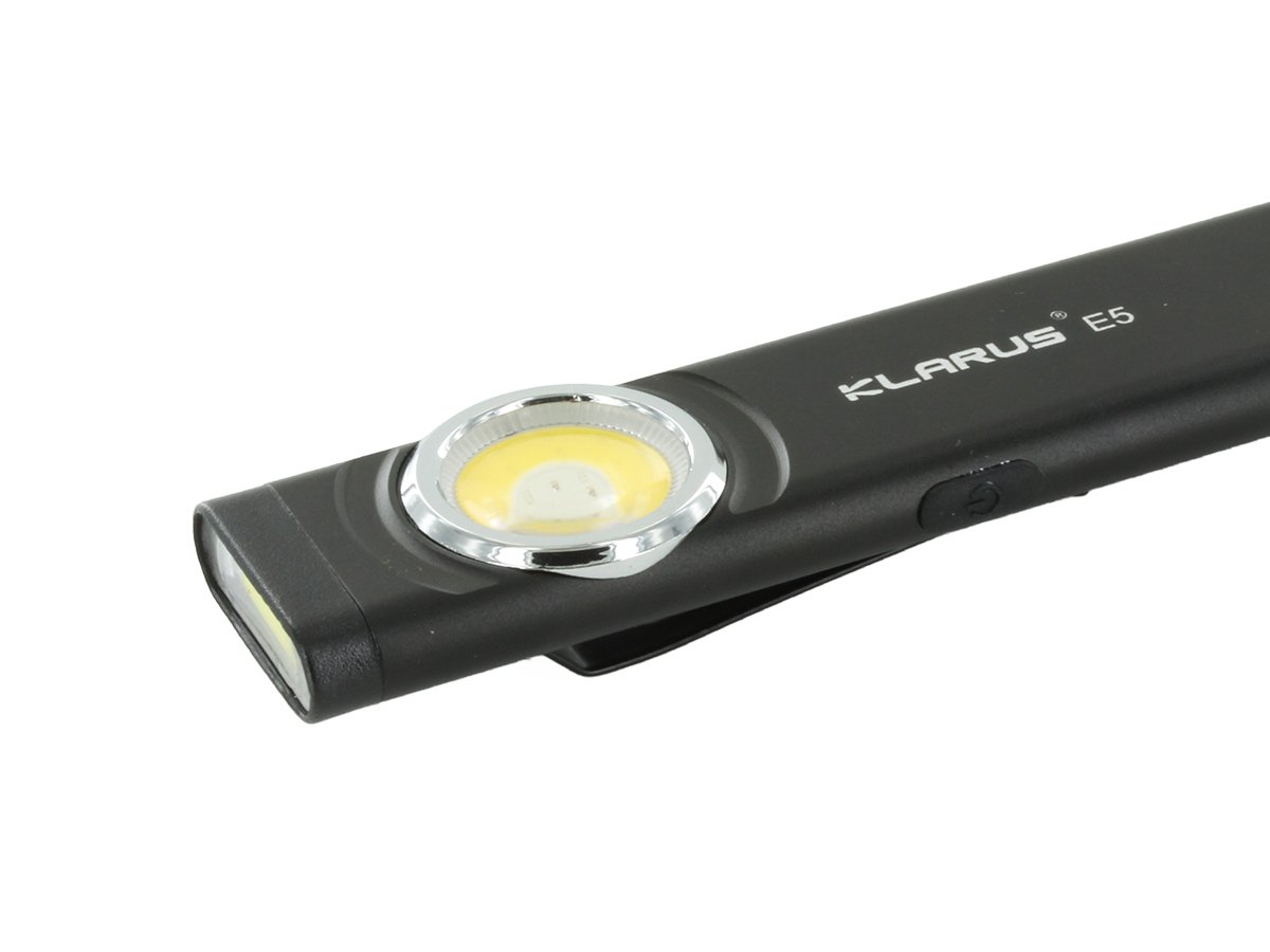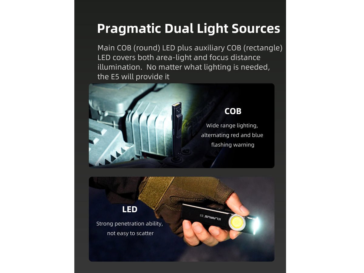 If you're looking for a new light that can fulfill your EDC and work needs, then pick up the Klarus E5! Its main side COB LED is designed with a maximum output of 600 lumens in a 98ft beam, great for DIY household projects, car repairs, and more. Through the secondary LED, this light offers efficient close-range visibility that runs for up to 12 hours, perfect for late-night hikes and navigation. The E5's red and blue strobe mode generates clear, effective location signaling to fellow campers from a distance or during an emergency.