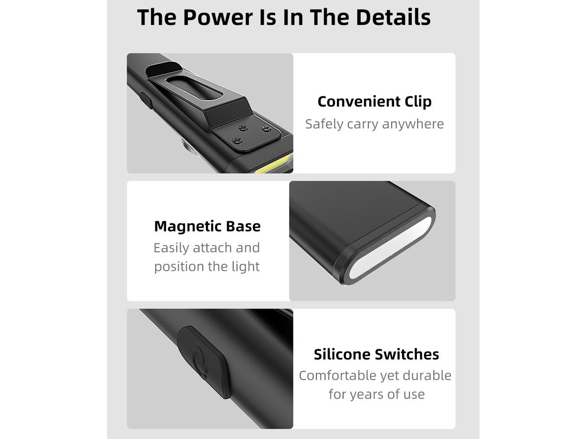 The E5's clip makes it a great right-angle flashlight for odd jobs at home or stable lighting at work. It also lets this light act as a backup headlamp by attaching it to the brim of your hat. The magnetic tail enables even more hands-free lighting options, such as attaching it to your car hood while working on the engine. These features also provide storage and portability options to prevent it from falling in any environment. With its USB-C port, you can charge from outlets, power banks, and other devices, ensuring you can always recharge everywhere you go.