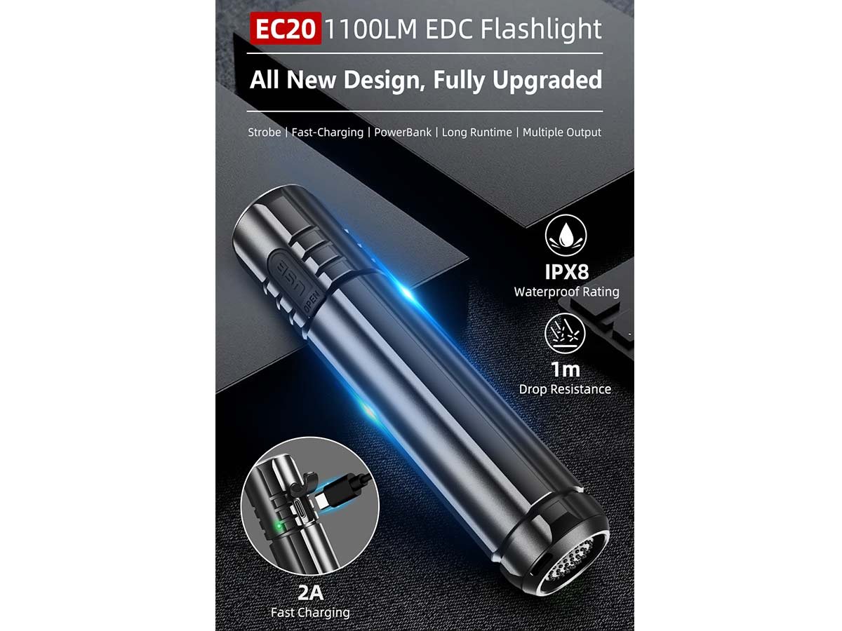 Klarus EC20 USB-C Rechargeable LED Flashlight - Luminus SST-20-WCS - 1100 Lumens - Includes 1 x 21700 - With or Without Power Bank Function