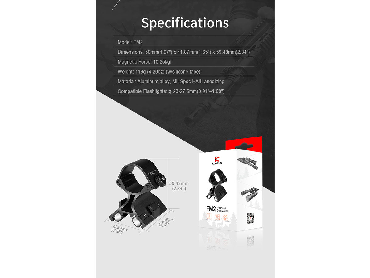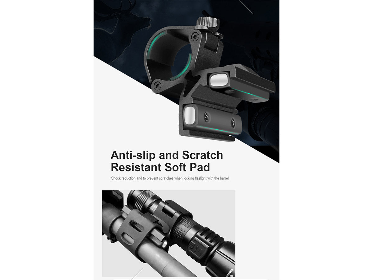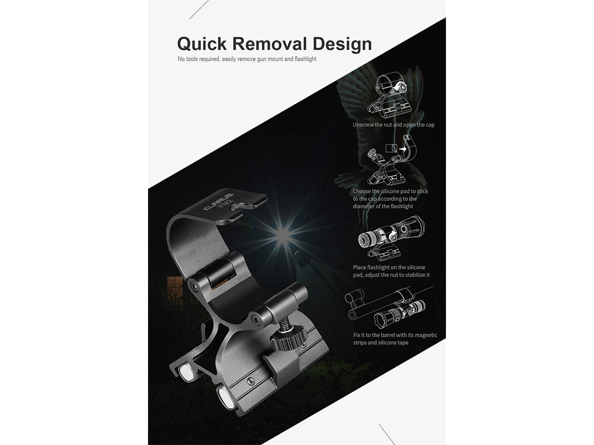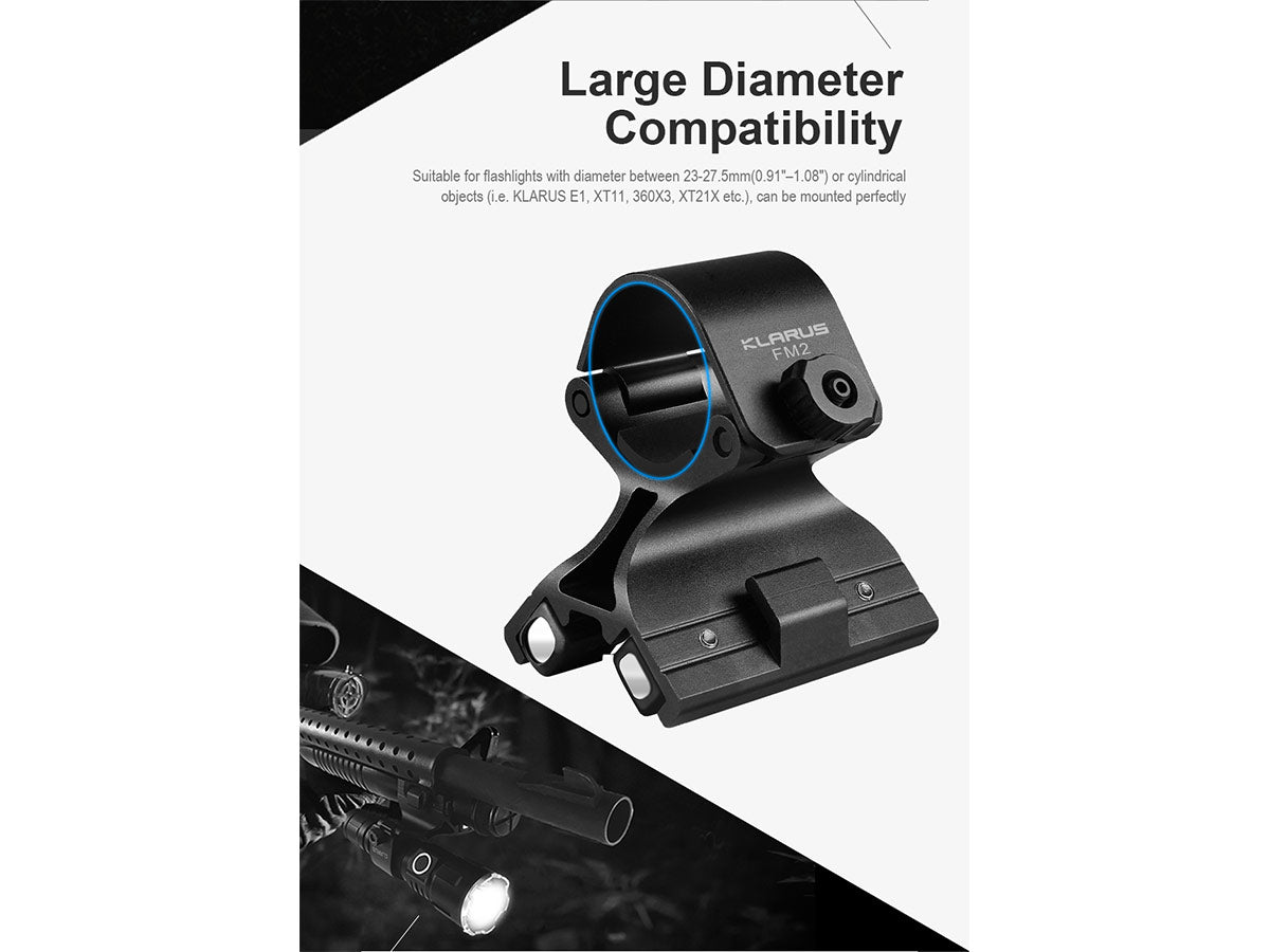 The Klarus FM2 Weapon Mount is a simple but sturdy way to attach your favorite compatible flashlight to the barrel of your weapon. This accessory provides you with a tool-free way to quickly install flashlights with diameters ranging from 0.91" to 1.08" with three simple steps and the turn of a nut. The anti-slip design and scratch-resistant pad absorb shock and prevent accidental scratches during mounting.