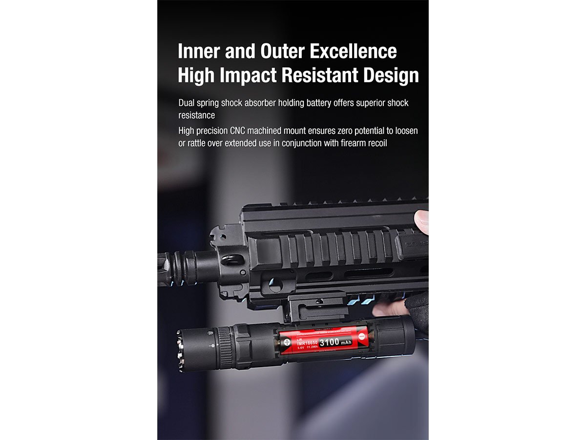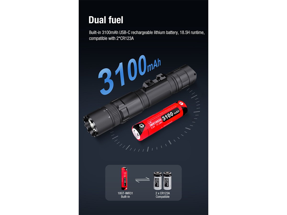 - Use included 18650 or 2 x CR123As for dual-fuel options