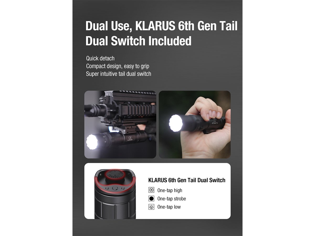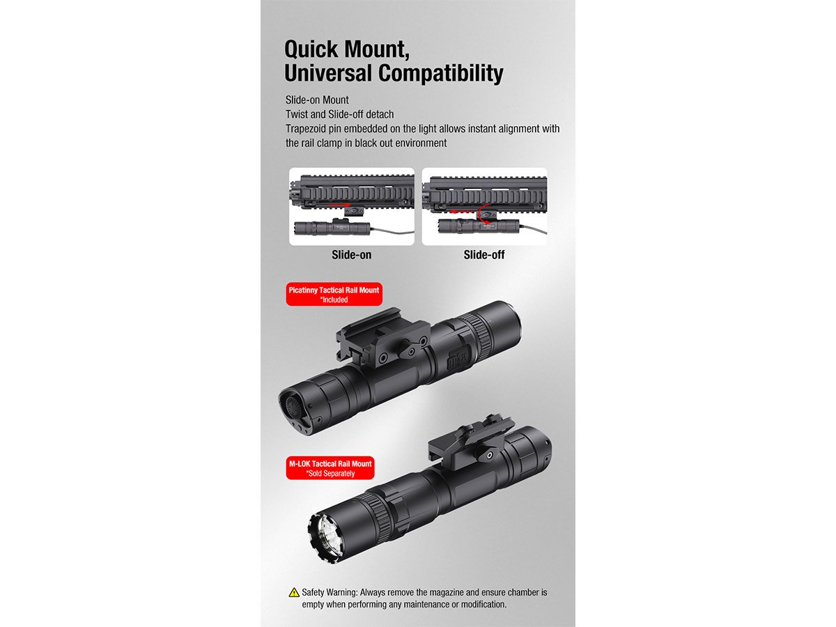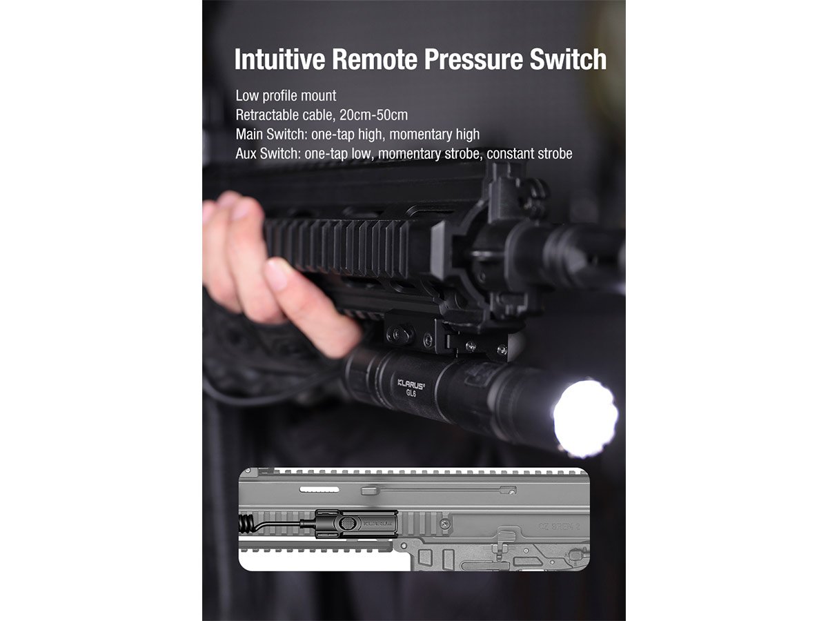 This light includes a Picatinny rail mount but is also compatible with an M-LOK rail mount, sold separately. It has a slide-on mount, with the ability to detach by twisting and sliding off your weapon. This way, you can easily use the GL6 as a tactical light and take advantage of its reliable 6th generation dual tail switch! For simple yet accurate alignment, adjust the trapezoid pin to your liking. Included in the package is a remote pressure switch, which controls all brightness modes plus a strobe in a flash.
