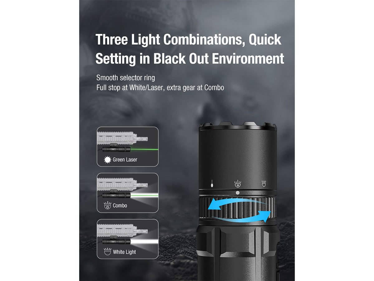 - » Green laser, white light, and combination output modes are available via smooth selector ring