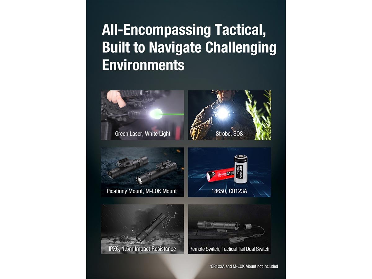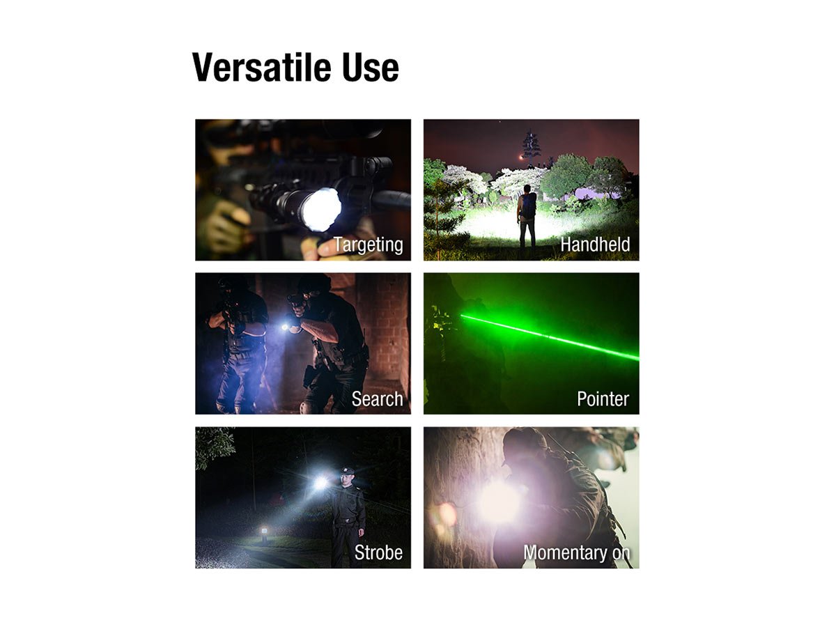 - Bright tactical performance - green laser & 1600-lumen/721ft beam