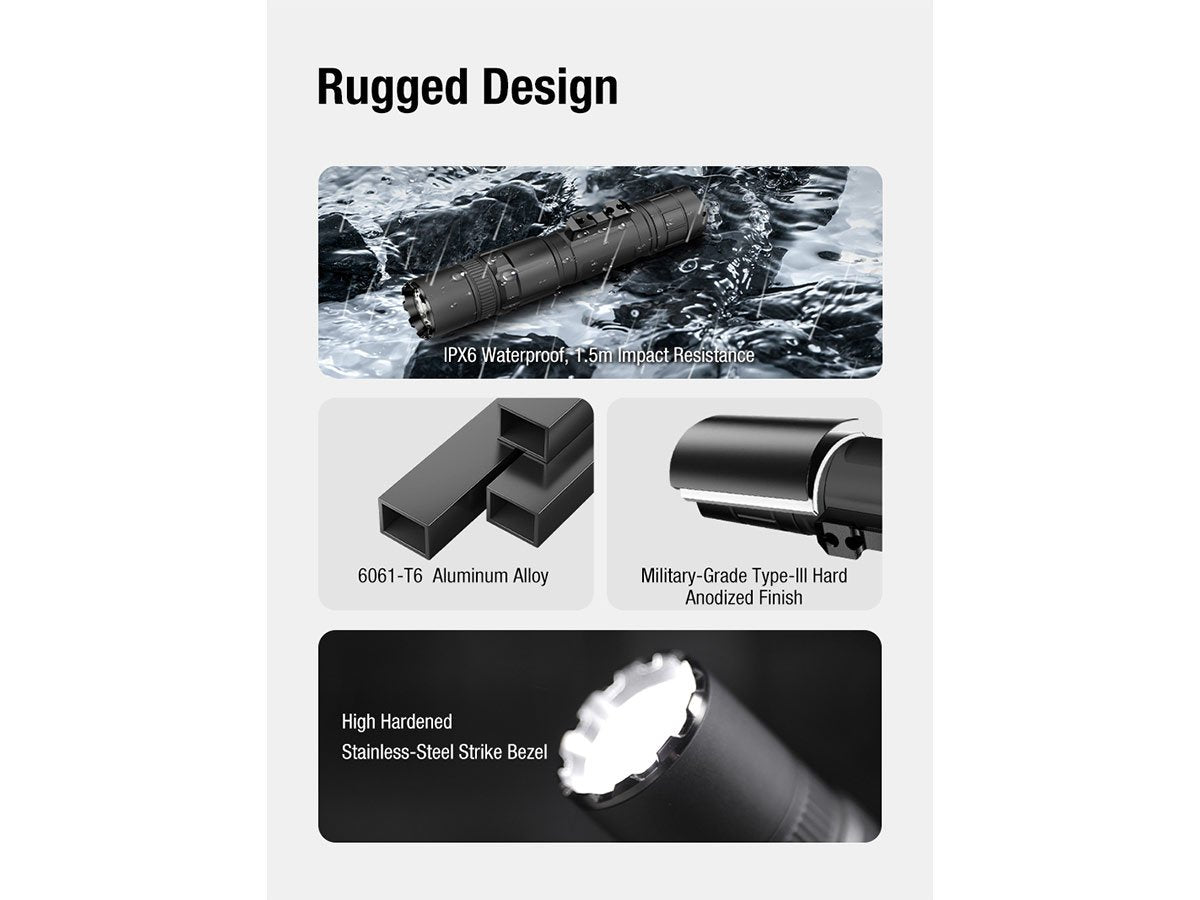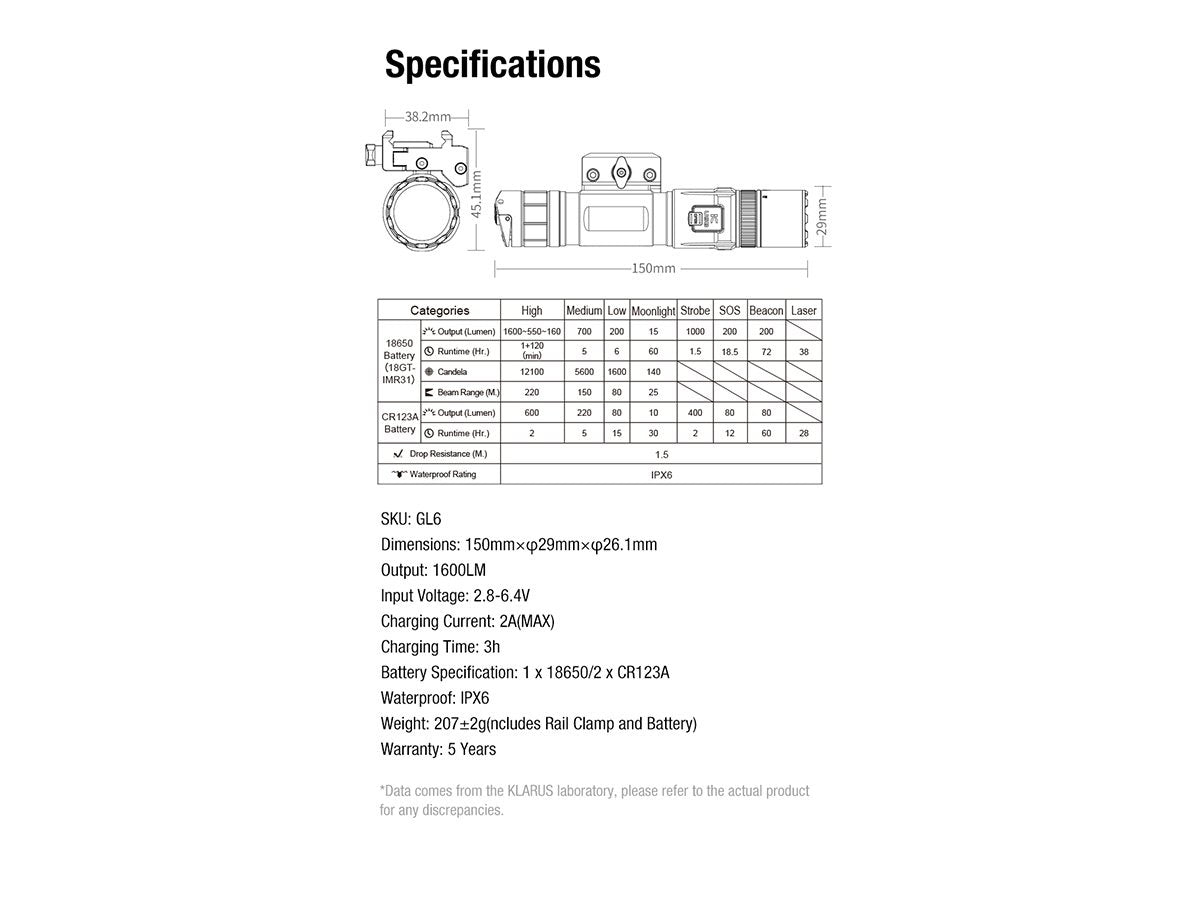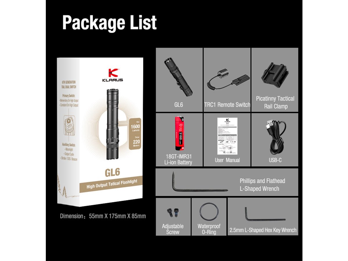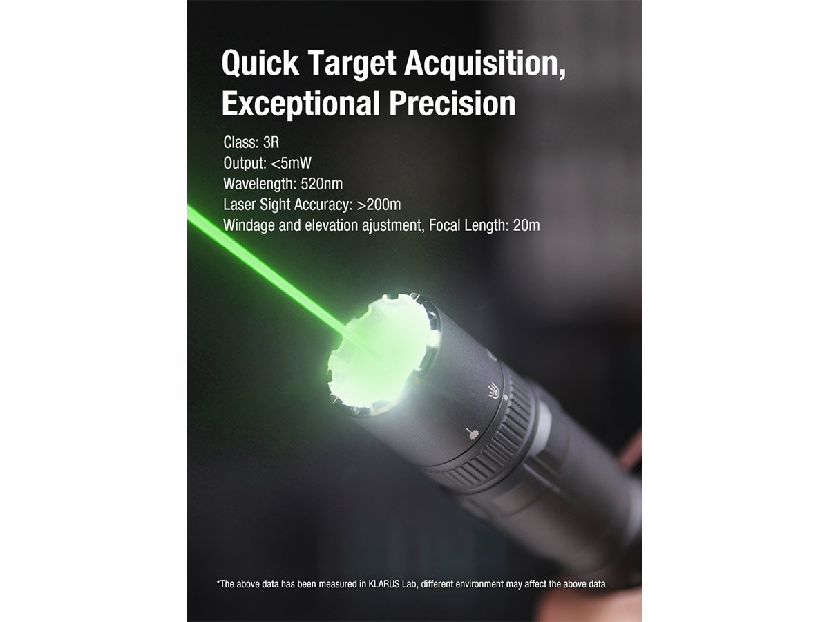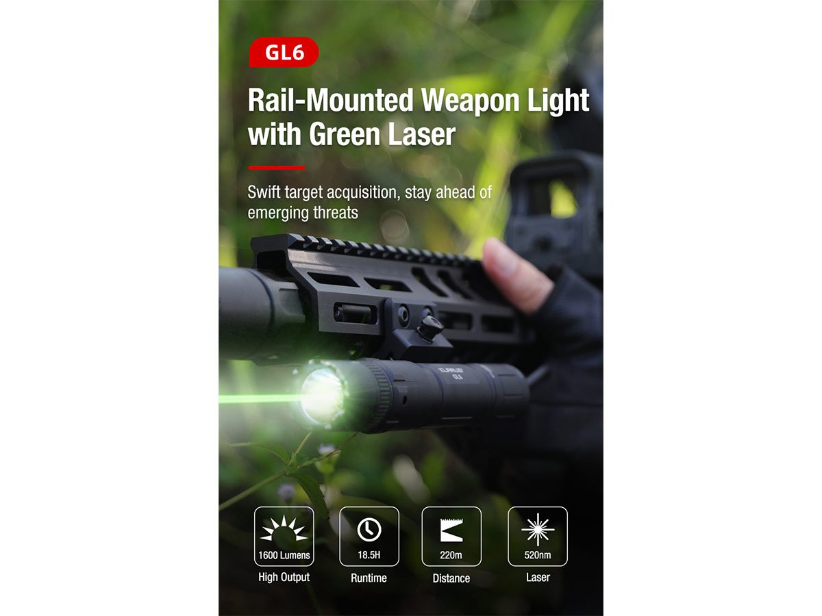 The Klarus GL6 puts you on top in tactical scenarios! The GL6 outputs a maximum of 1600 lumens out in the field, ensuring bright light in any tactical scenario. Emitting a 721-foot beam, have reliable spotting outdoors and find any vantage point. Utilizing a class 3R, 520nm green laser improves sight for law enforcement, hunting, or military operations. It has both strobe and SOS modes for emergency signaling and self-defense. The lockout mode accessible by triple-tapping the tailcap switch when light is off so you can prevent accidental activation.