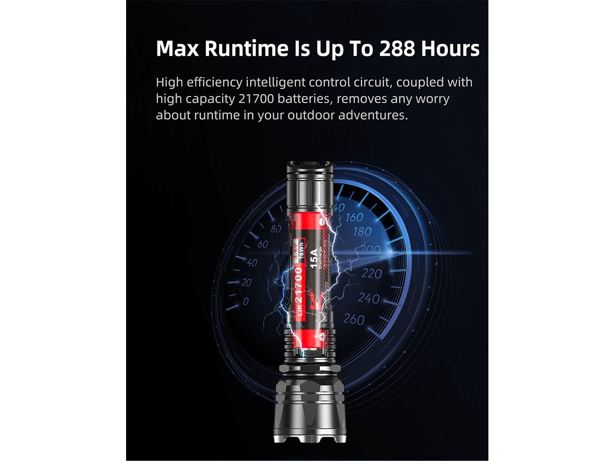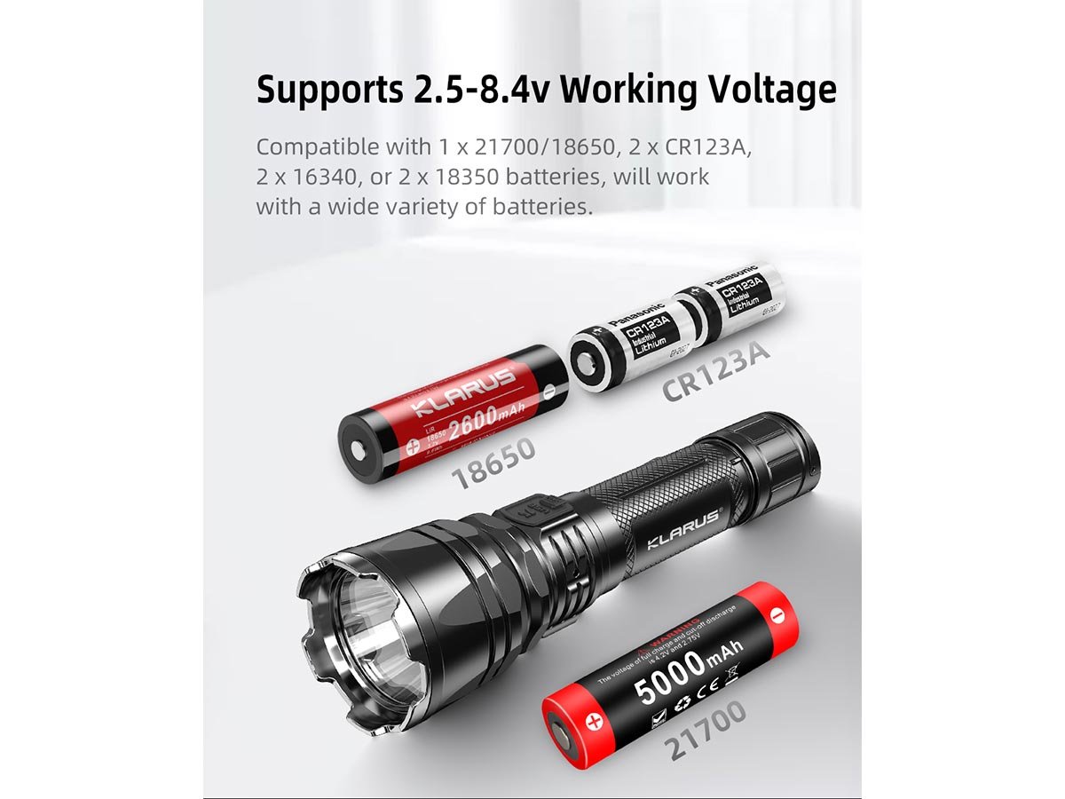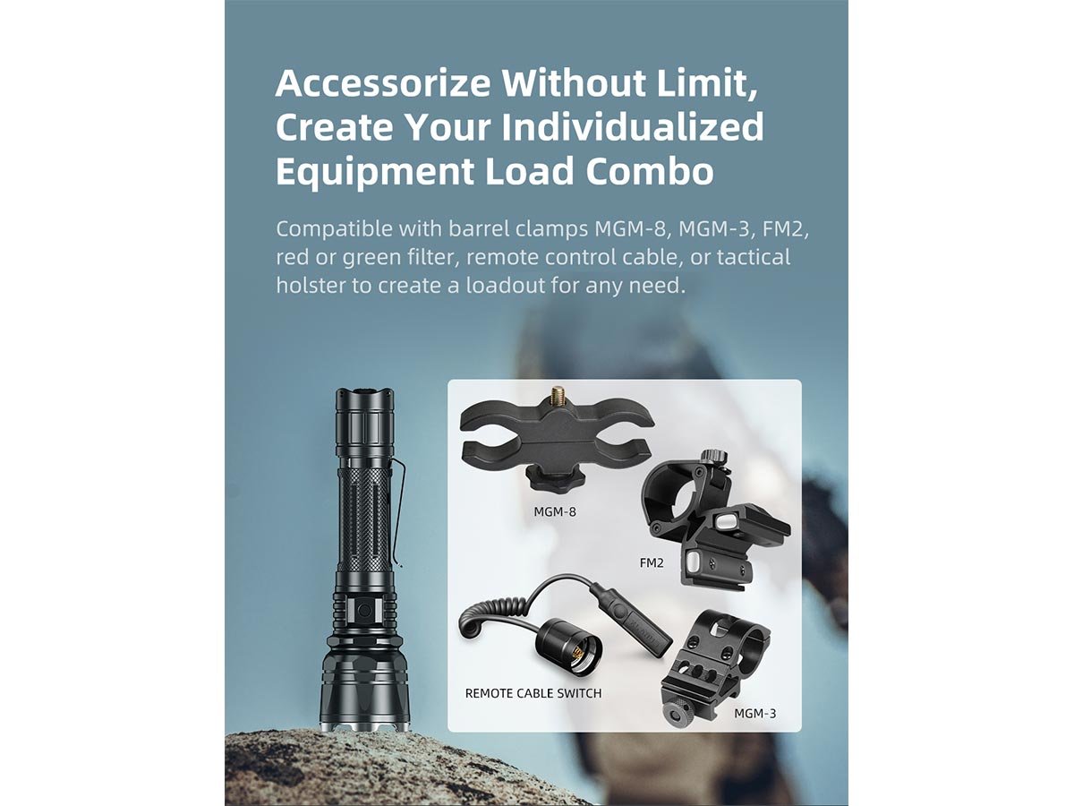 You'll have a wide range of fuel options because the XT12GT Pro supports a working voltage from 2.5 to 8.4V. This allows your choice of 1 x 21700 or 18650, or 2 x CR123As, 16340s, or 18350s. This flexibility in fuel choices allows you to power your light with whatever is on hand or available. Customize your light with ample compatible accessory options, including barrel clamps, red or green filters, remote control cable, or tactical holsters.