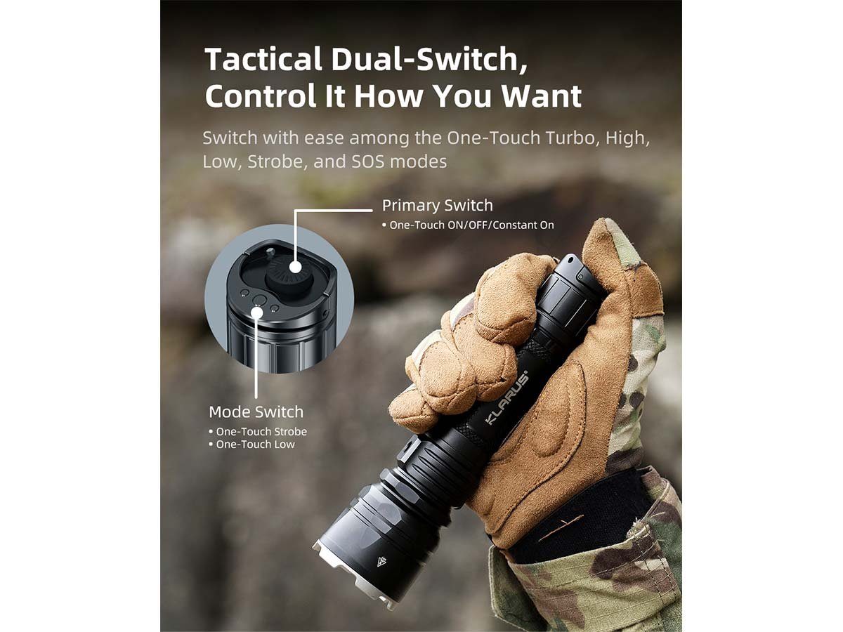 Blast through the night with the Klarus XT12GT Pro! Access up to 1,600 lumens in a refined beam that enables you to scour up to half a mile away. This light packs the punch you need for search and rescue missions, while still remaining lightweight and portable enough to use for Law Enforcement or everyday jobs. The XT12GT Pro features 2 mode-access settings, Tactical and Outdoor, to cater to your specific needs in a light. Tactical mode features quick access to Turbo and Strobe, enabling you to utilize these tools with speed and ease. Outdoor mode includes access to SOS in case you need to signal during emergencies.