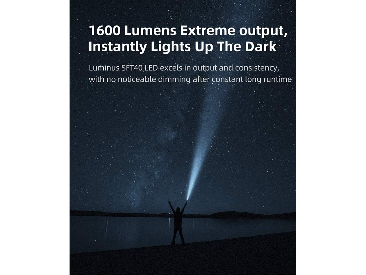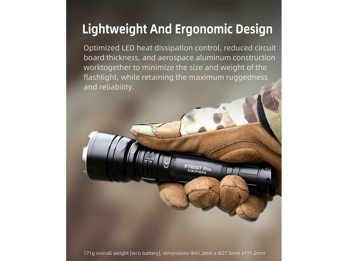 Reliably designed with a Luminus SFT40 LED so you can use your XT12GT Pro for extended runtimes without wavering in output or consistency. These optics are all backed up by a high-efficiency intelligent control circuit, so your XT12GT Pro can handle extreme use. This design keeps it functioning optimally for long work days or missions.