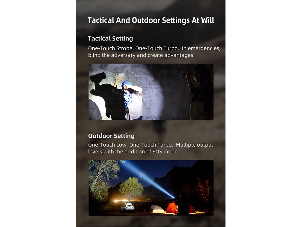 • Tactical or Outdoor modes customize access to Turbo, Strobe, and SOS